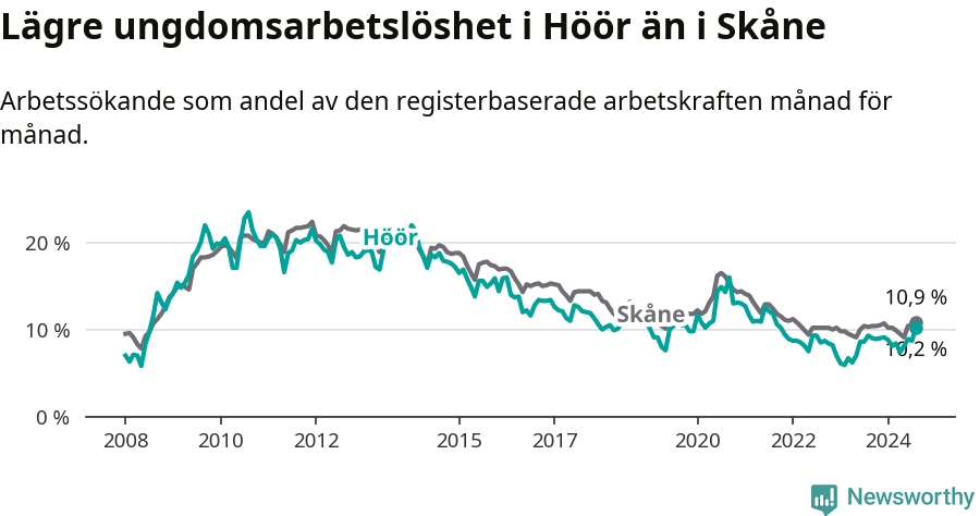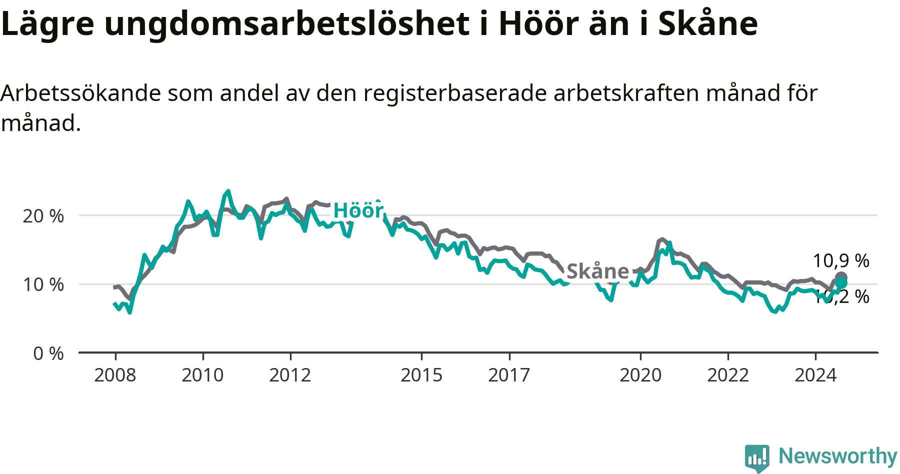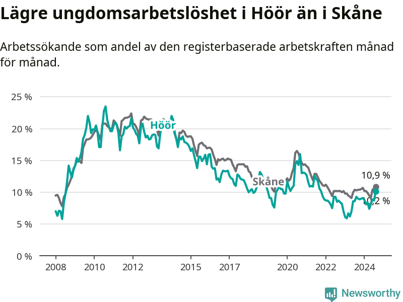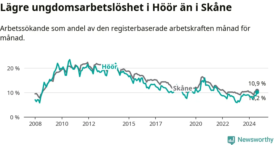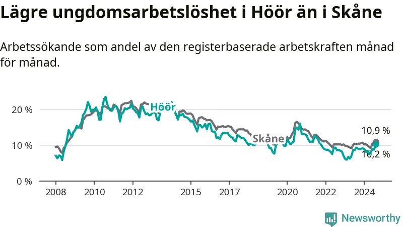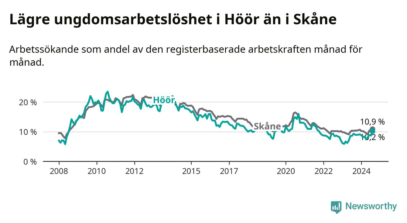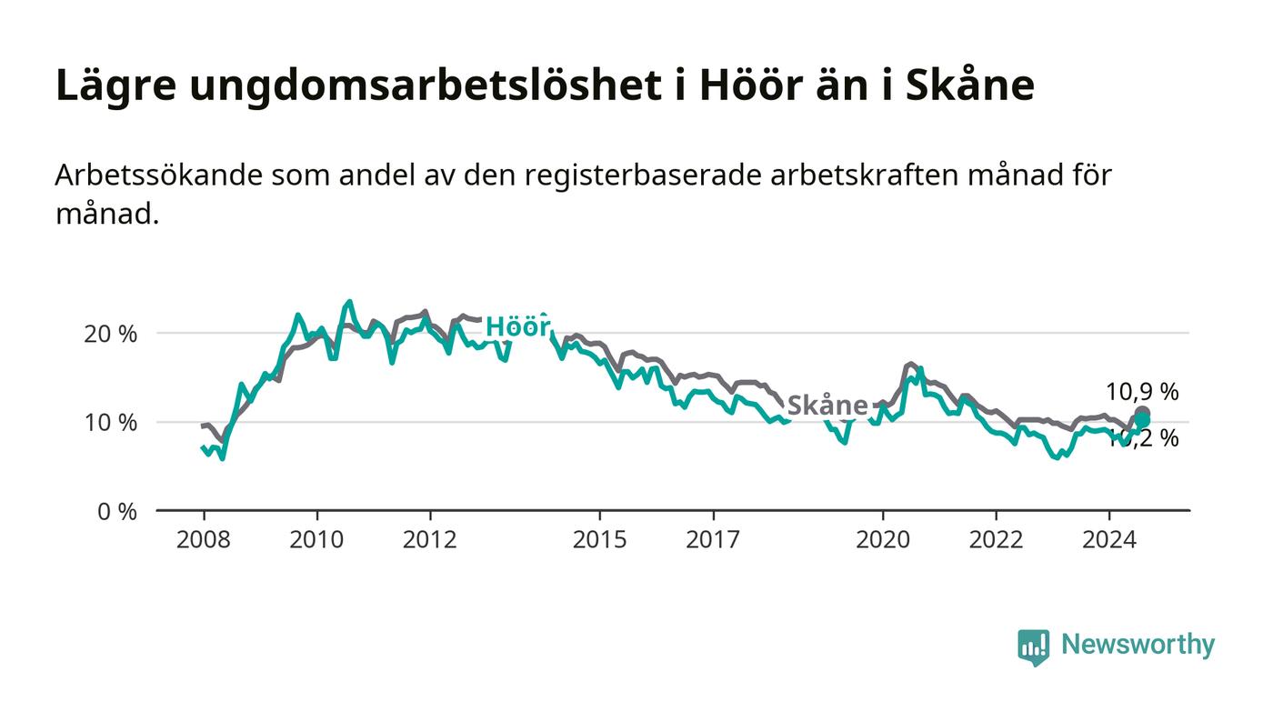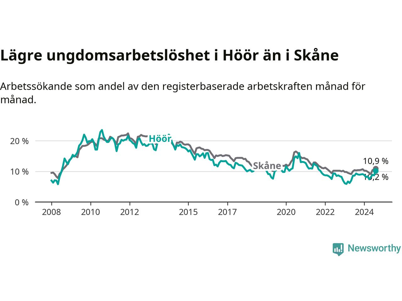 Precis som den totala arbetslösheten ligger ungdomsarbetslösheten i Höör lägre än i Skåne som helhet. Skillnaden mellan kommunen och länet är 0,7 procentenheter.