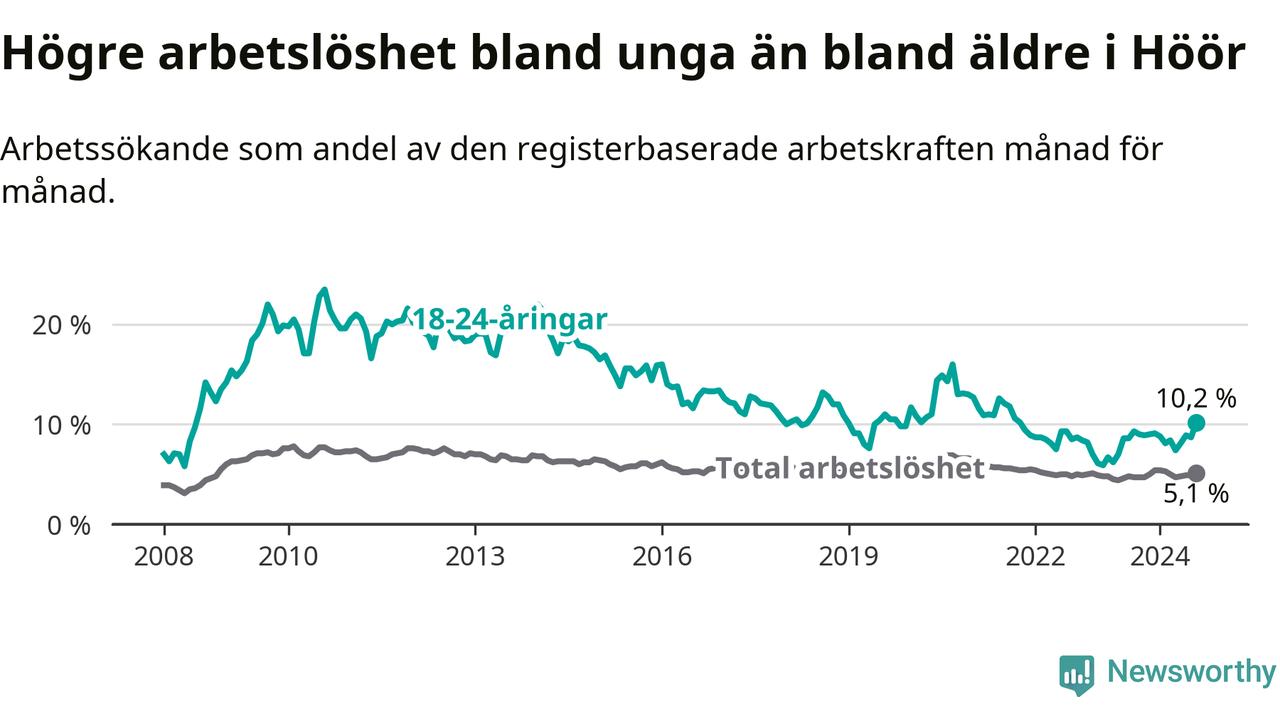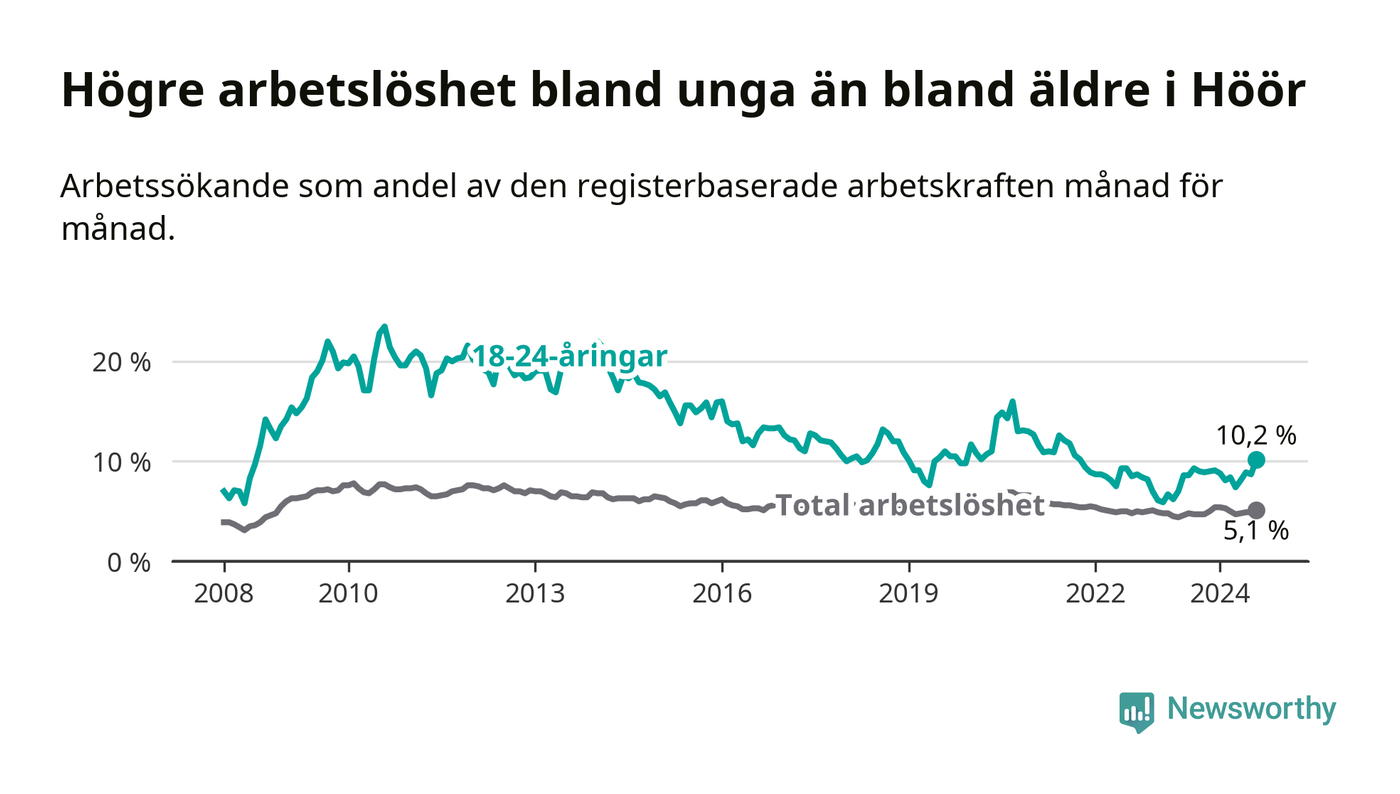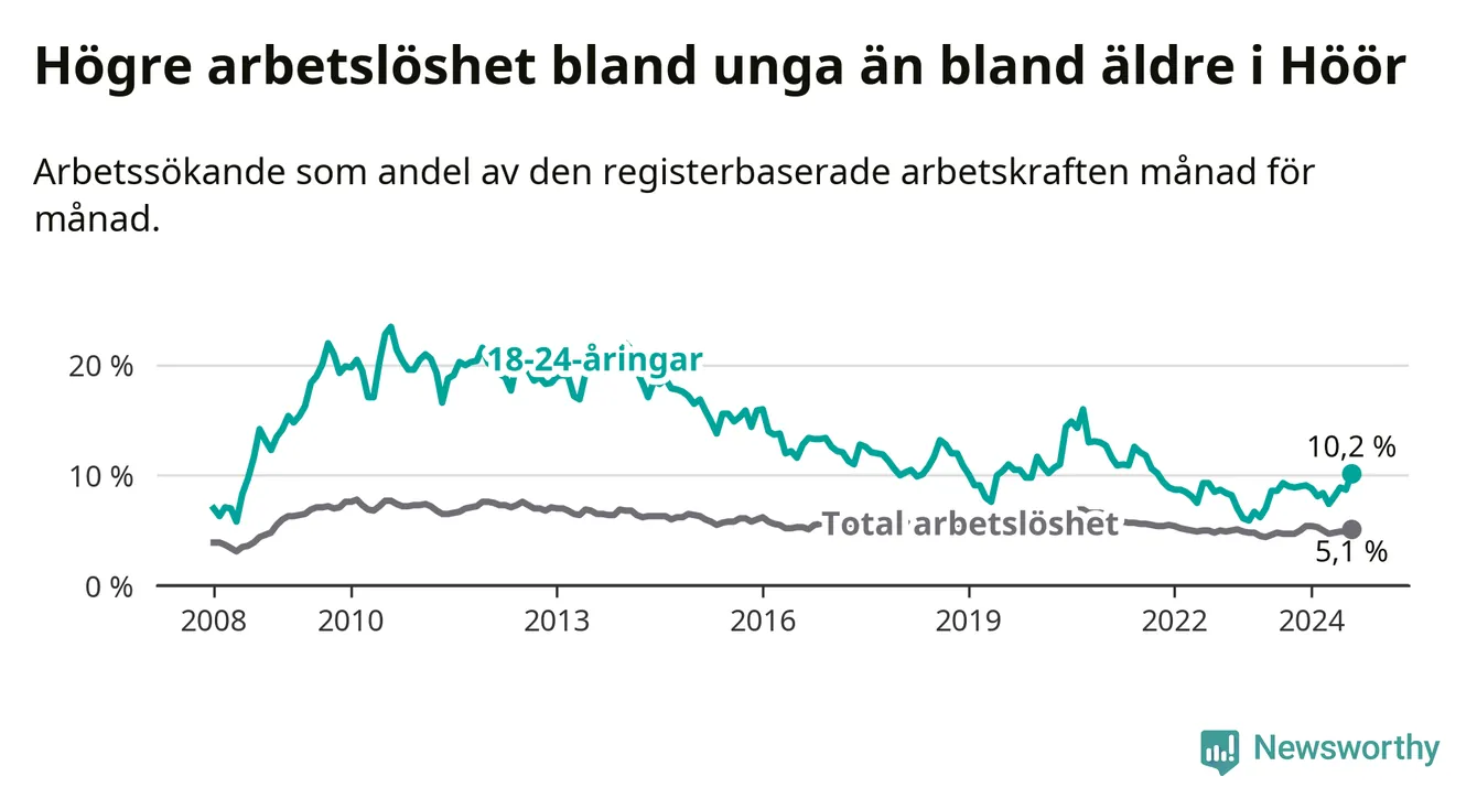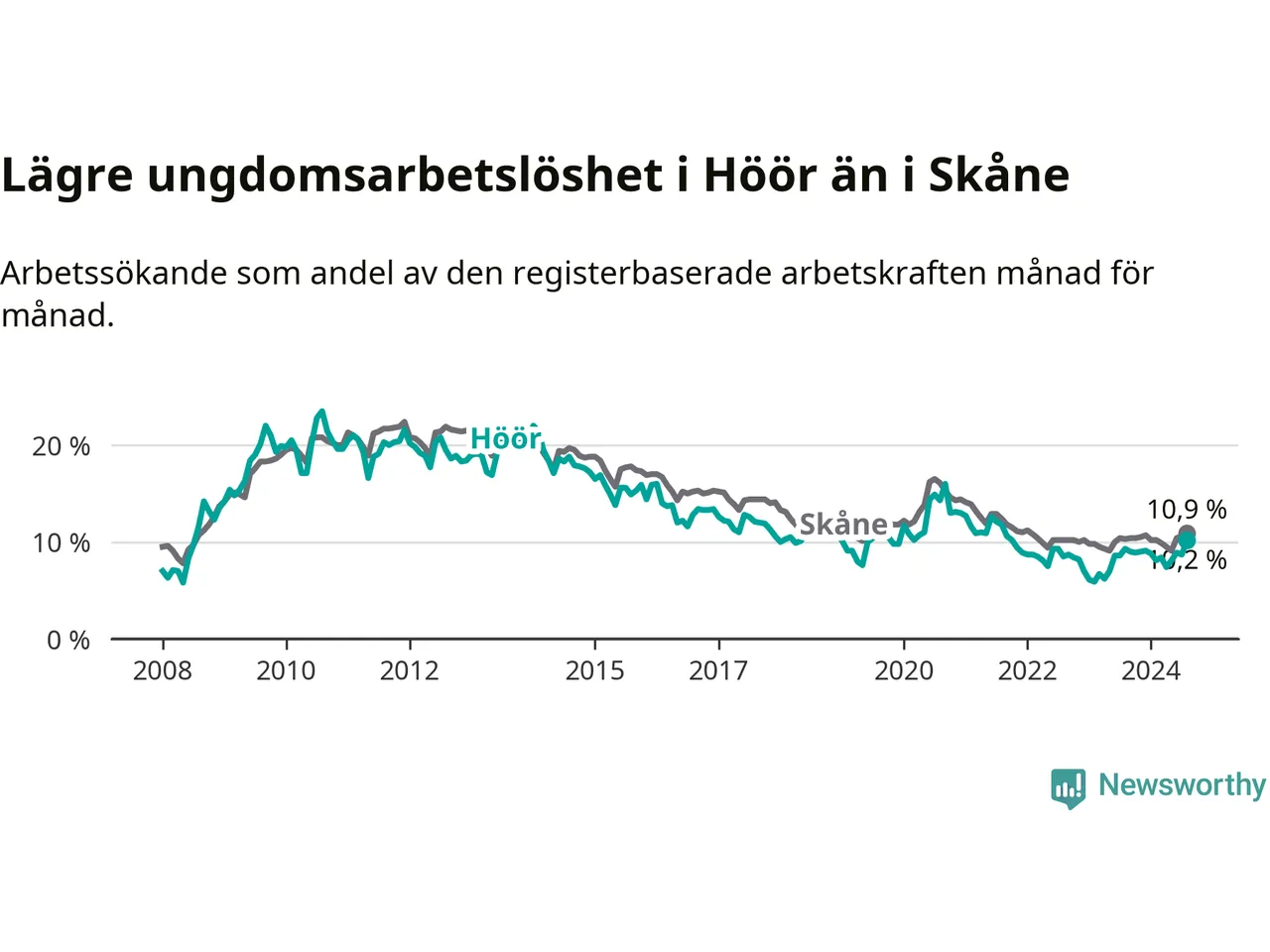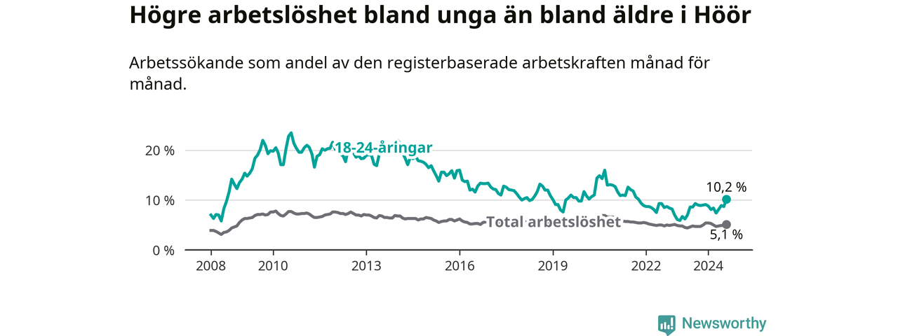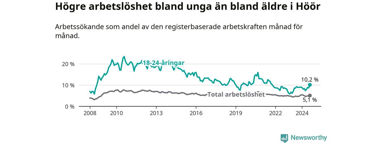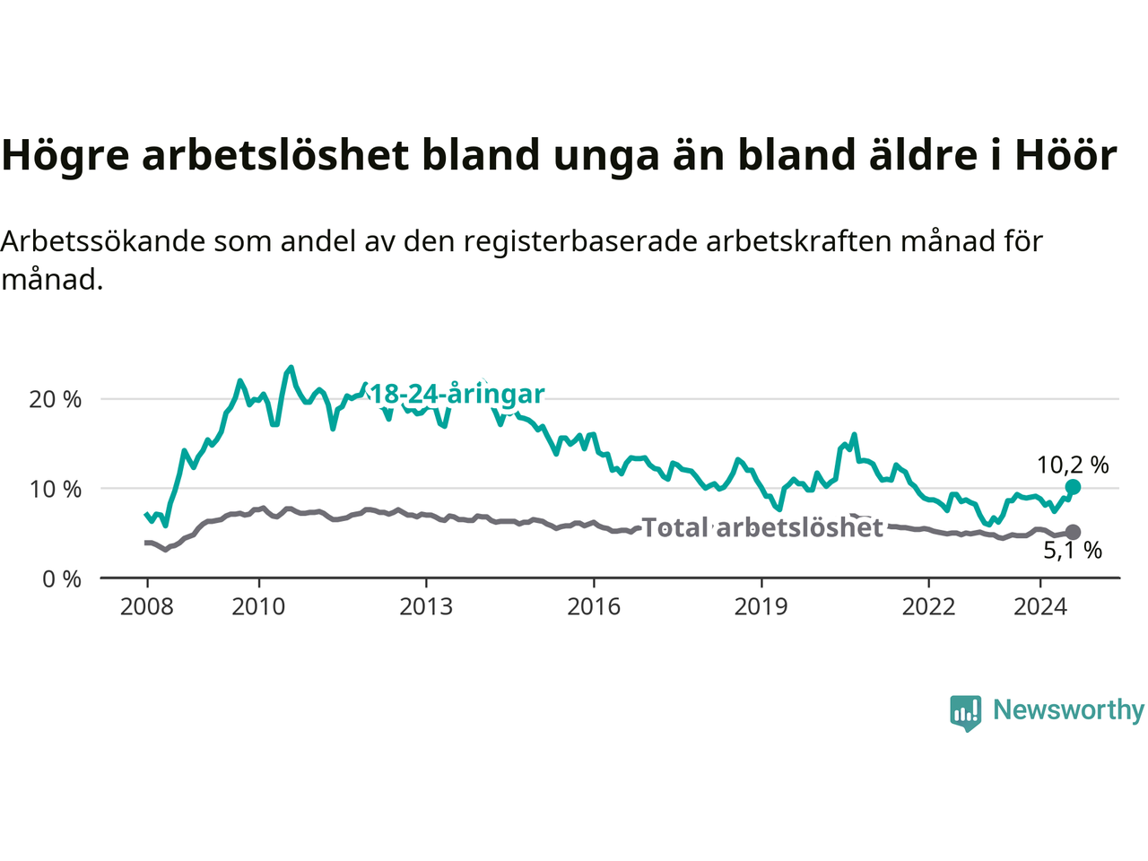 I och med den senaste månadens uppgång har de ungas arbetslöshet i Höör stigit 13 månader i följd (upp från 8,6 procent i juli 2023 till 10,2 procent nu). Den nuvarande arbetslöshetsnivån är den högsta sedan oktober 2021.