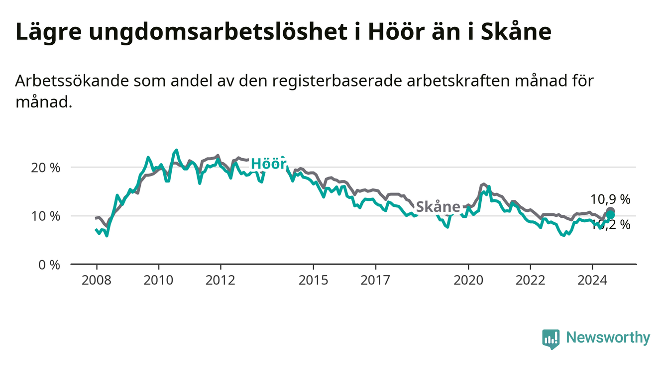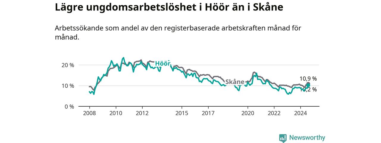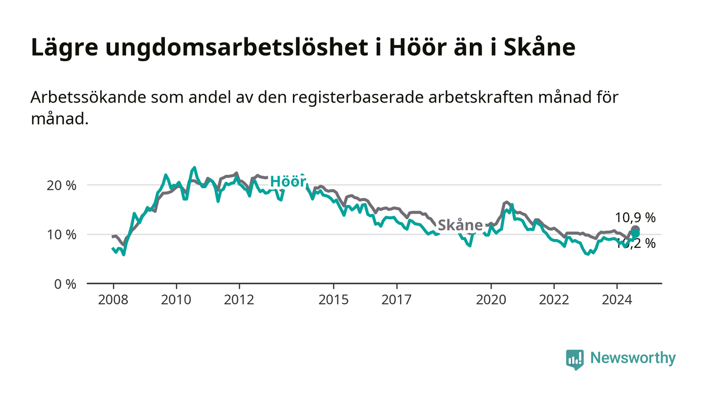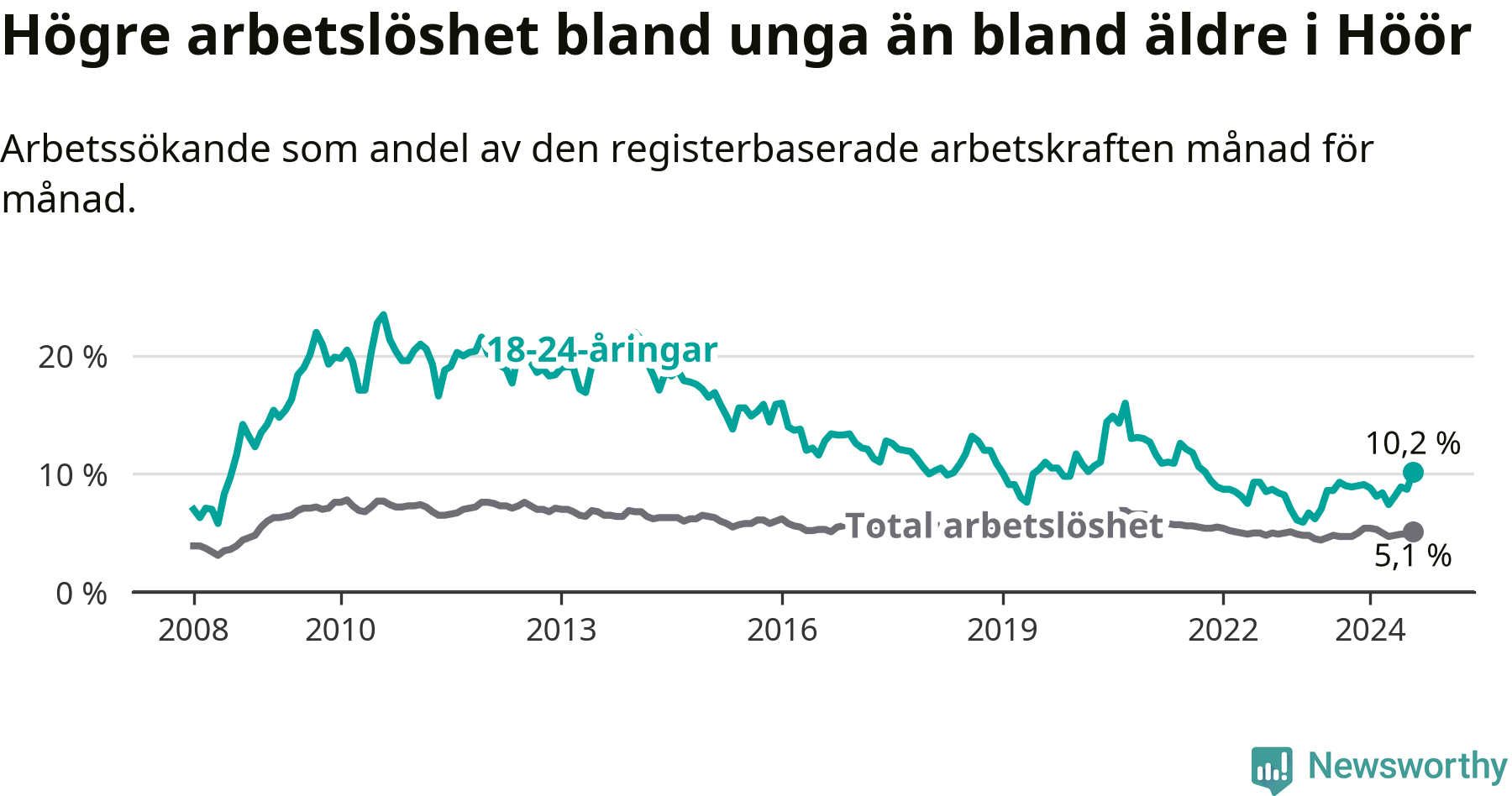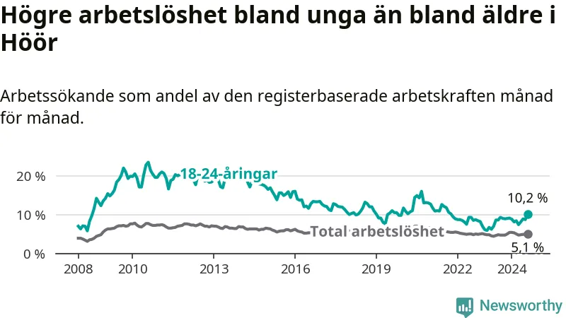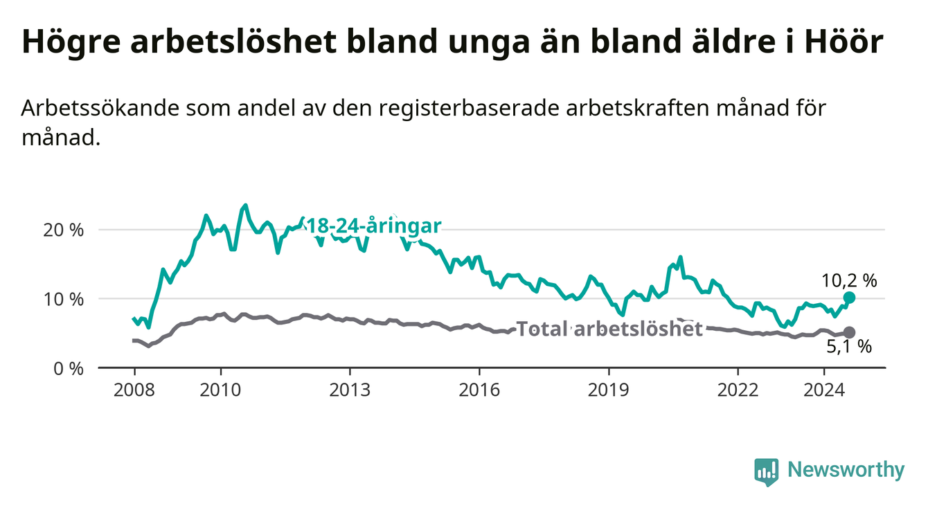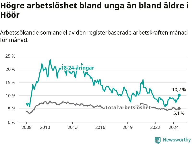 I och med den senaste månadens uppgång har de ungas arbetslöshet i Höör stigit 13 månader i följd (upp från 8,6 procent i juli 2023 till 10,2 procent nu). Den nuvarande arbetslöshetsnivån är den högsta sedan oktober 2021.