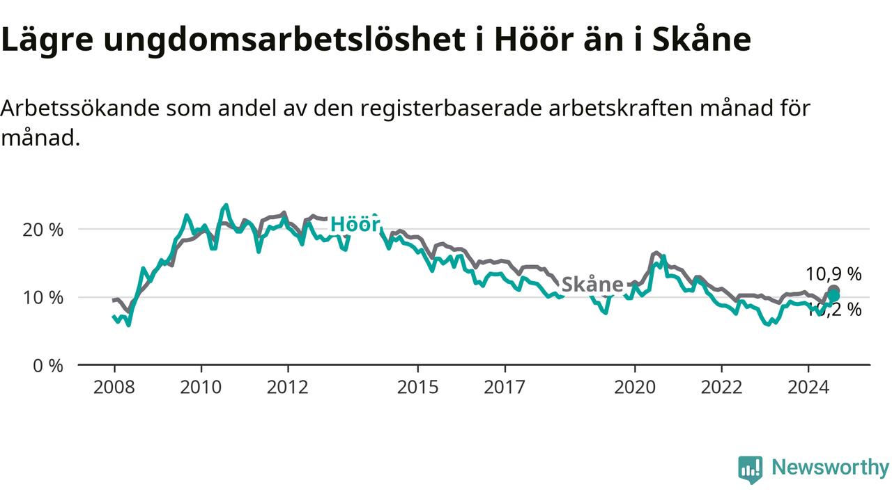 Graf: Arbetslöshet bland unga i Höörs kommun och Skåne län