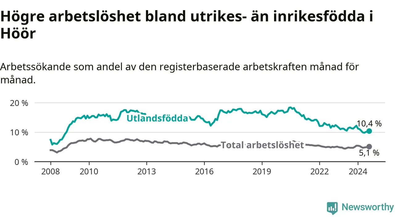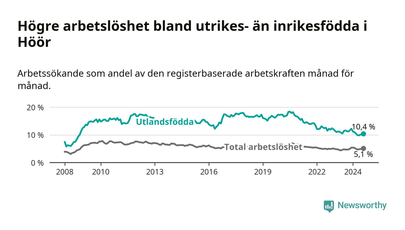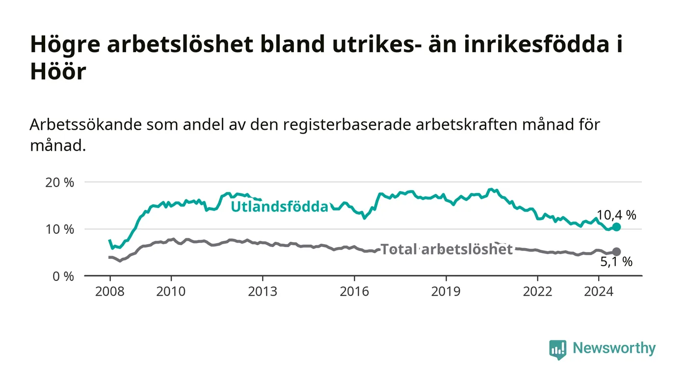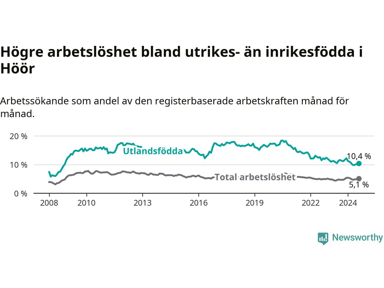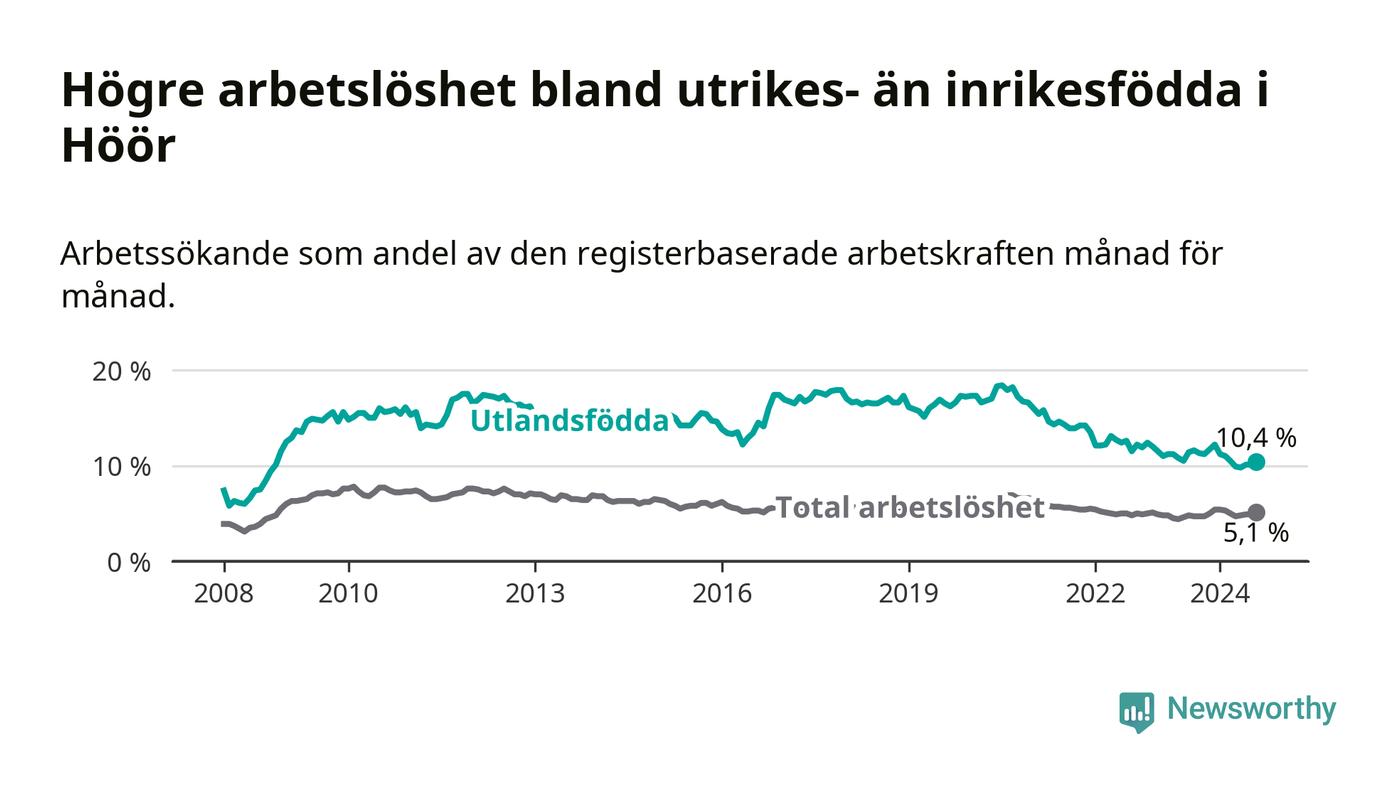 Skillnaden i arbetslöshet mellan utrikesfödda och hela befolkningen är 5,3 procentenheter i Höör. Det är en betydligt mindre skillnad än för ett år sedan (−1,6 procentenheter).