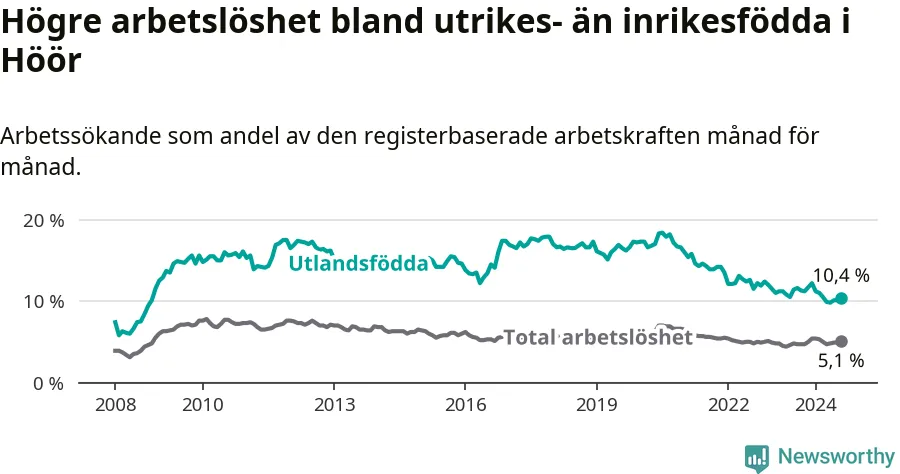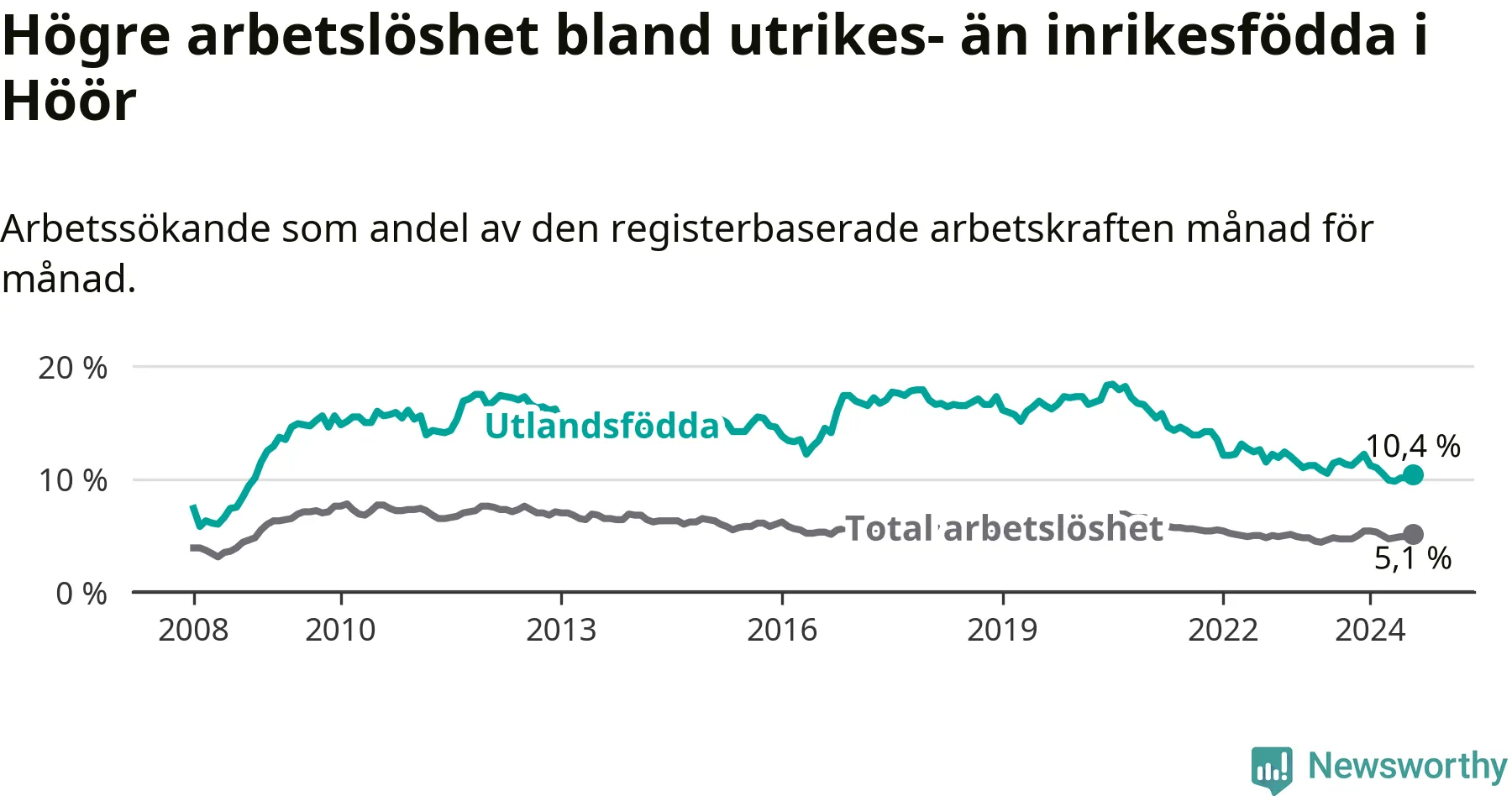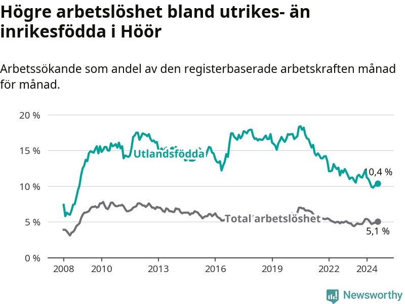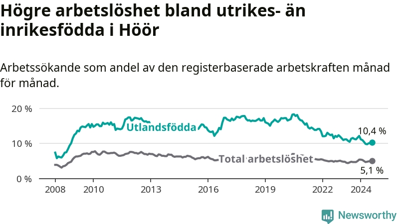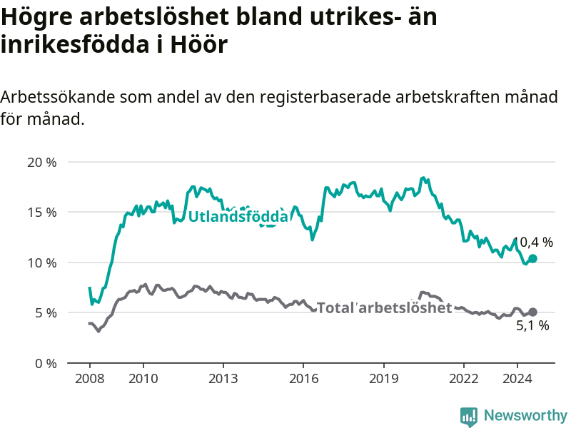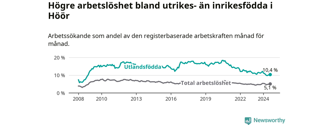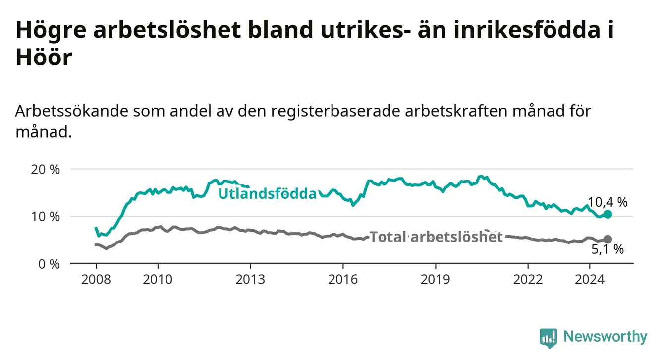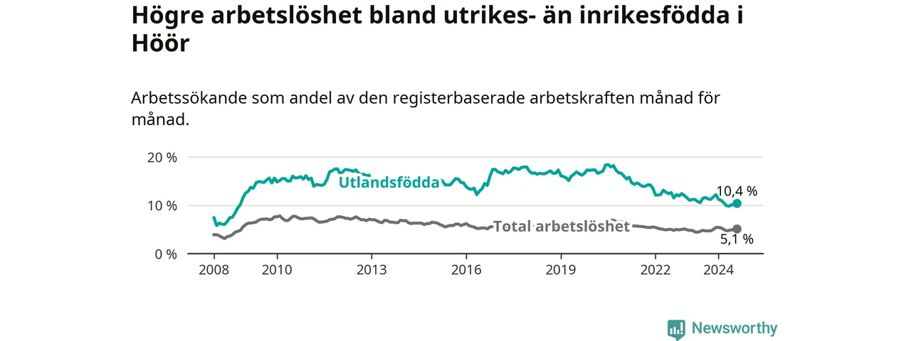 Skillnaden i arbetslöshet mellan utrikesfödda och hela befolkningen är 5,3 procentenheter i Höör. Det är en betydligt mindre skillnad än för ett år sedan (−1,6 procentenheter).