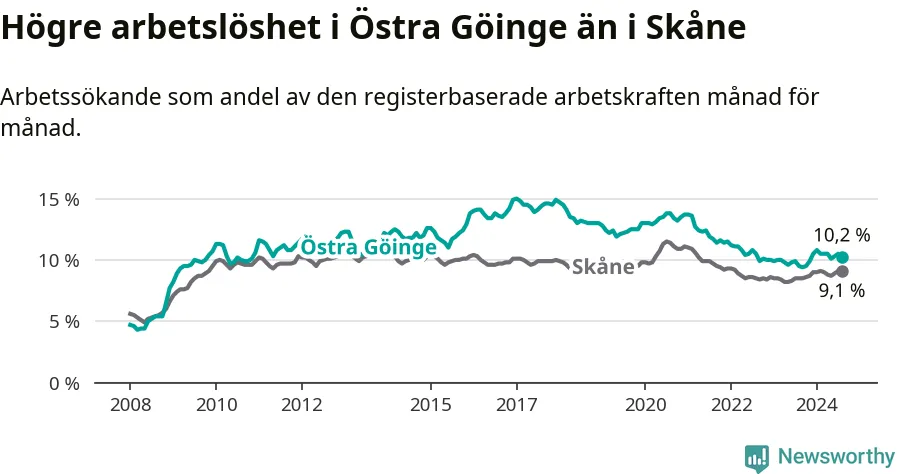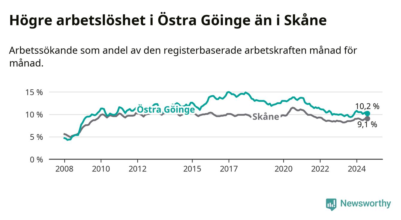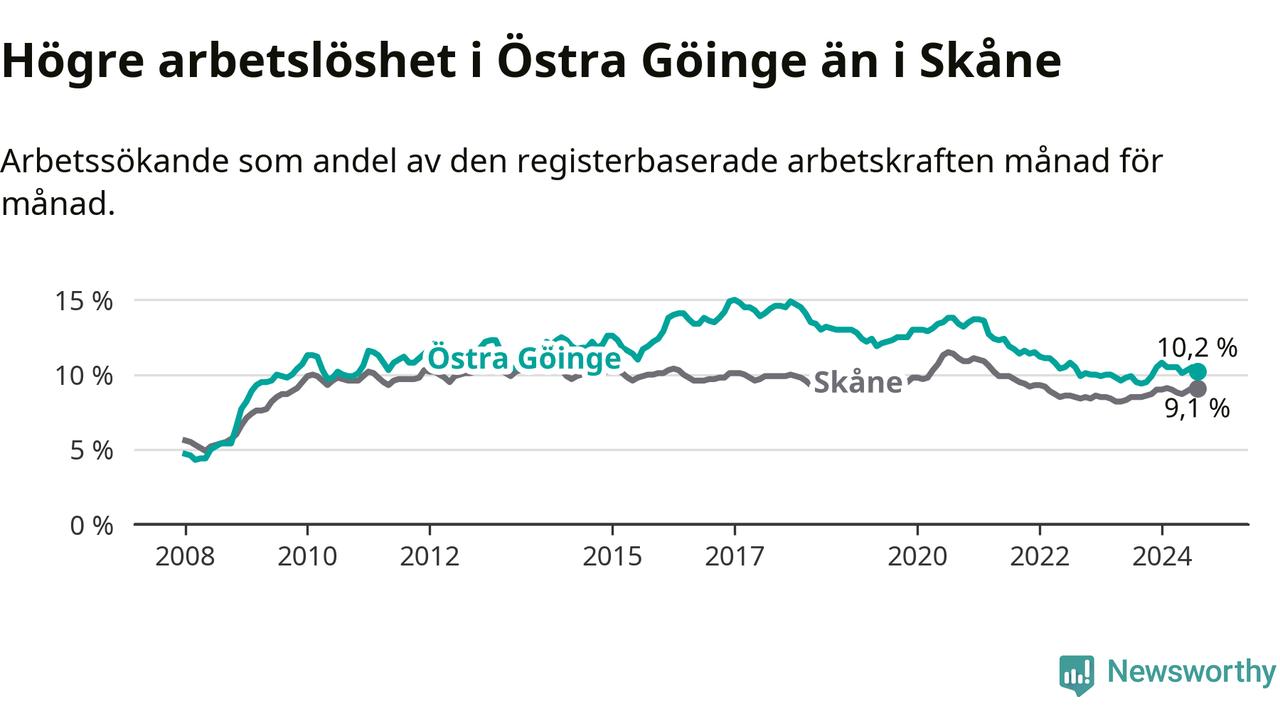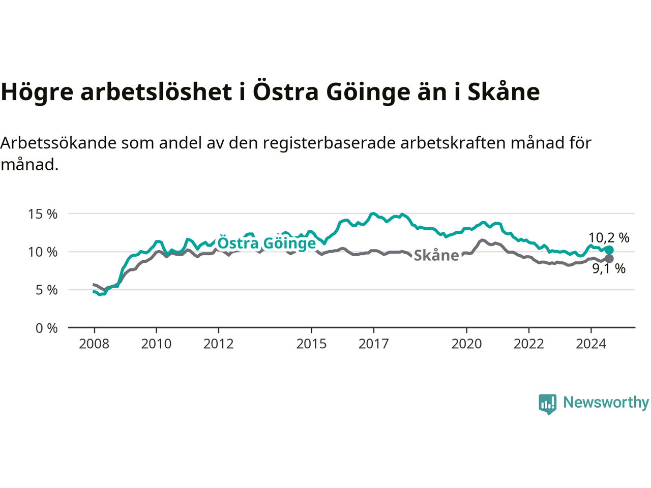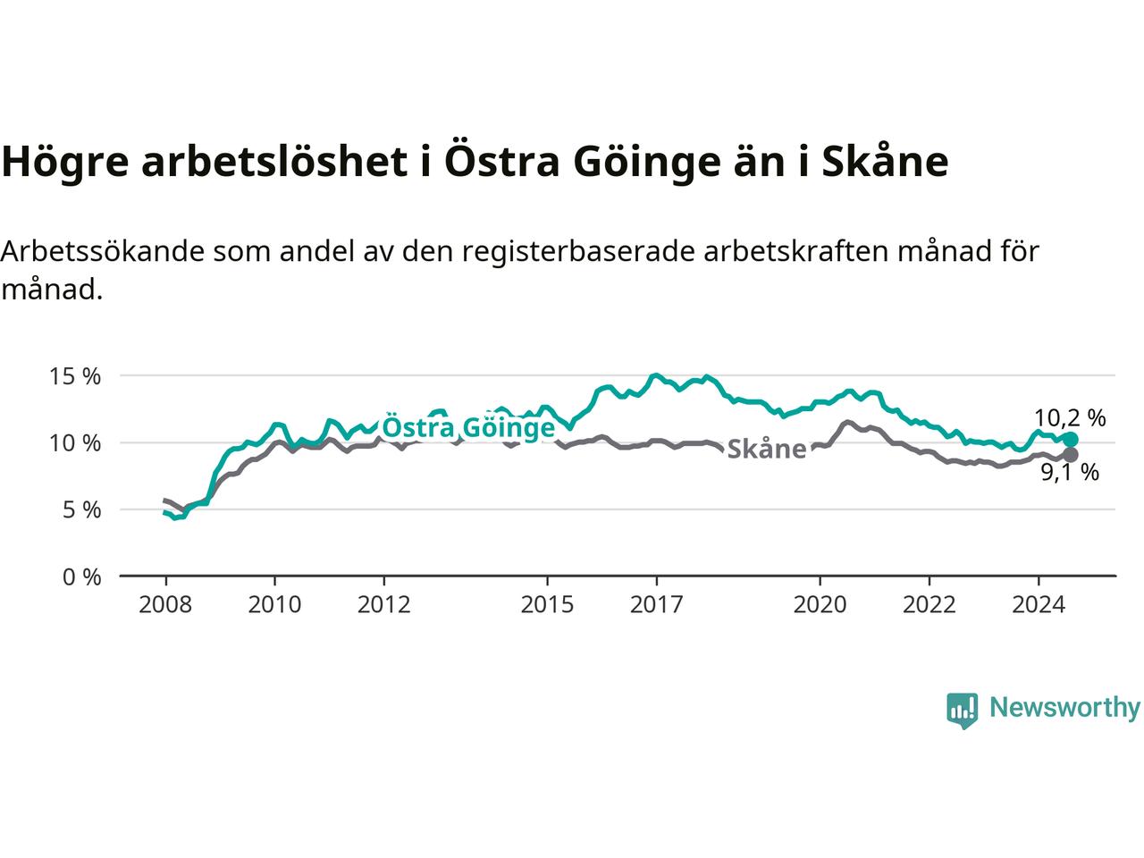 Under augusti månad rapporterade Östra Göinge kommun en total arbetslöshet på 10,2 procent. Det är en ökning jämfört med samma tidpunkt i fjol (+0,7 procentenheter). Även i Skåne län stiger arbetslösheten .