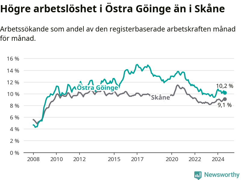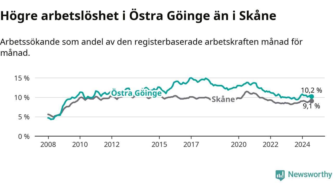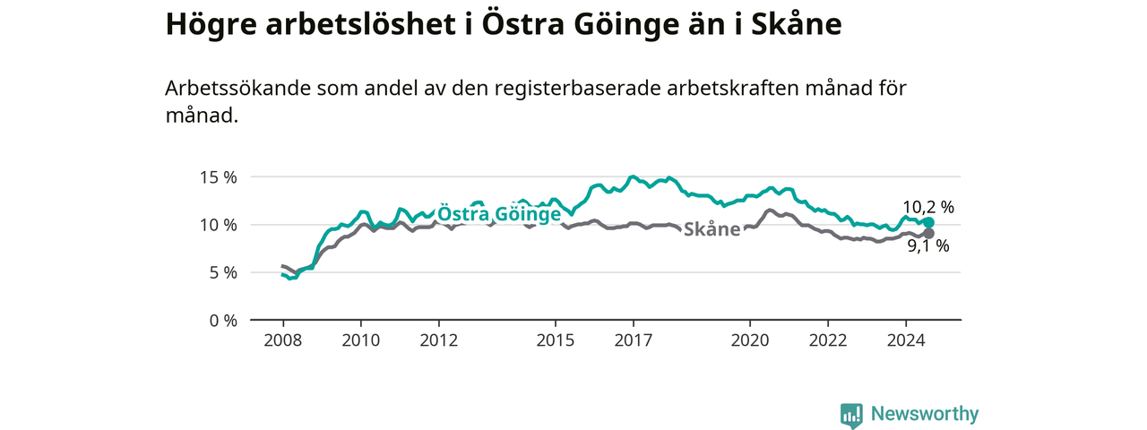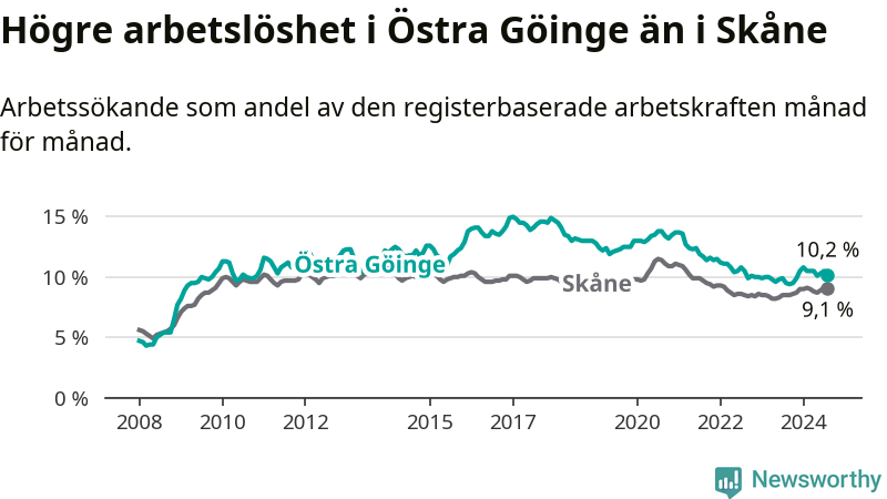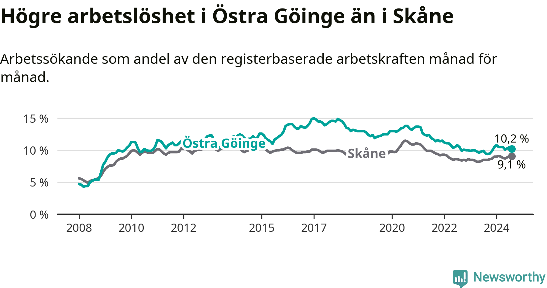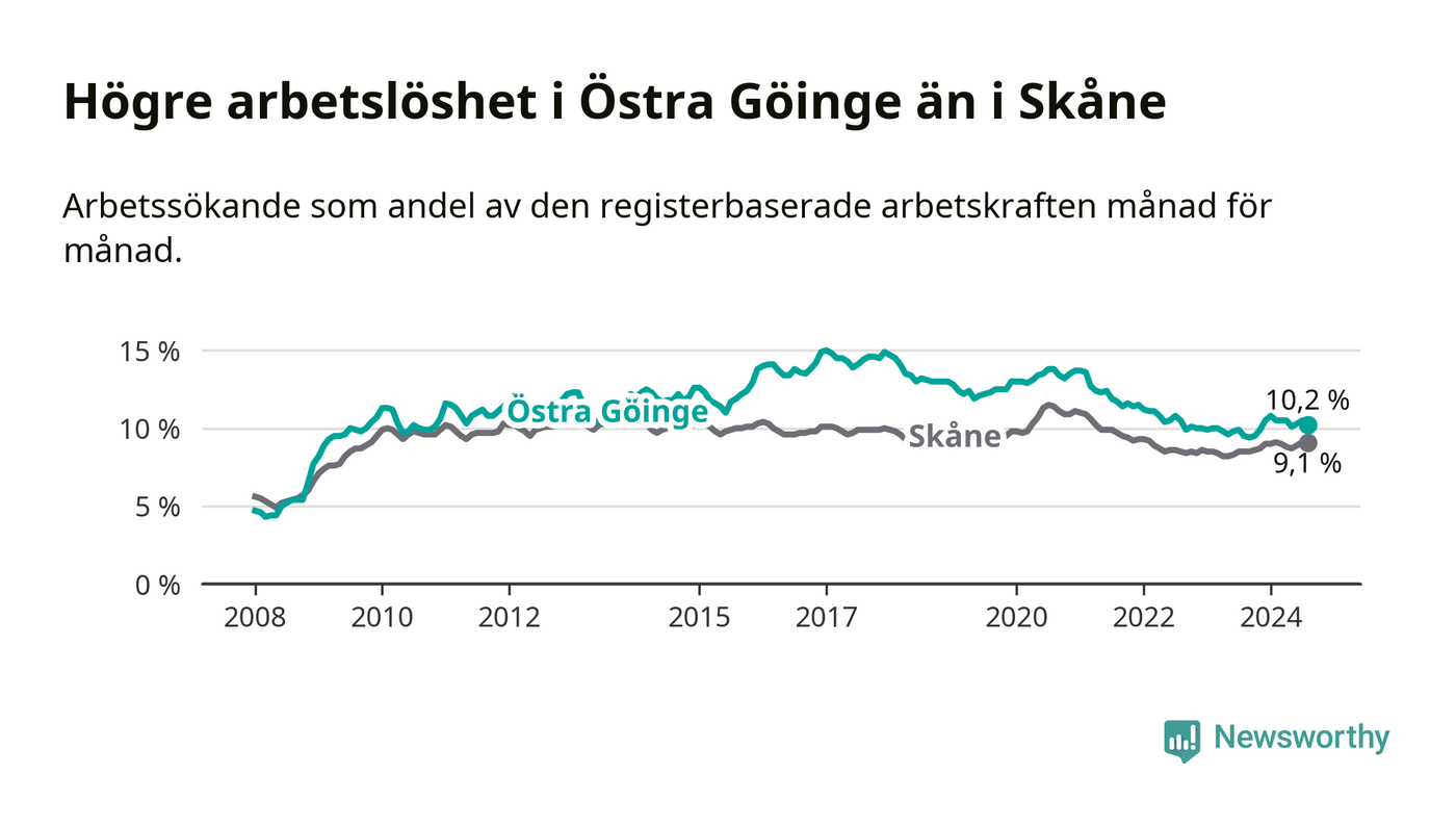 Under augusti månad rapporterade Östra Göinge kommun en total arbetslöshet på 10,2 procent. Det är en ökning jämfört med samma tidpunkt i fjol (+0,7 procentenheter). Även i Skåne län stiger arbetslösheten .