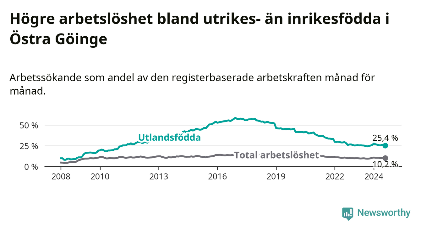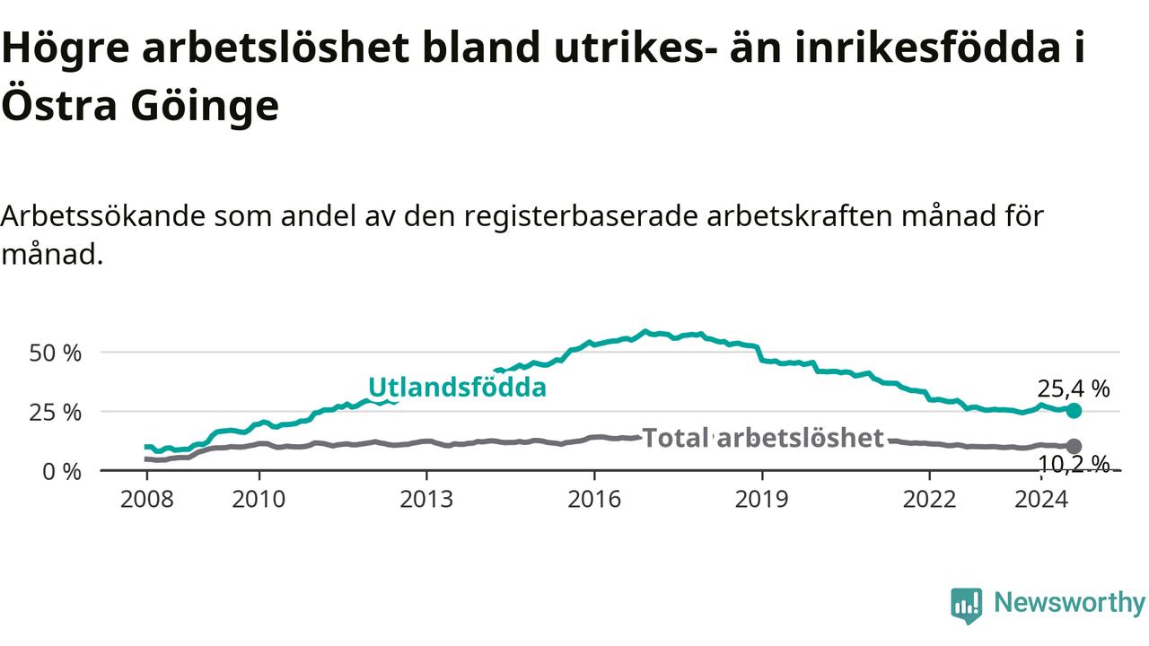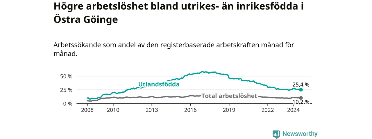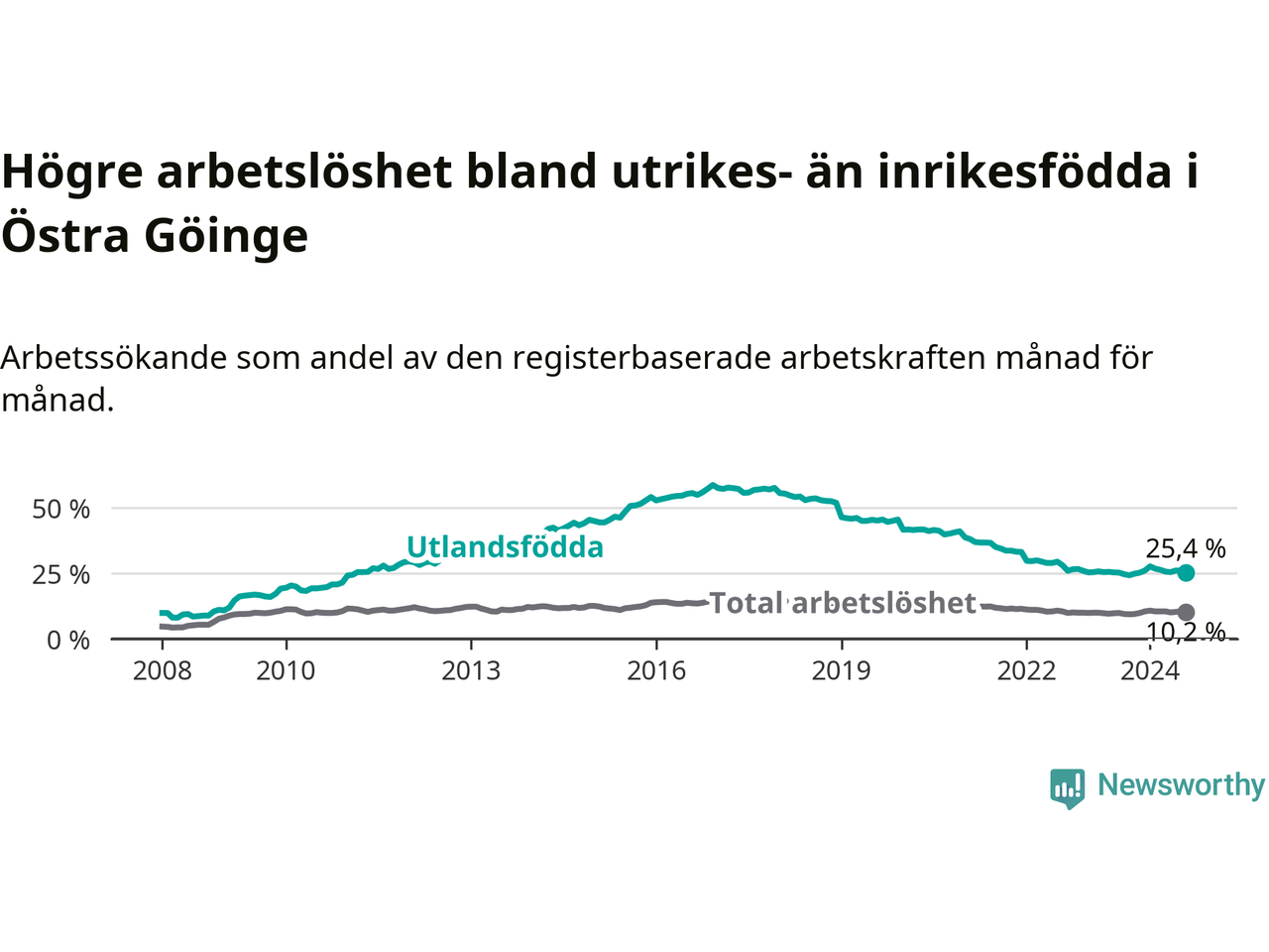 Arbetslösheten bland utlandsfödda var 25,4 procent i Östra Göinge under augusti månad, motsvarande 342 av 1 346 personer. Det är 0,7 procentenheter fler än vid samma tidpunkt i fjol (−4 om man räknar personer).