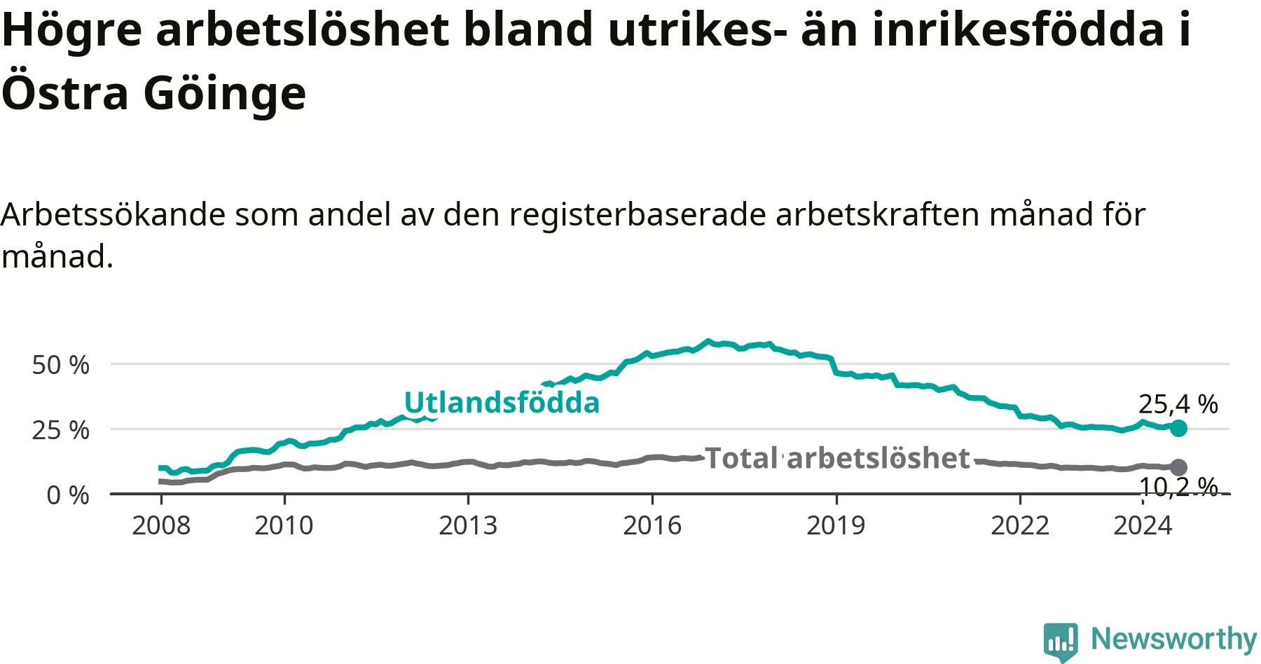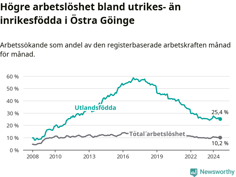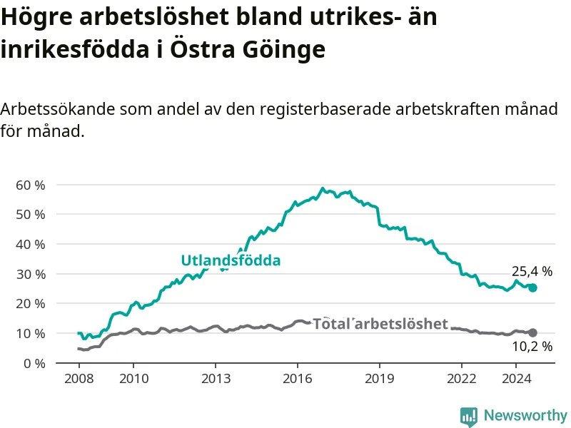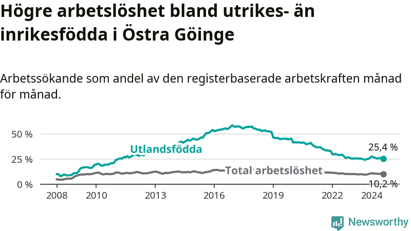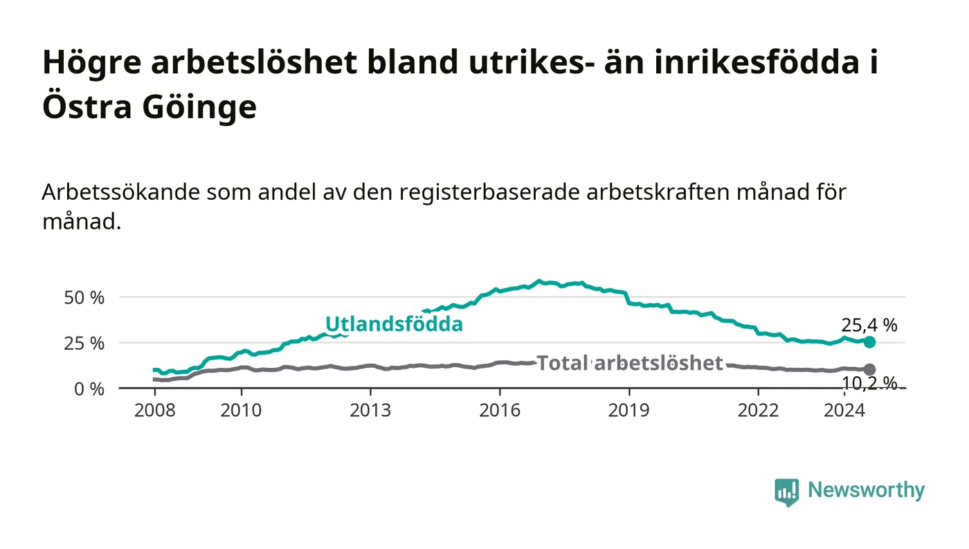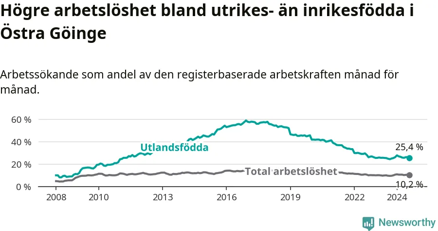 Arbetslösheten bland utlandsfödda var 25,4 procent i Östra Göinge under augusti månad, motsvarande 342 av 1 346 personer. Det är 0,7 procentenheter fler än vid samma tidpunkt i fjol (−4 om man räknar personer).