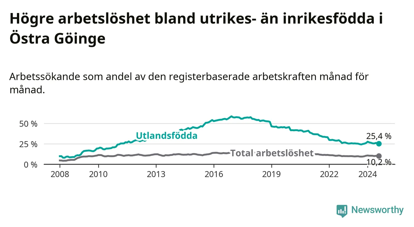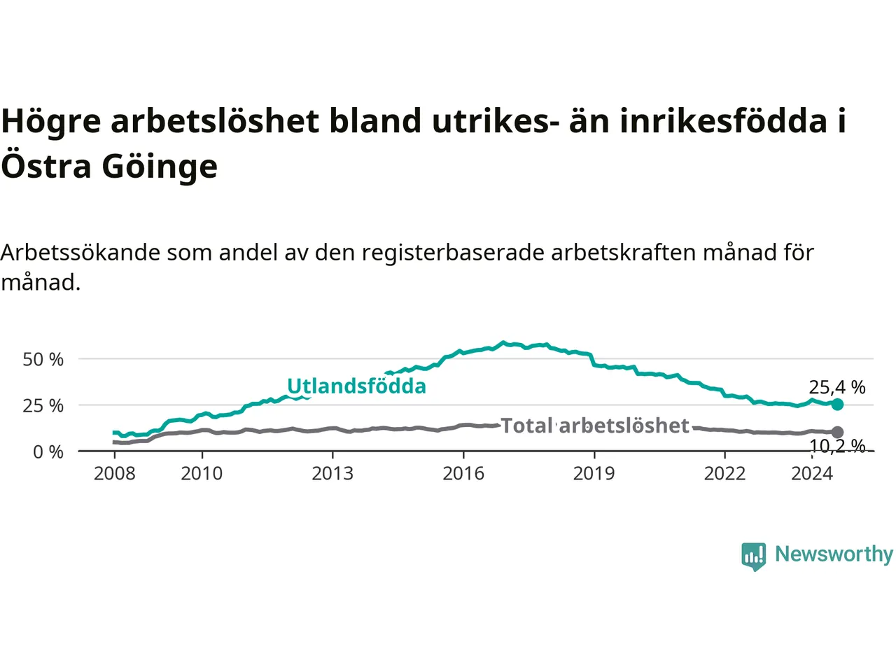 Skillnaden i arbetslöshet mellan utrikesfödda och hela befolkningen är 15,2 procentenheter i Östra Göinge. Det är ungefär samma skillnad som för ett år sedan.