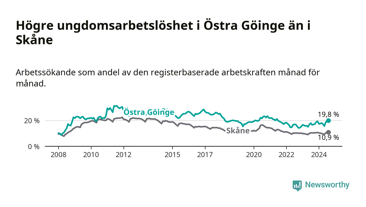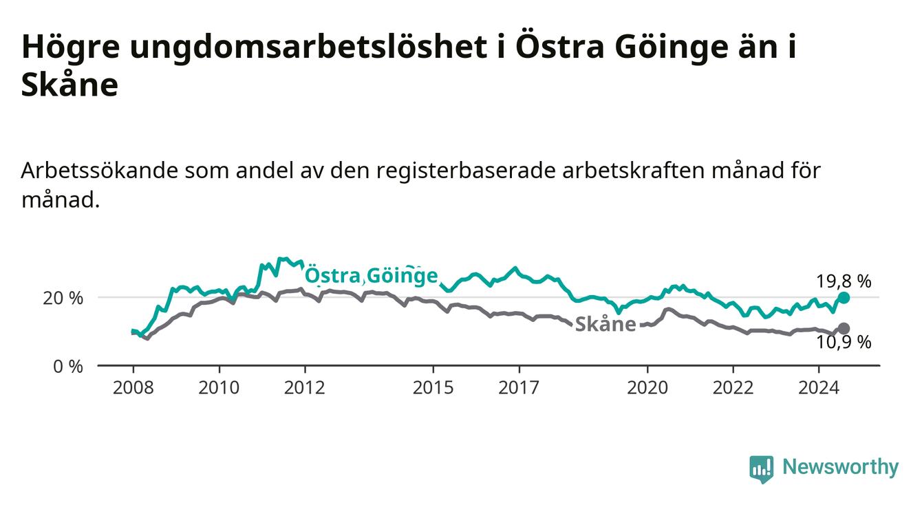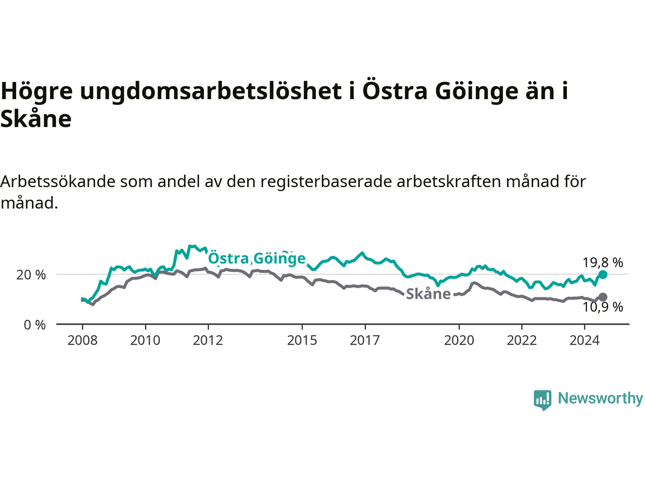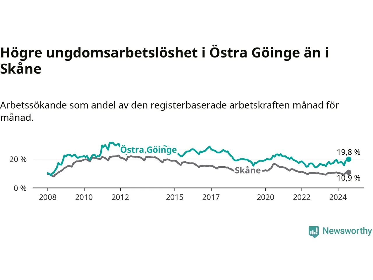 Precis som den totala arbetslösheten ligger ungdomsarbetslösheten i Östra Göinge högre än i Skåne som helhet. Skillnaden mellan kommunen och länet är 8,9 procentenheter.