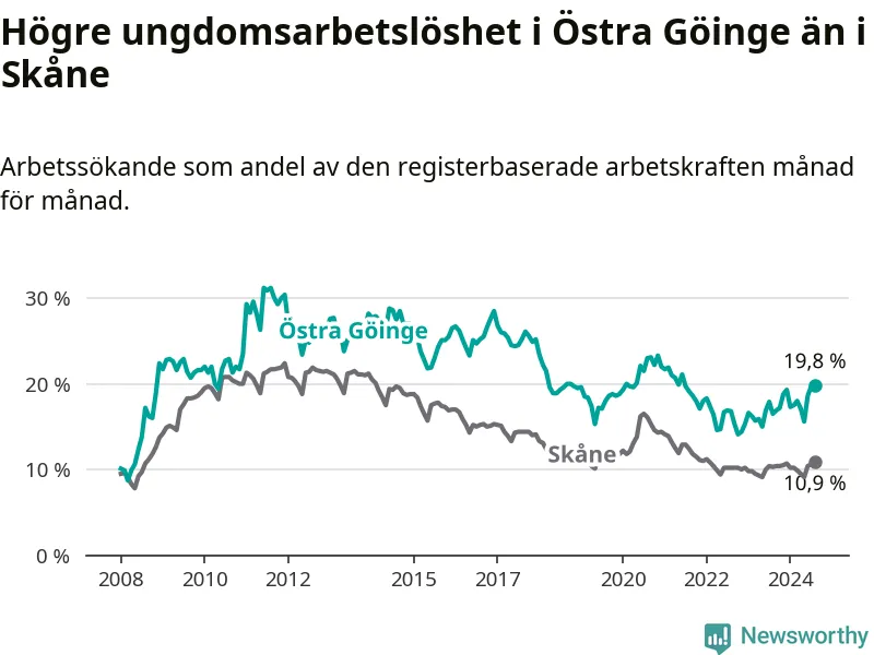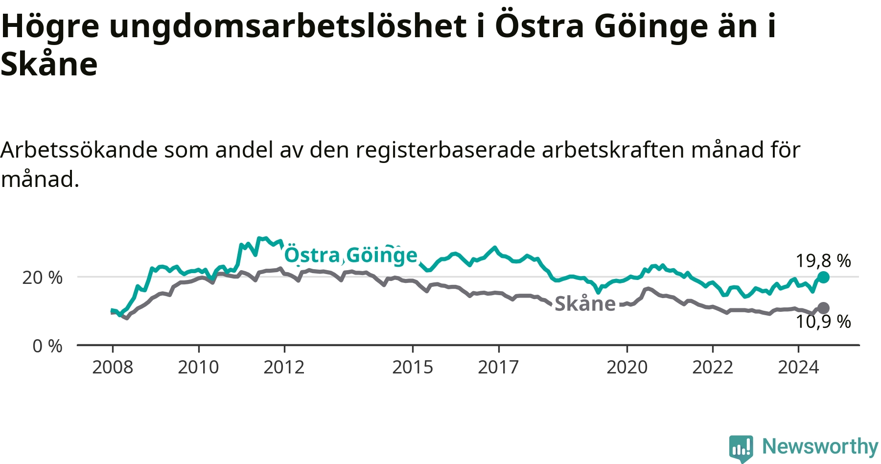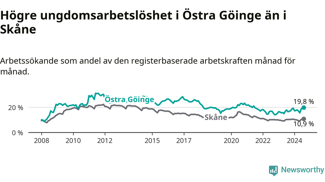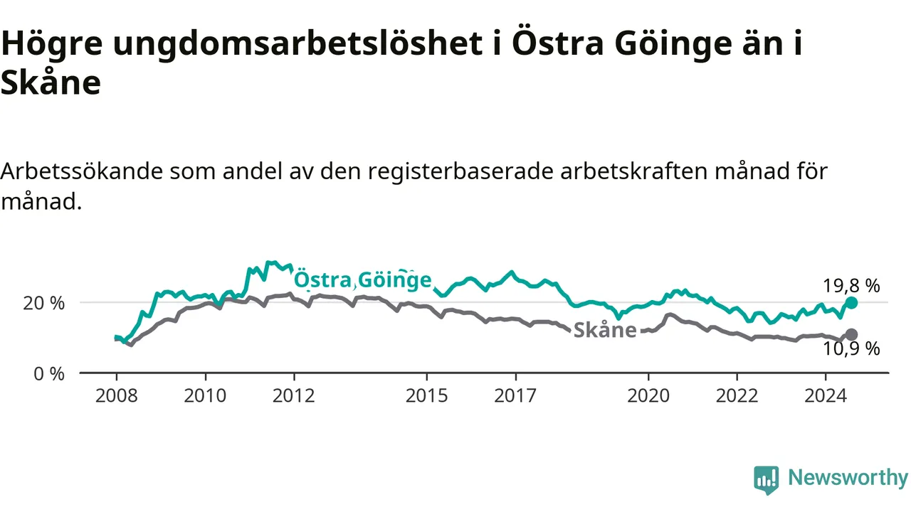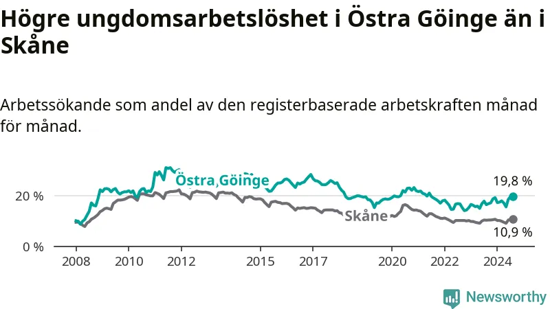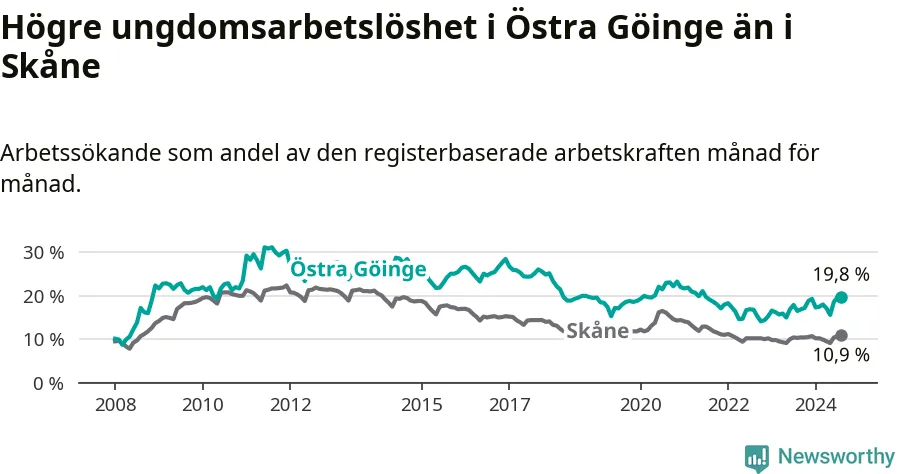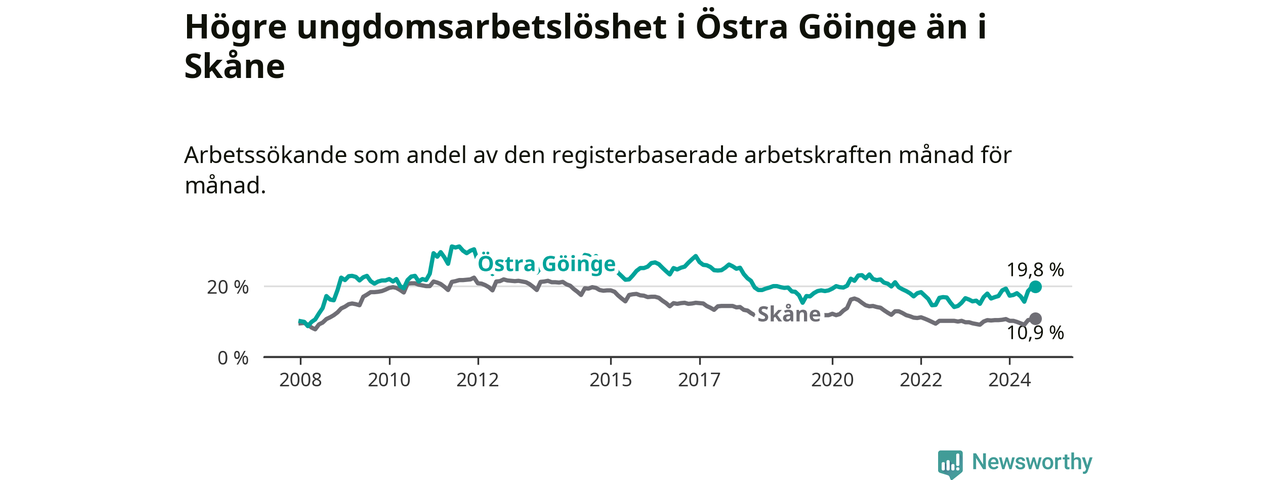 Precis som den totala arbetslösheten ligger ungdomsarbetslösheten i Östra Göinge högre än i Skåne som helhet. Skillnaden mellan kommunen och länet är 8,9 procentenheter.