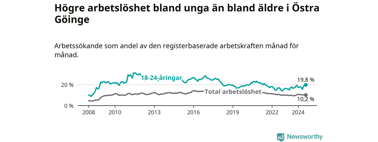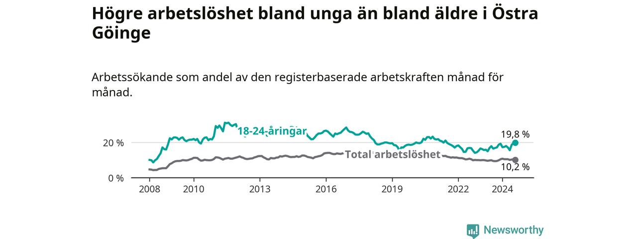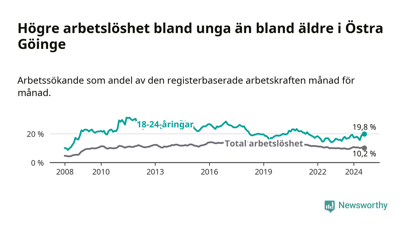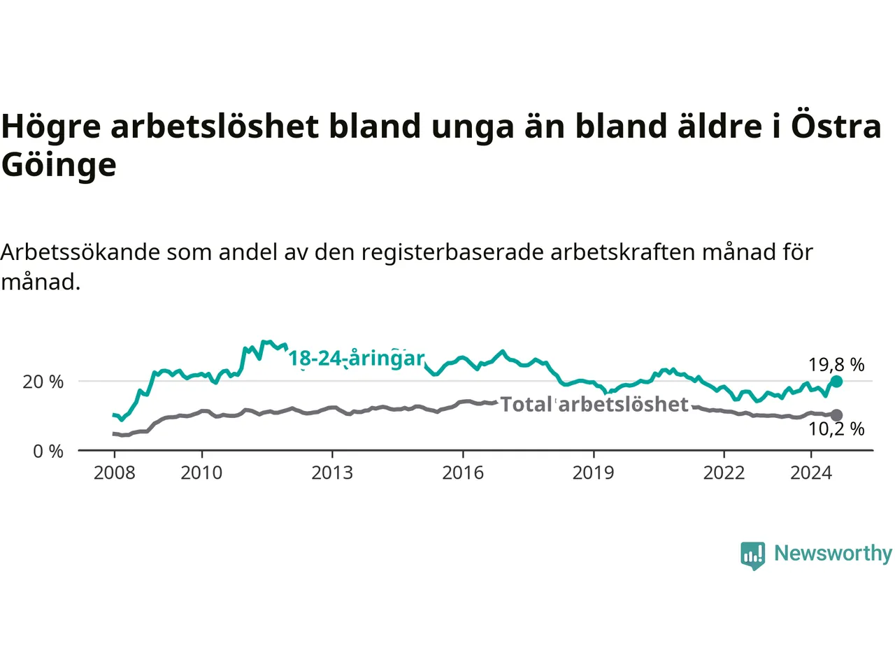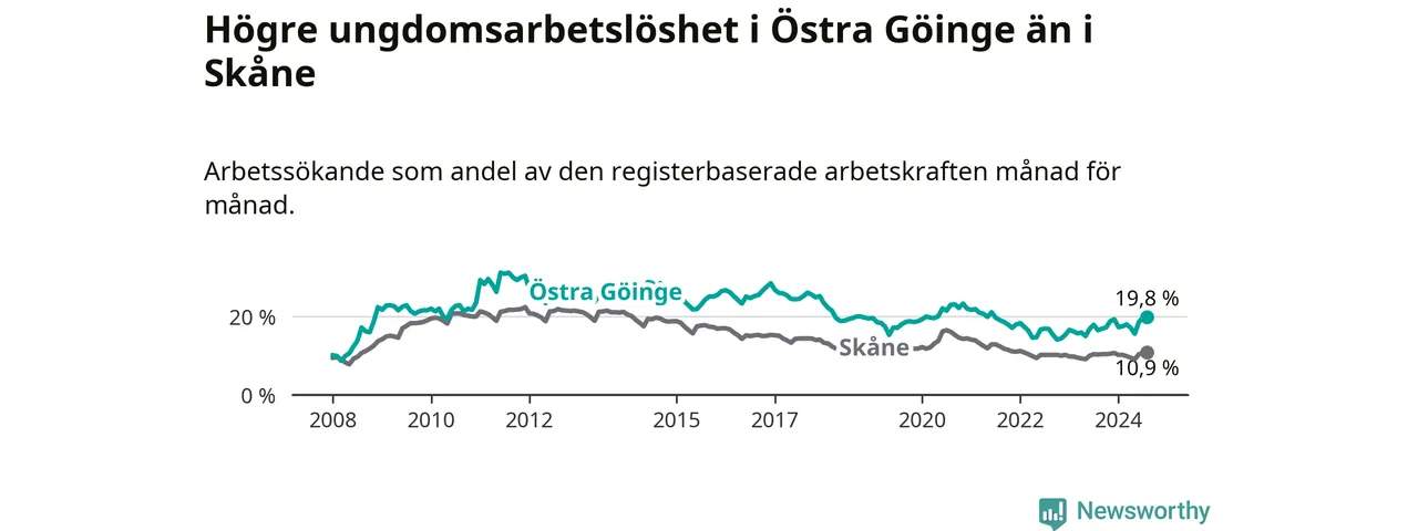 I och med den senaste månadens uppgång har de ungas arbetslöshet i Östra Göinge stigit tolv månader i följd (upp från 16,5 procent i augusti 2023 till 19,8 procent nu). Den nuvarande arbetslöshetsnivån är den högsta sedan juni 2021.