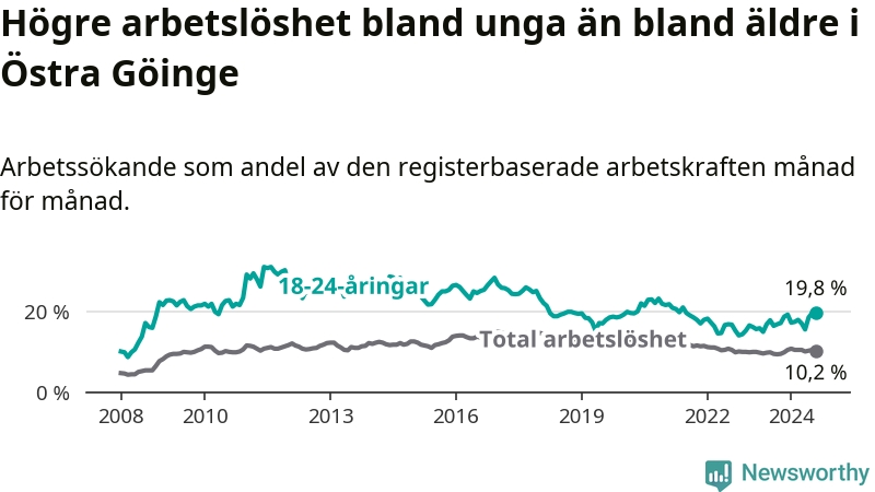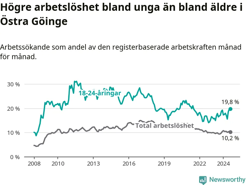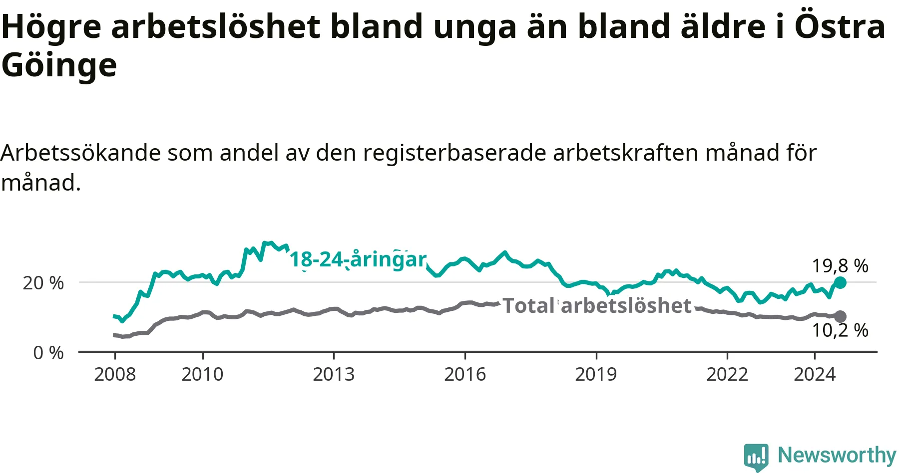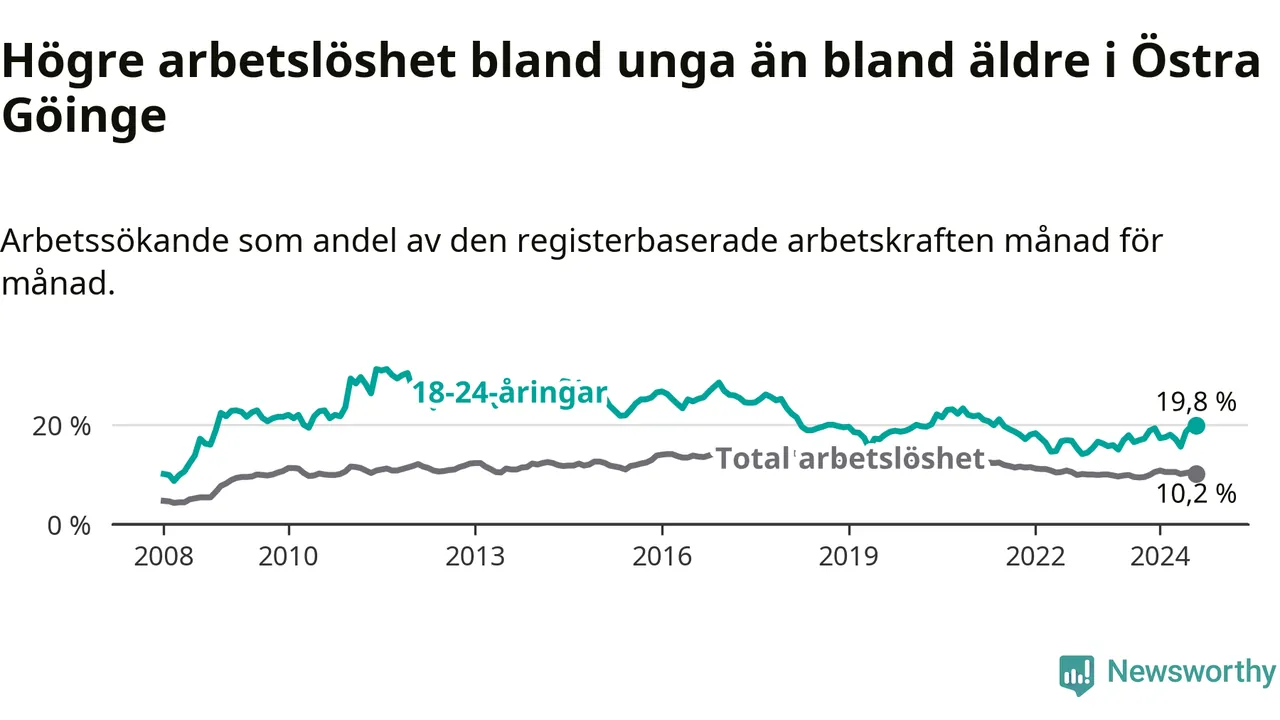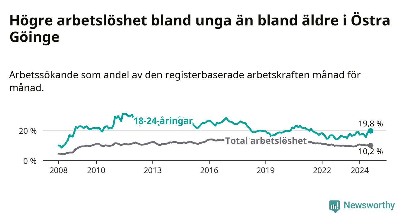 I och med den senaste månadens uppgång har de ungas arbetslöshet i Östra Göinge stigit tolv månader i följd (upp från 16,5 procent i augusti 2023 till 19,8 procent nu). Den nuvarande arbetslöshetsnivån är den högsta sedan juni 2021.