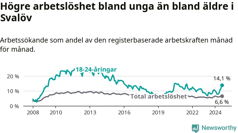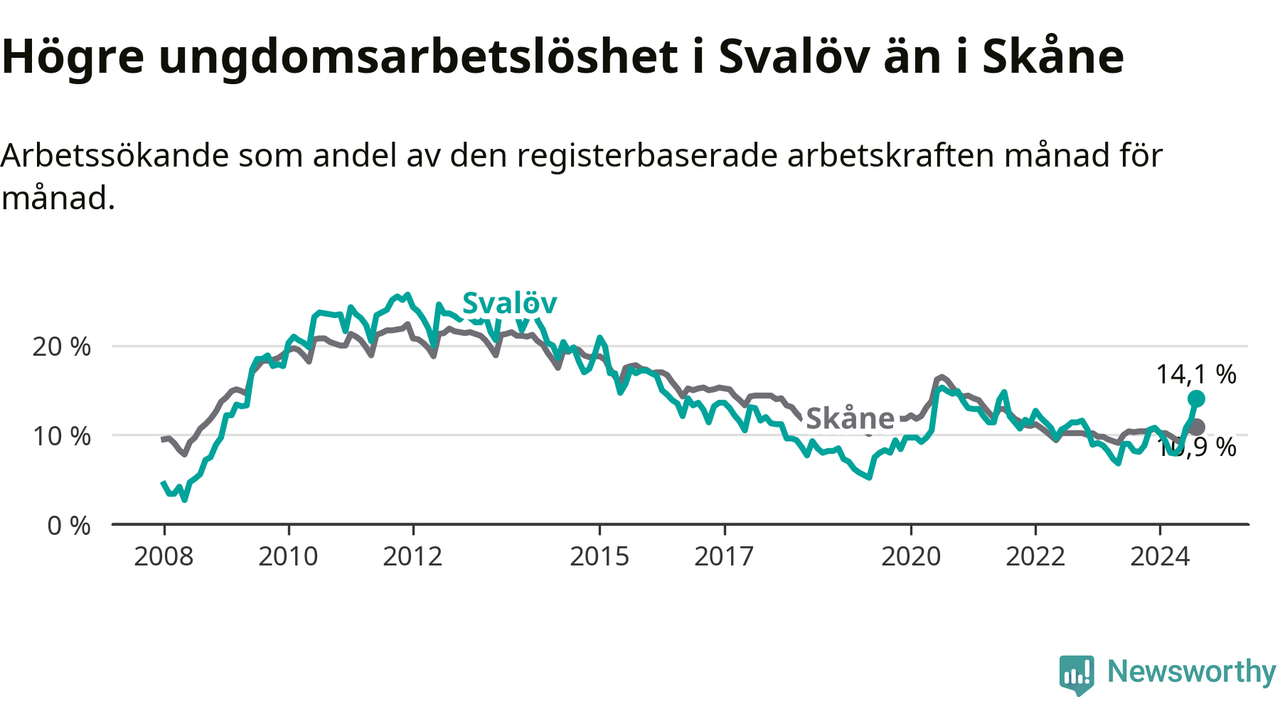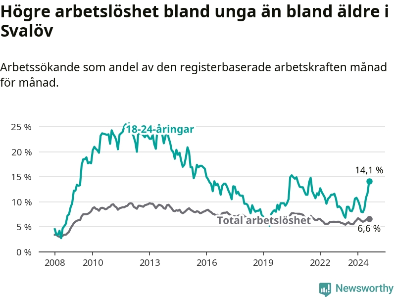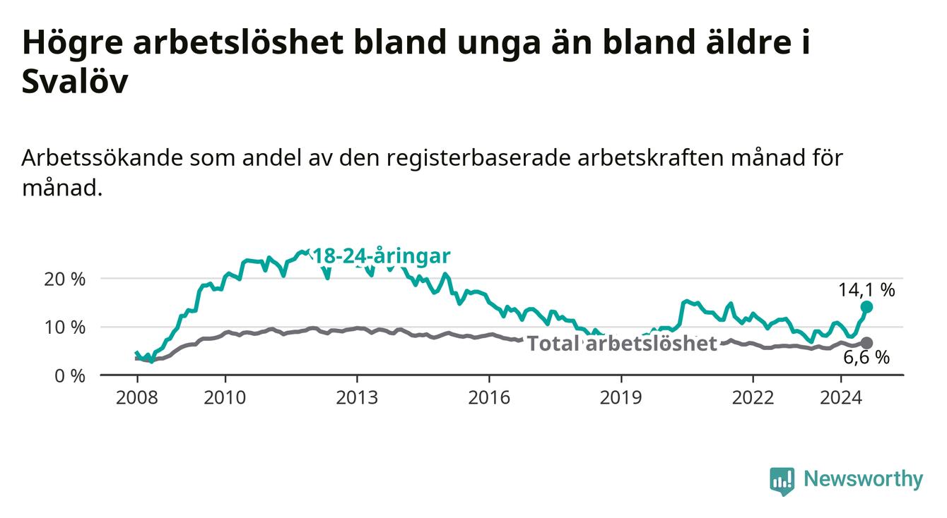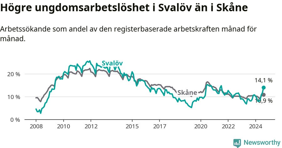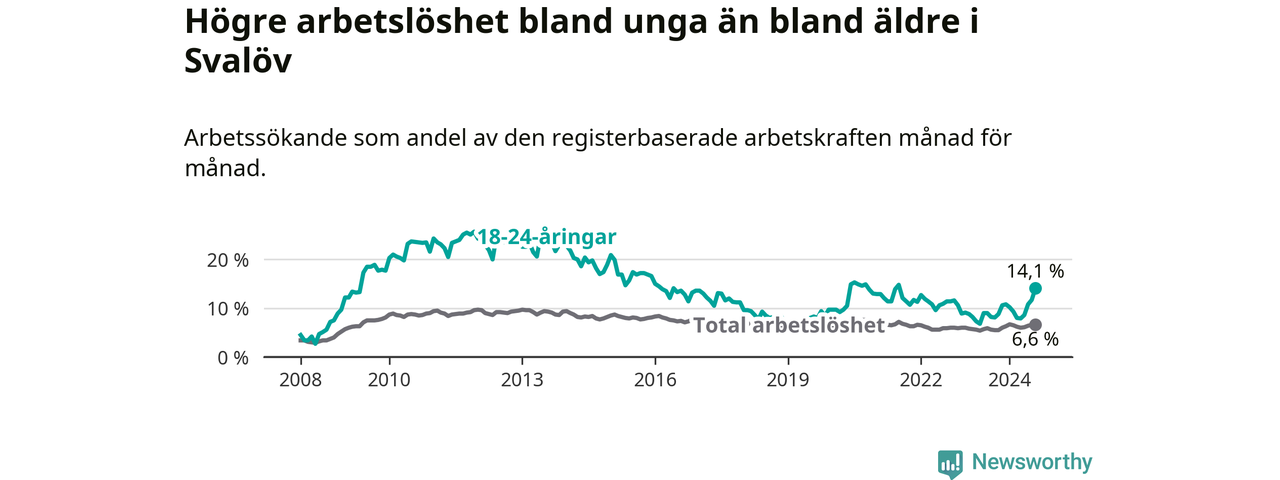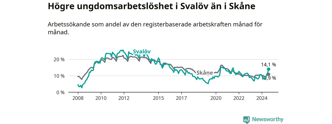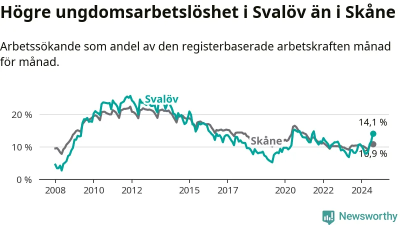 Den senaste månadsstatistiken från Arbetsförmedlingen visar på en uppgång i ungdoms­arbetslöshet i Svalövs kommun med 5,9 procentenheter. Arbetslösheten bland personer i åldern 18–24 år låg i augusti på 14,1 procent.