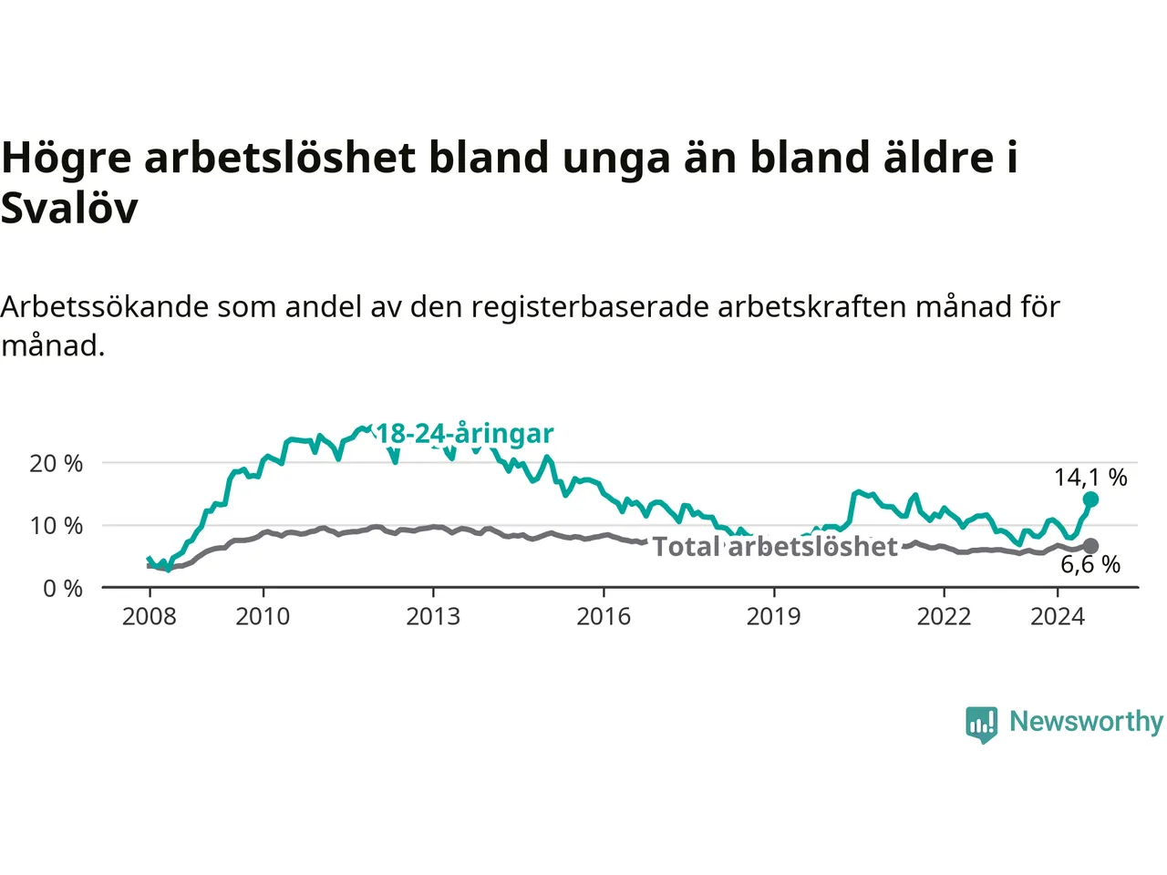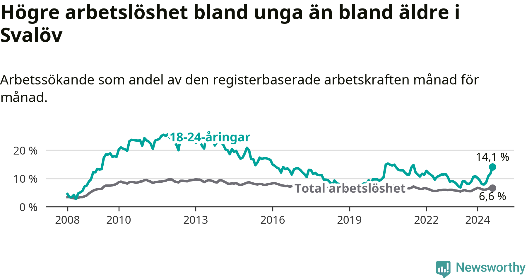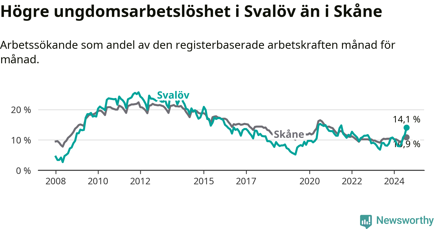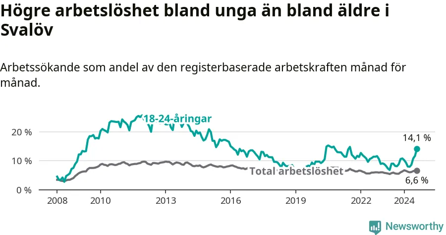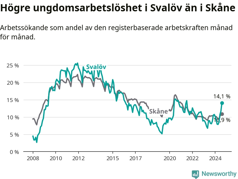 Den senaste månadsstatistiken från Arbetsförmedlingen visar på en uppgång i ungdoms­arbetslöshet i Svalövs kommun med 5,9 procentenheter. Arbetslösheten bland personer i åldern 18–24 år låg i augusti på 14,1 procent.