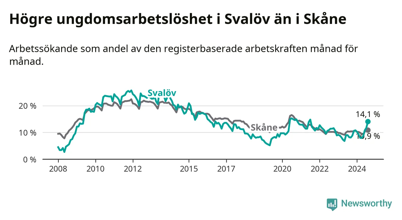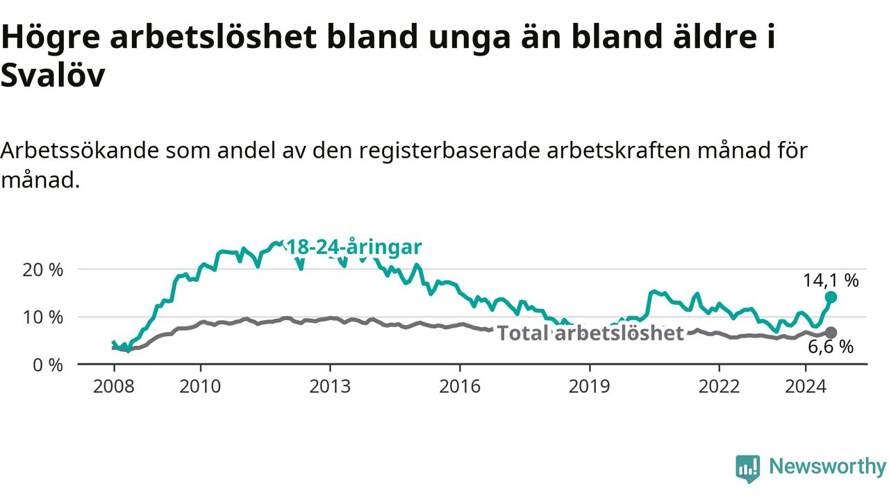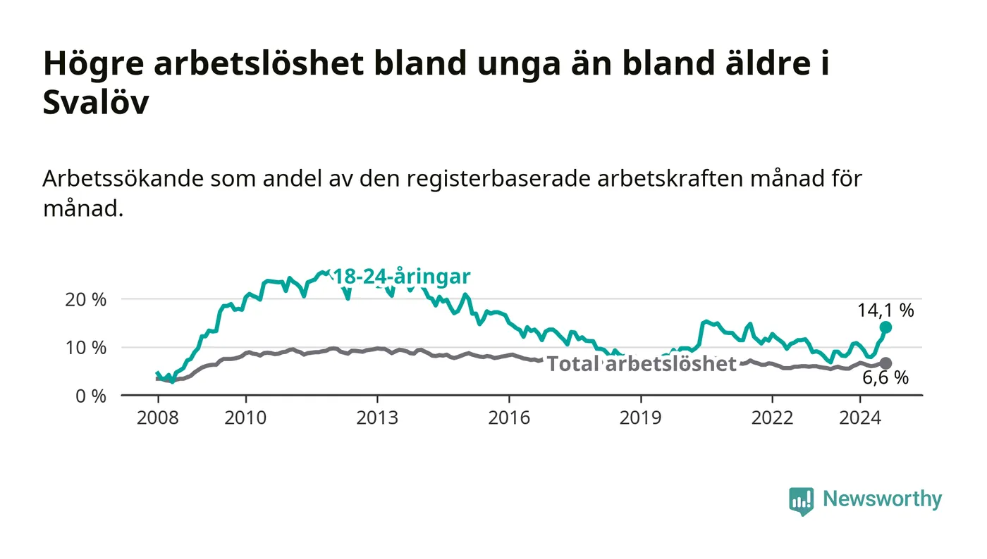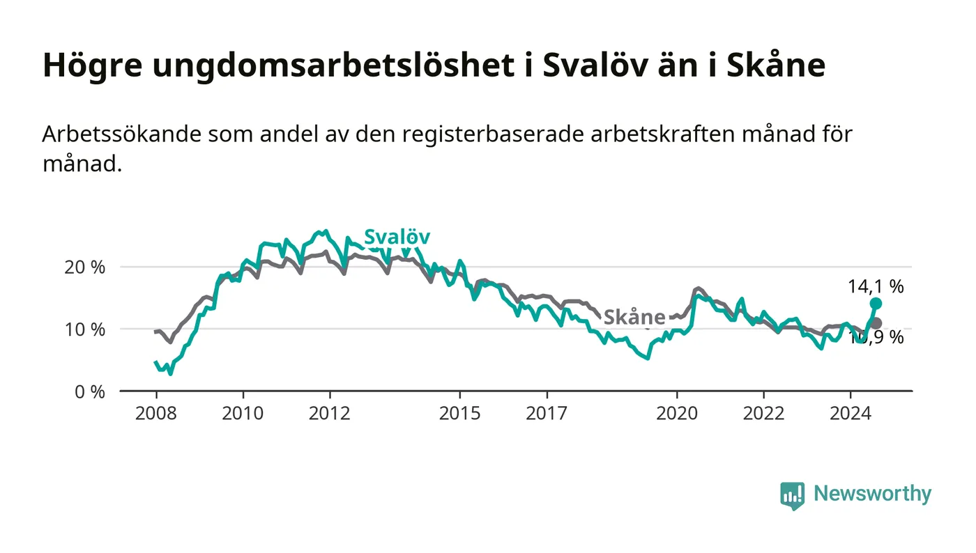 Medan Svalöv har lägre total arbetslöshet än Skåne, ligger ungdomsarbetslösheten 3,2 procentenheter högre i Svalöv.