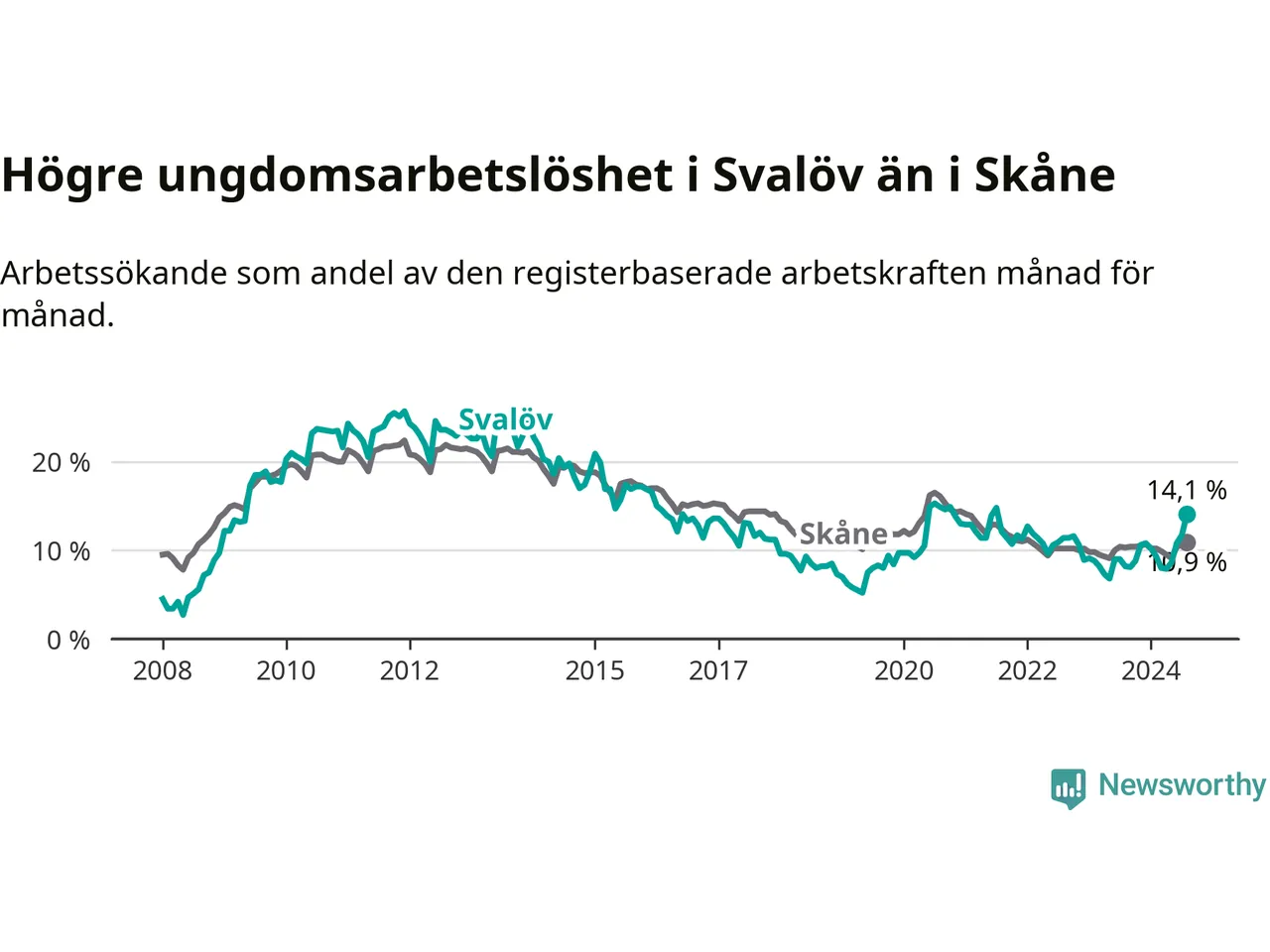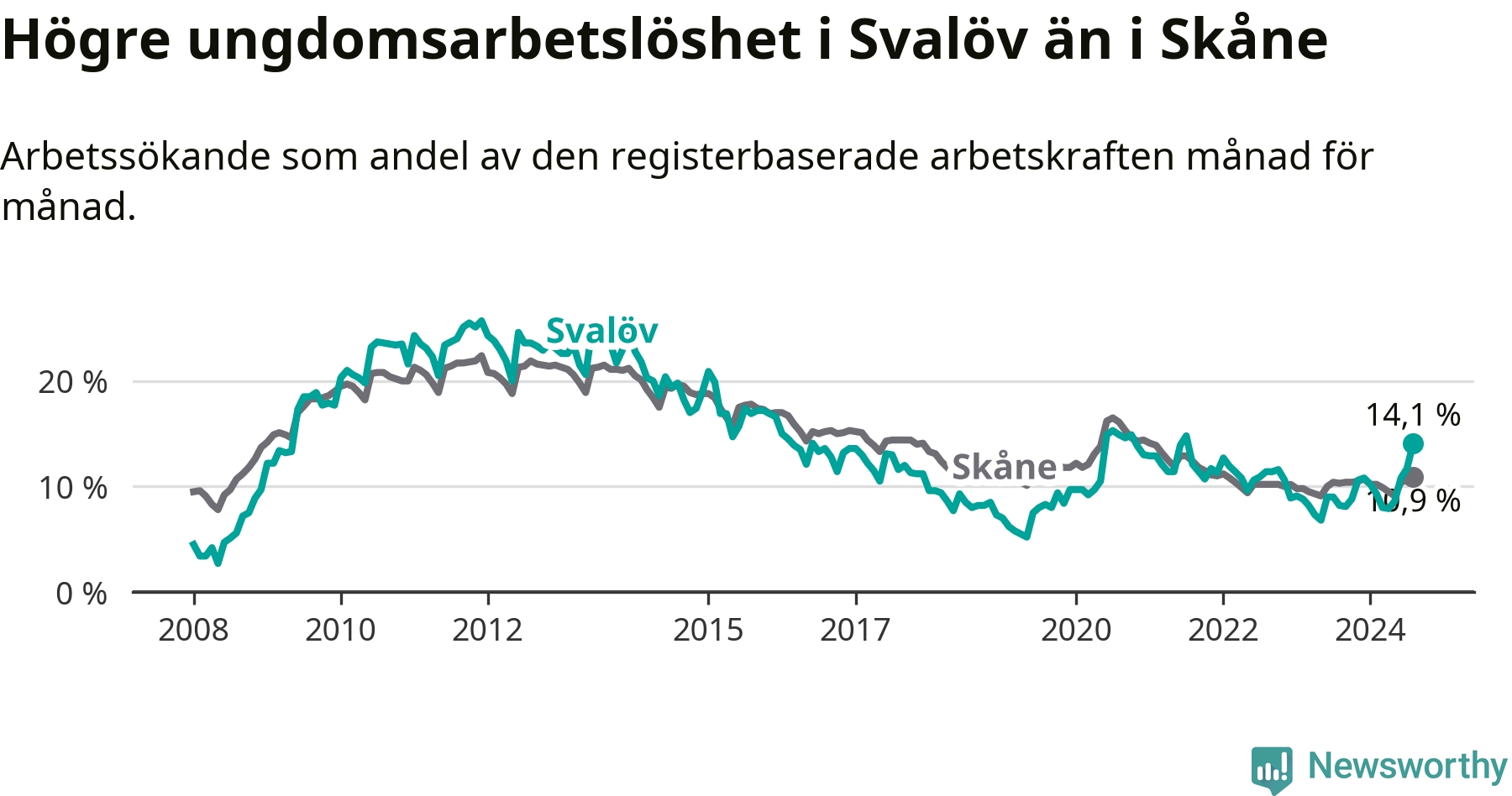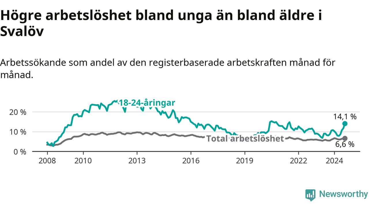 Medan Svalöv har lägre total arbetslöshet än Skåne, ligger ungdomsarbetslösheten 3,2 procentenheter högre i Svalöv.