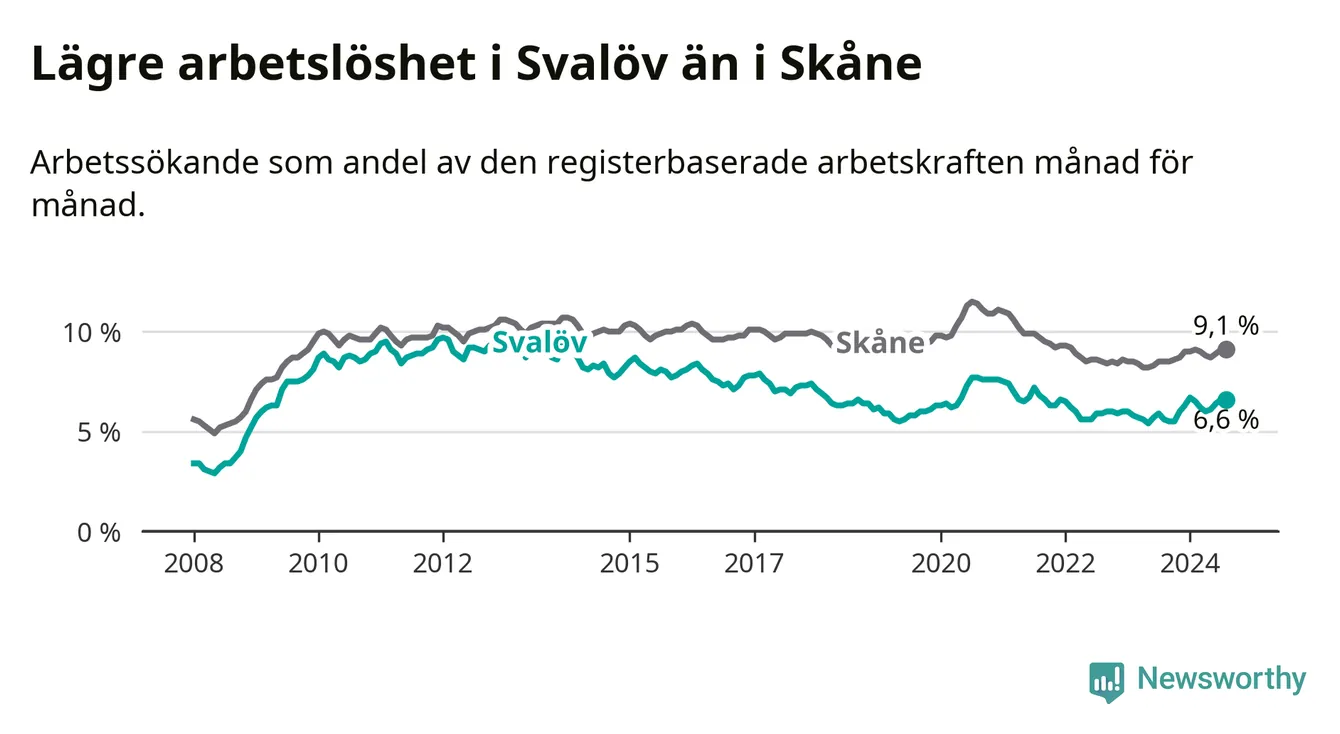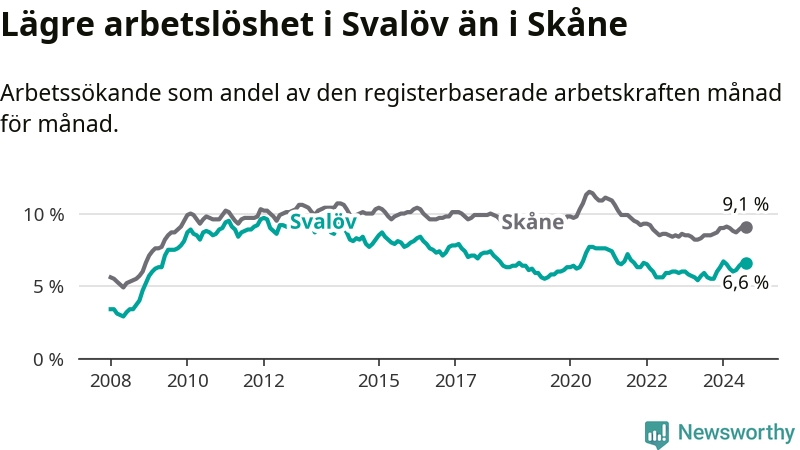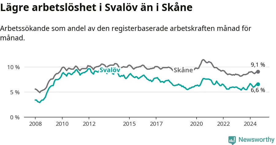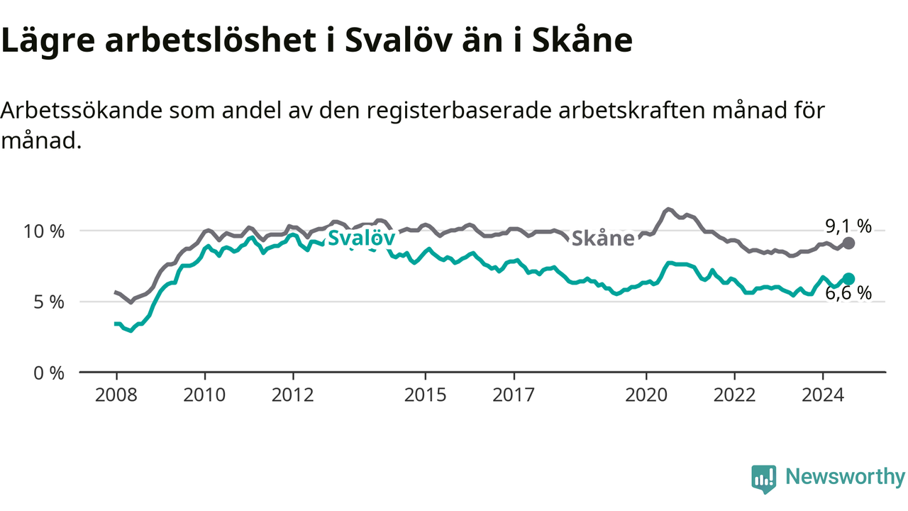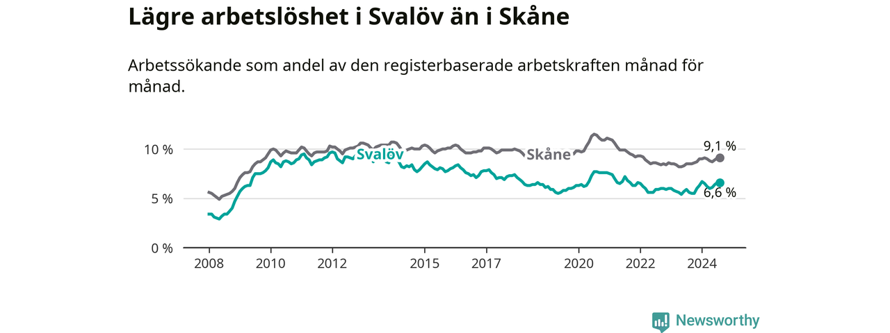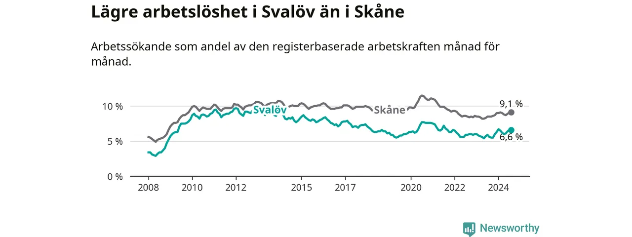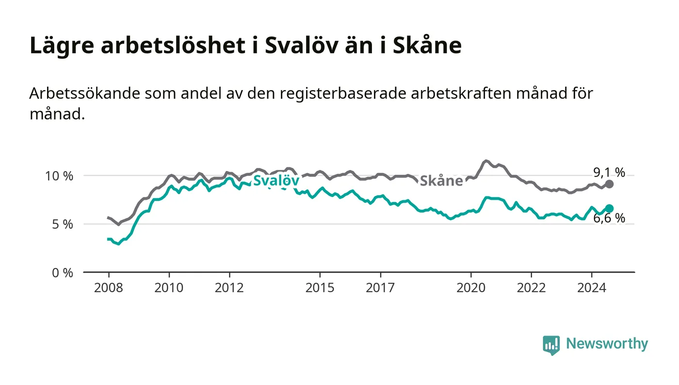 Det är tionde månaden i följd som arbetslösheten i Svalöv är högre än den var under samma tidpunkt året innan. Sedan oktober 2023 har arbetslösheten gått upp från 5,5 till 6,6 procent.