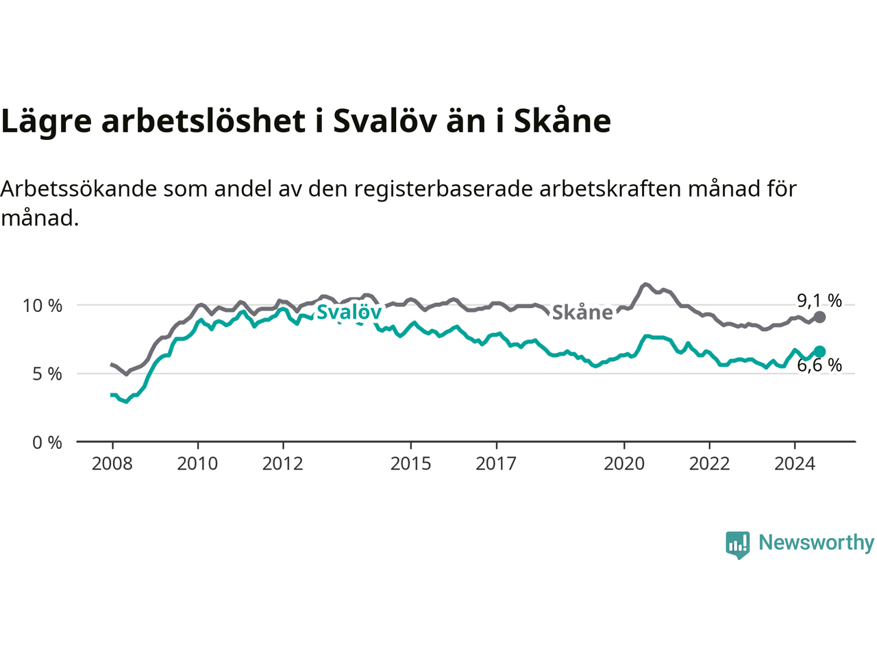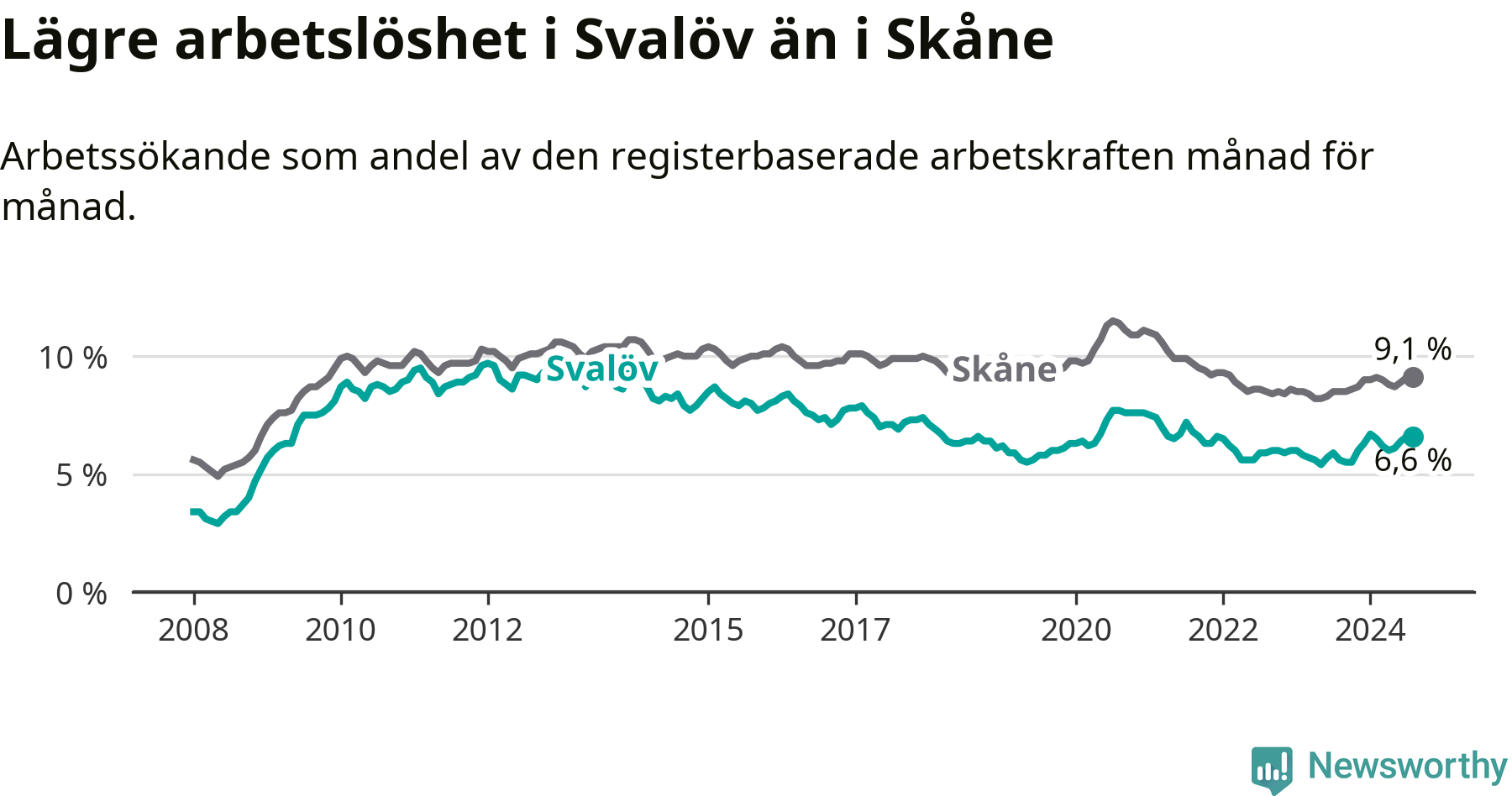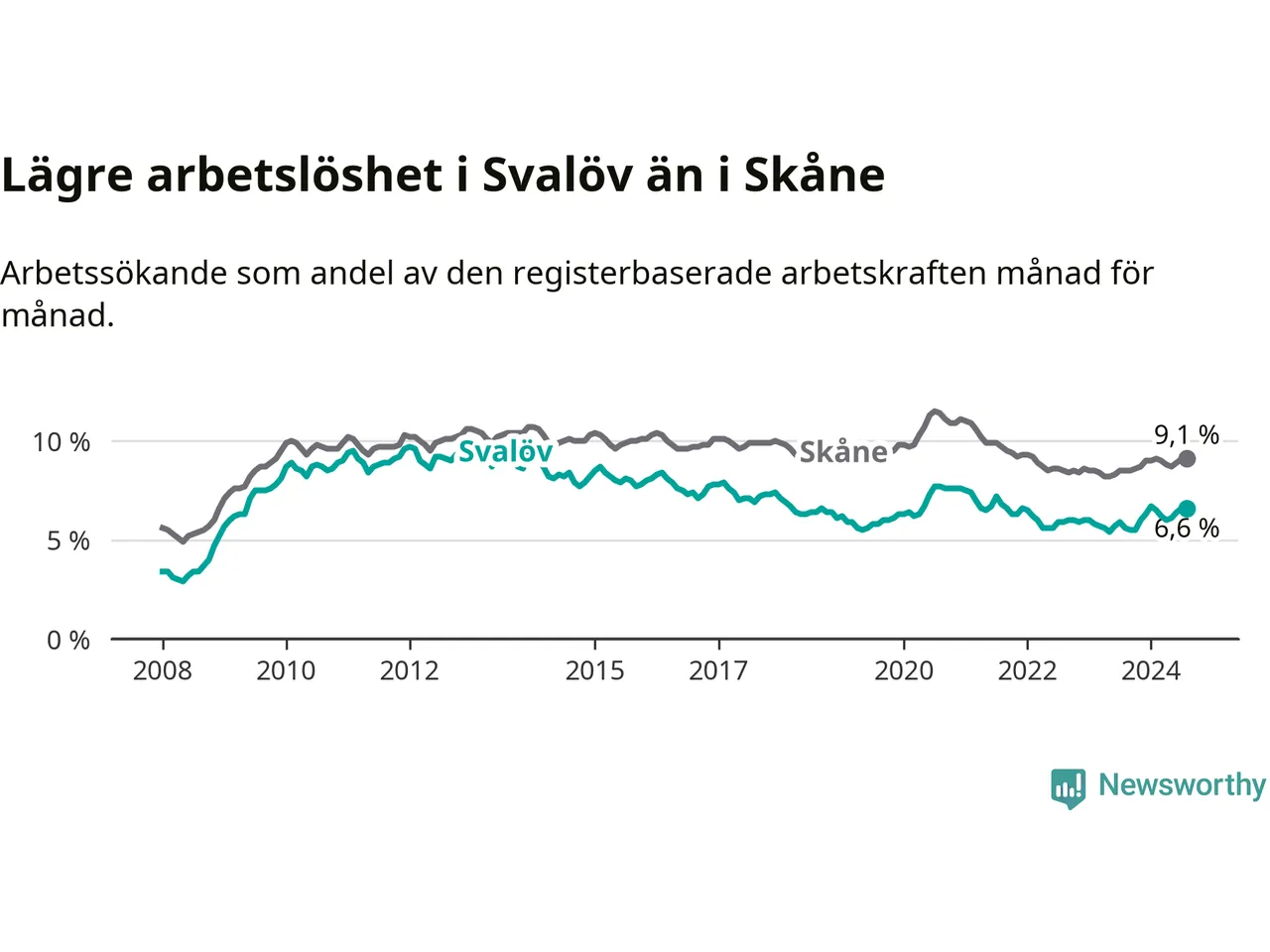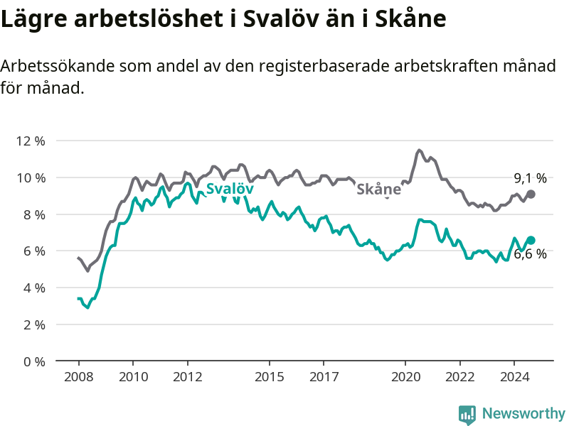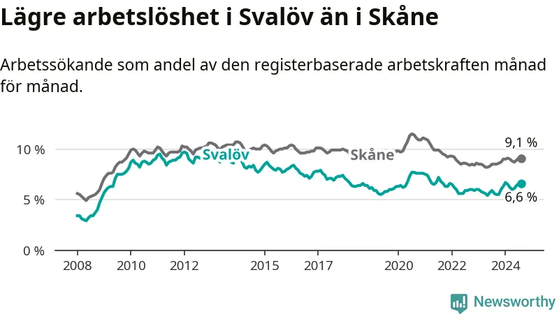 Det är tionde månaden i följd som arbetslösheten i Svalöv är högre än den var under samma tidpunkt året innan. Sedan oktober 2023 har arbetslösheten gått upp från 5,5 till 6,6 procent.