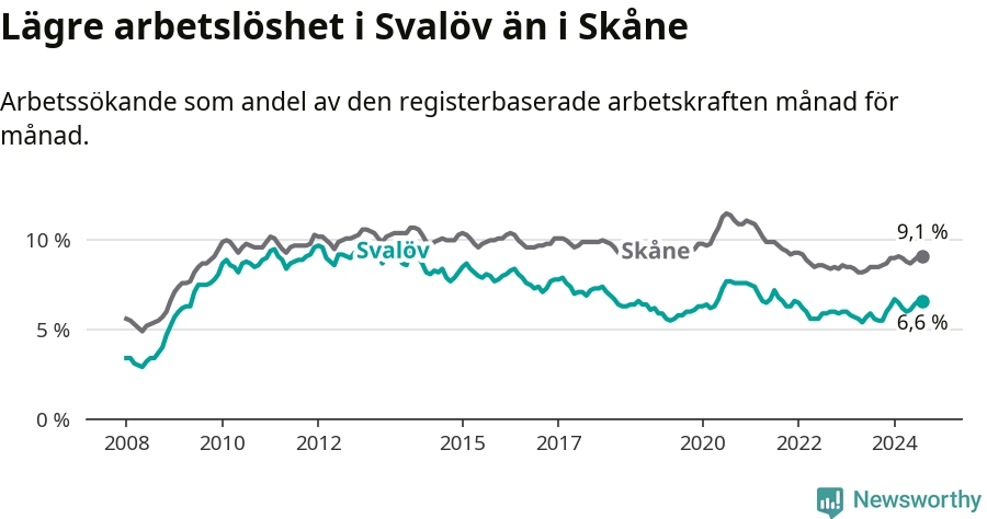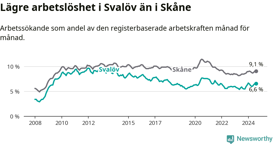Under augusti månad rapporterade Svalövs kommun en total arbetslöshet på 6,6 procent. Det är en ökning jämfört med samma tidpunkt i fjol (+1,0 procentenheter). Även i Skåne län stiger arbetslösheten .