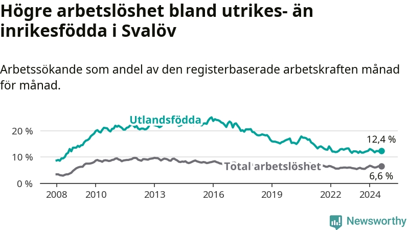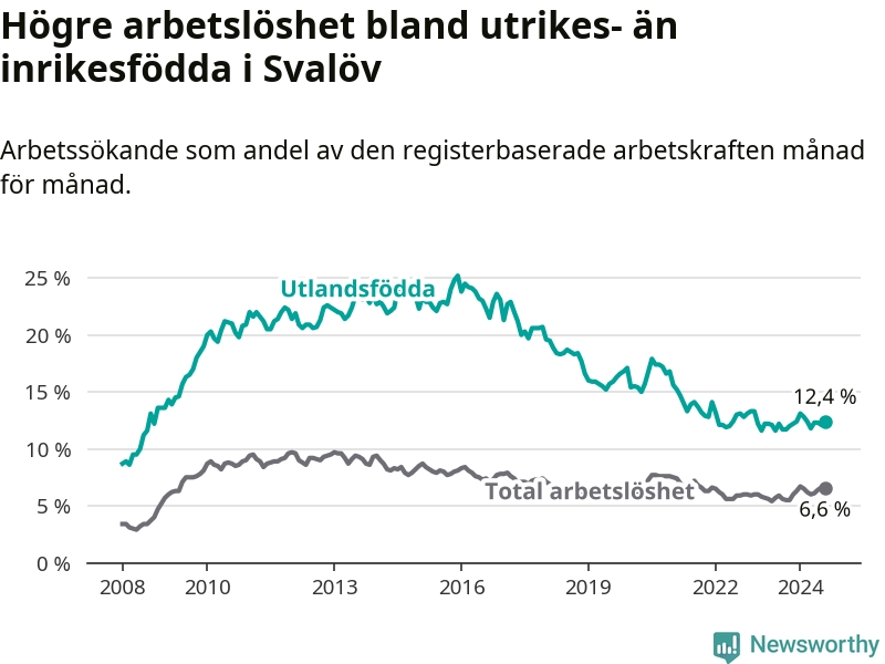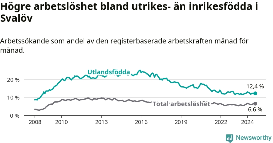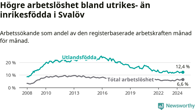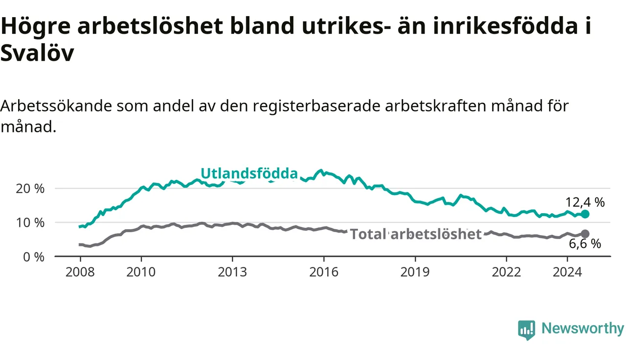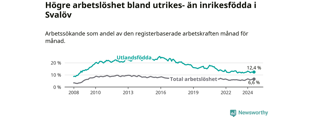 Arbetslösheten bland utlandsfödda var 12,4 procent i Svalöv under augusti månad, motsvarande 198 av 1 597 personer. Det är 0,7 procentenheter fler än vid samma tidpunkt i fjol (+12 om man räknar personer). Den senaste månadens uppgång innebär ett trendbrott. Under de ett föregående månaderna hade arbetslösheten bland utlandsfödda varit lägre än motsvarande tidpunkt året innan.