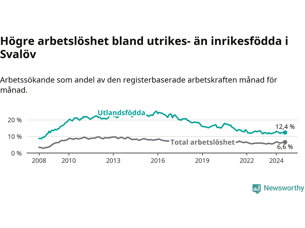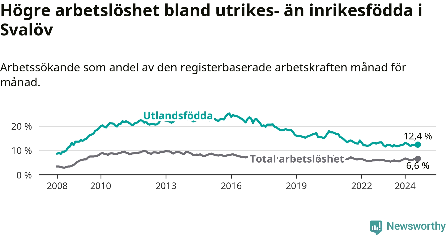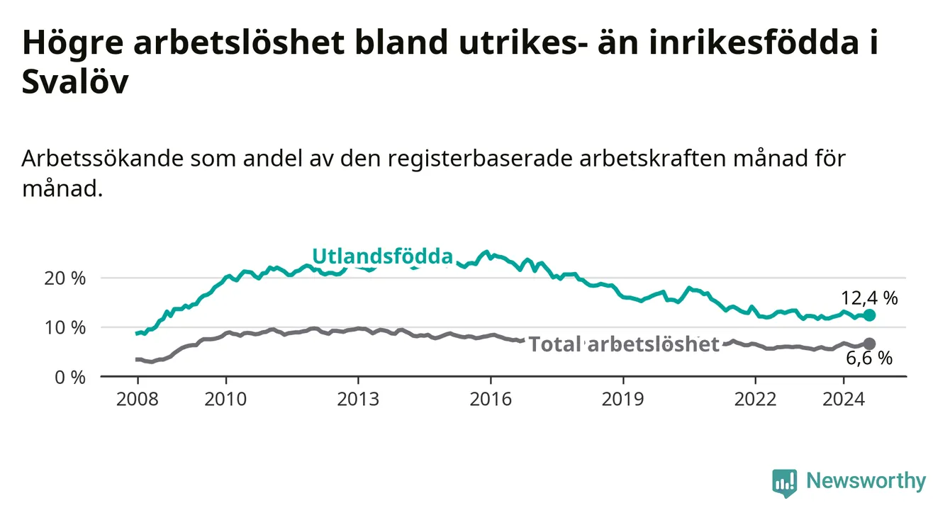 Arbetslösheten bland utlandsfödda var 12,4 procent i Svalöv under augusti månad, motsvarande 198 av 1 597 personer. Det är 0,7 procentenheter fler än vid samma tidpunkt i fjol (+12 om man räknar personer). Den senaste månadens uppgång innebär ett trendbrott. Under de ett föregående månaderna hade arbetslösheten bland utlandsfödda varit lägre än motsvarande tidpunkt året innan.