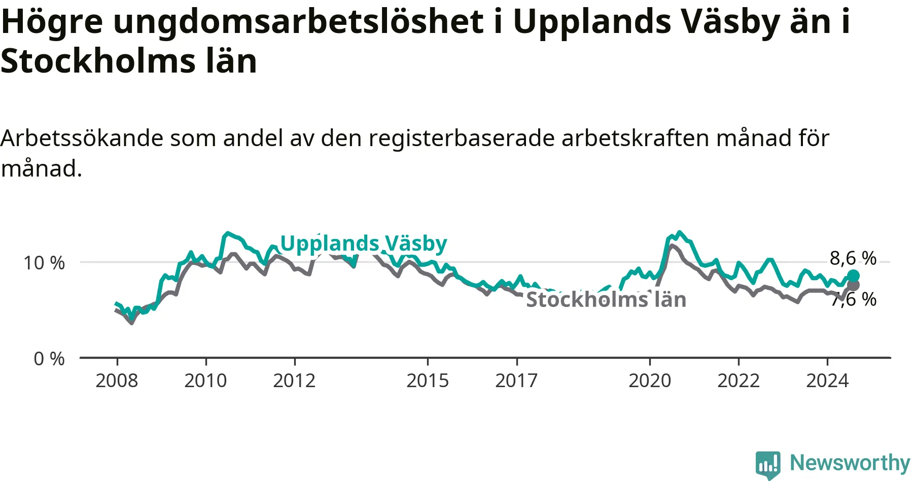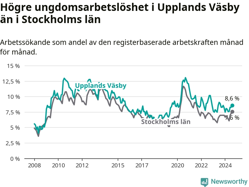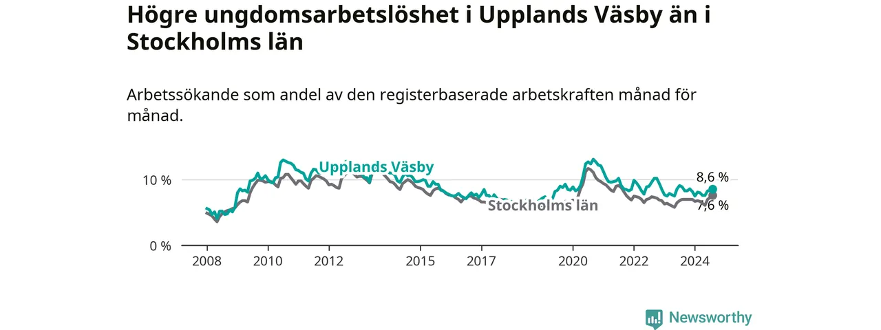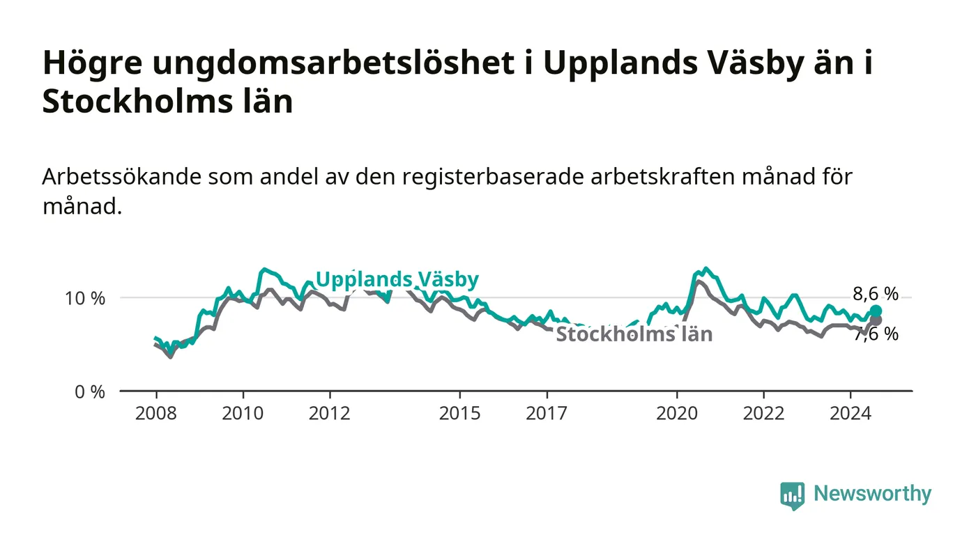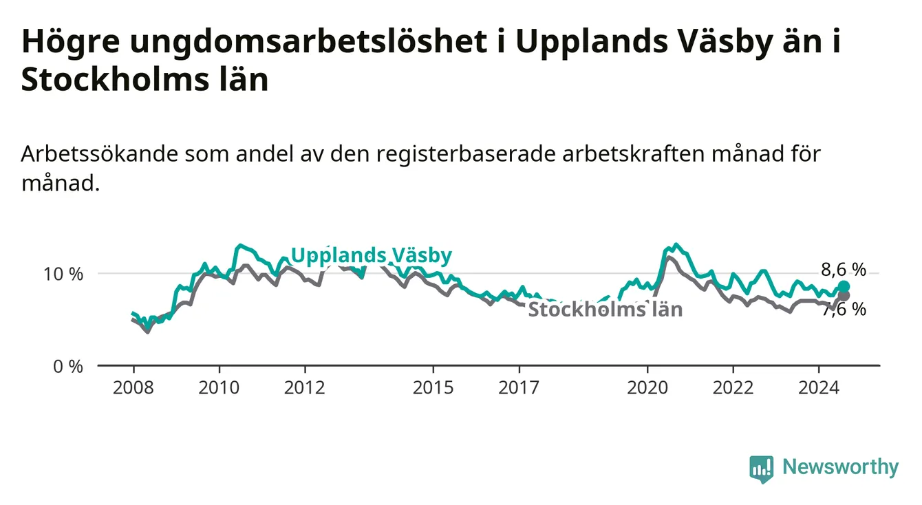 Graf: Arbetslöshet bland unga i Upplands Väsby kommun och Stockholms län
