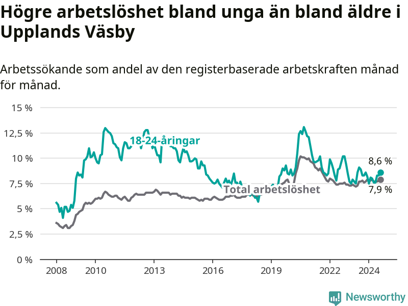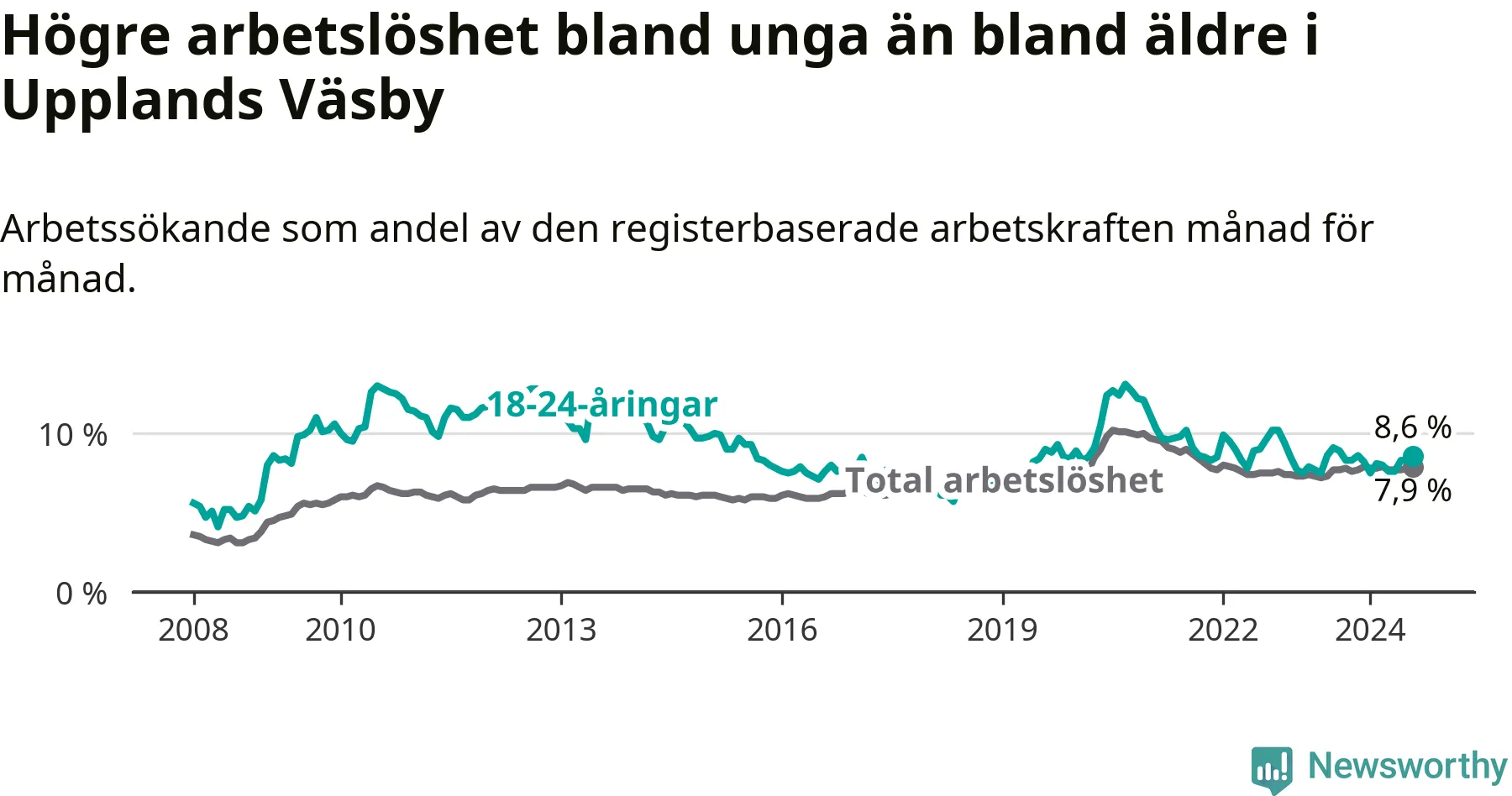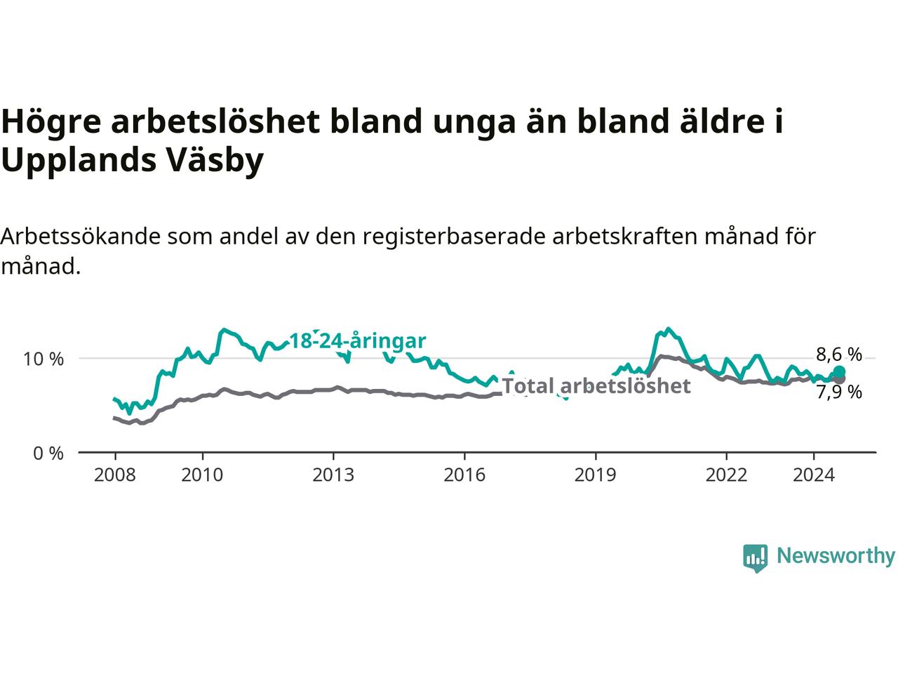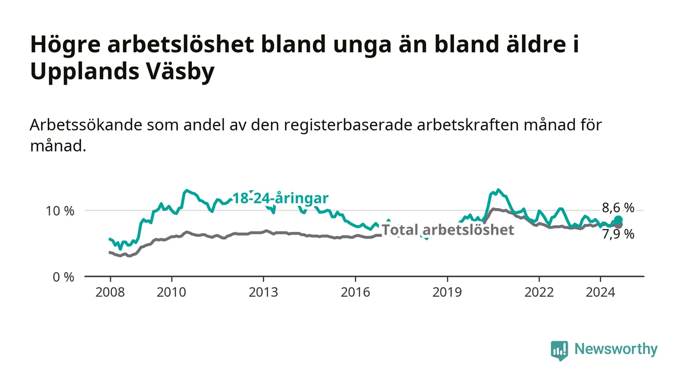 Graf: Arbetslöshet bland unga i Upplands Väsby kommun och Stockholms län