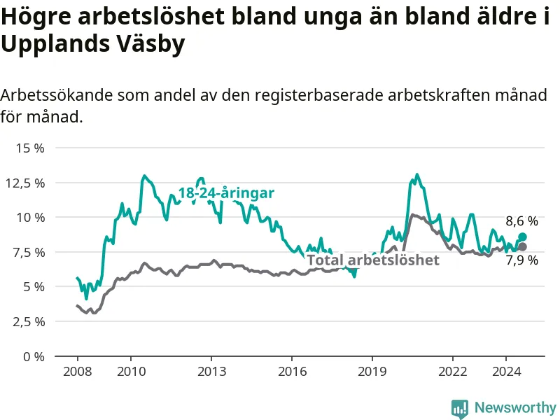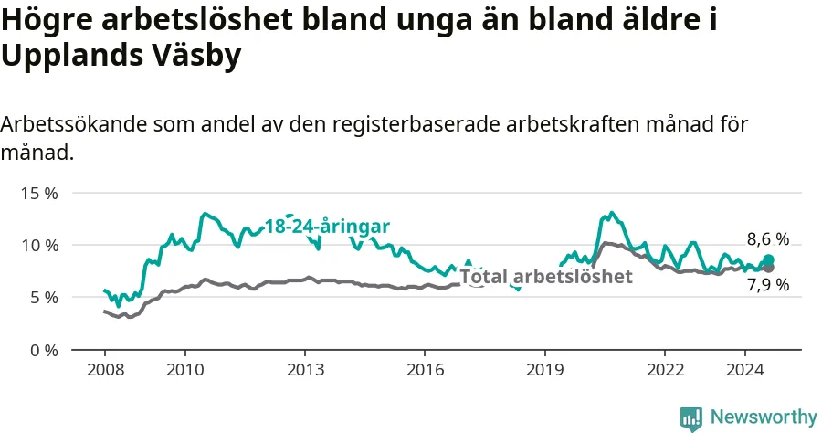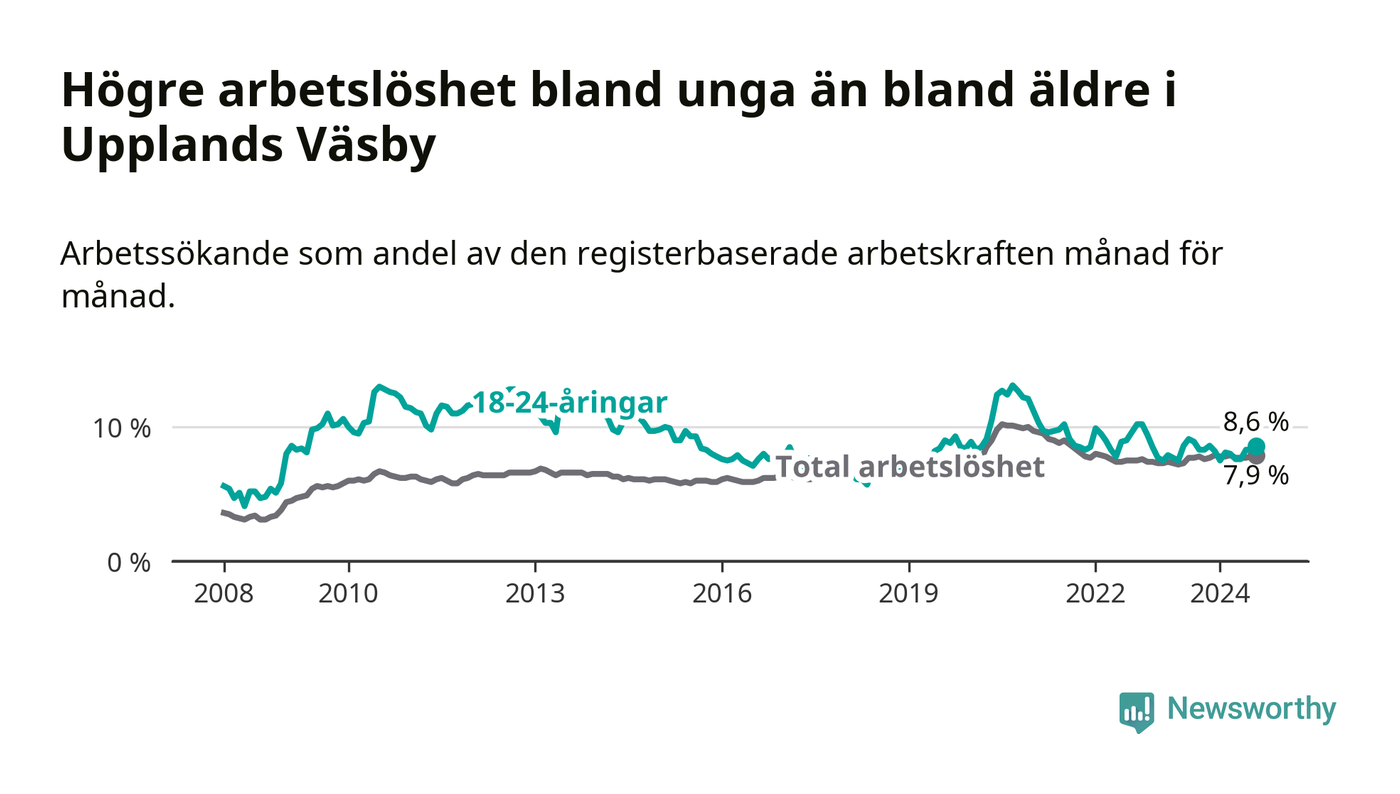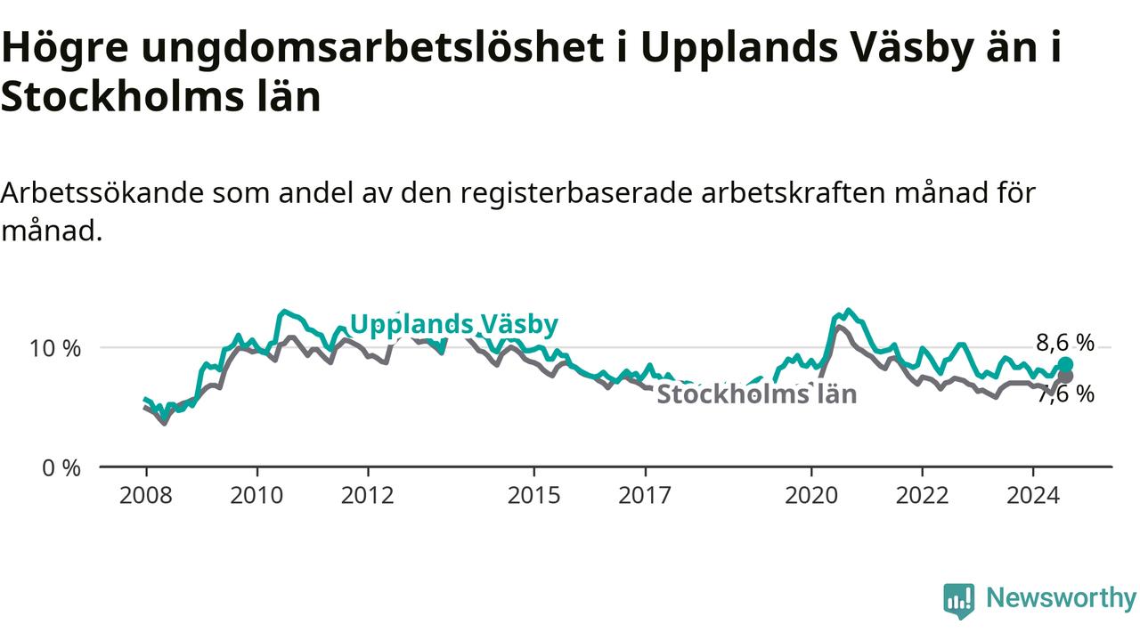 Precis som den totala arbetslösheten ligger ungdomsarbetslösheten i Upplands Väsby högre än i Stockholms län som helhet. Skillnaden mellan kommunen och länet är 1,0 procentenheter.