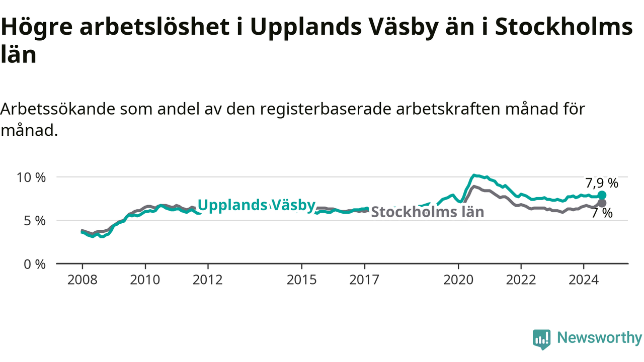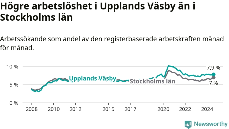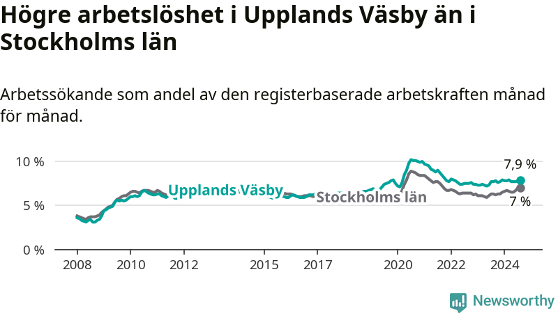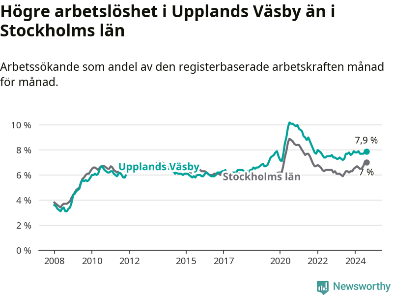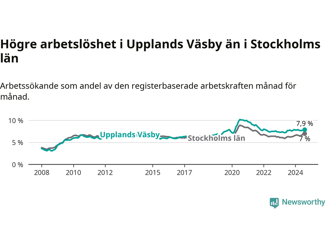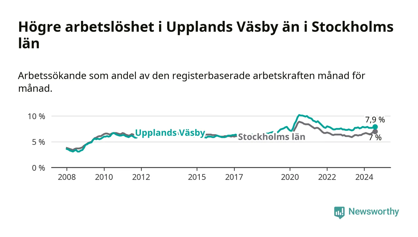 Upplands Väsby hade redan tidigare högre arbetslöshet än snittet i hela Stockholms län och nu växer klyftan (7,9 procent i kommunen, jämfört med 7,0 procent i hela länet). Ekerö har den lägsta arbetslösheten i länet (3,4 procent), medan Södertälje har den högsta (11,1 procent). För att Upplands Väsby skulle komma ner i samma arbetslöshetsnivå som Ekerö skulle 1 168 personer behöva sysselsättas.