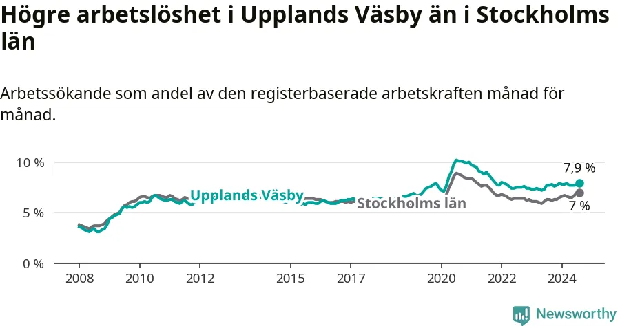 Under augusti månad rapporterade Upplands Väsby kommun en total arbetslöshet på 7,9 procent. Det är en ökning jämfört med samma tidpunkt i fjol (+0,2 procentenheter). Även i Stockholms län stiger arbetslösheten .