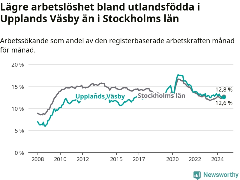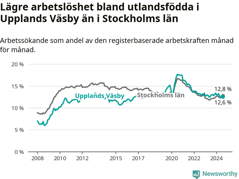 Graf: Arbetslöshet bland utrikesfödda i Upplands Väsby kommun och Stockholms län