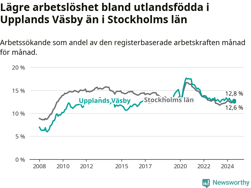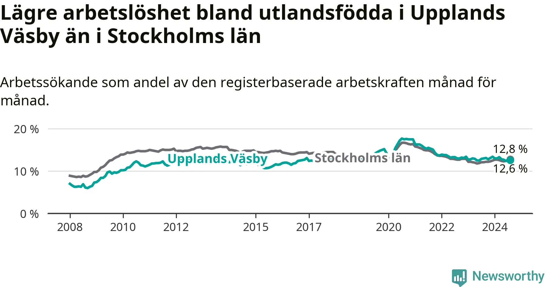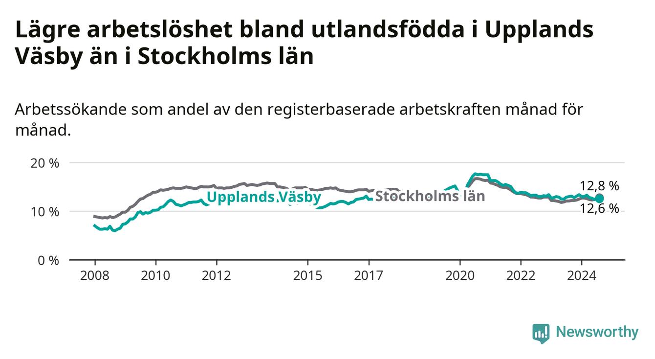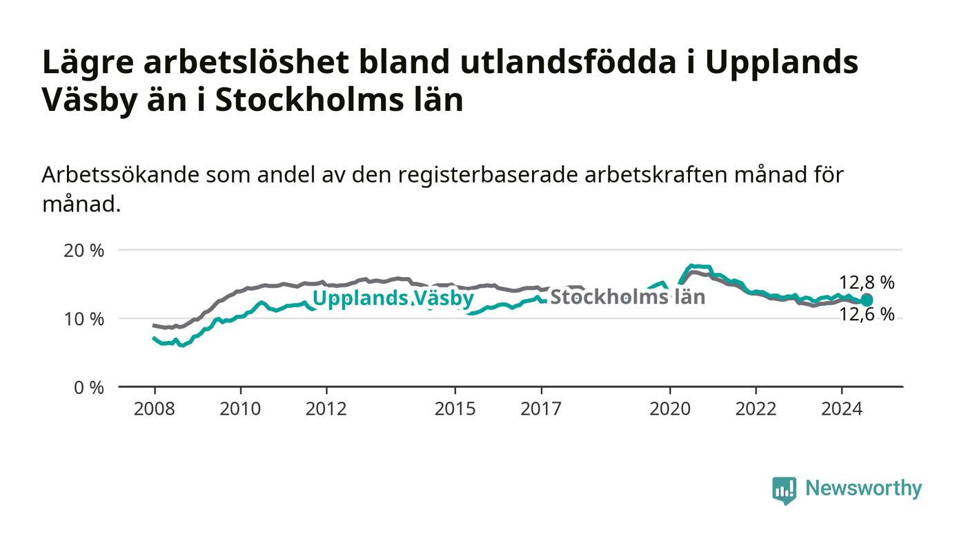 Medan arbetslösheten bland utlandsfödda alltså minskar i Upplands Väsby så ökar den i Stockholms län. Jämfört med augusti förra året har andelen arbetslösa utlandsfödda i länet ökat med 0,7 procentenheter (till 12,8 procent).