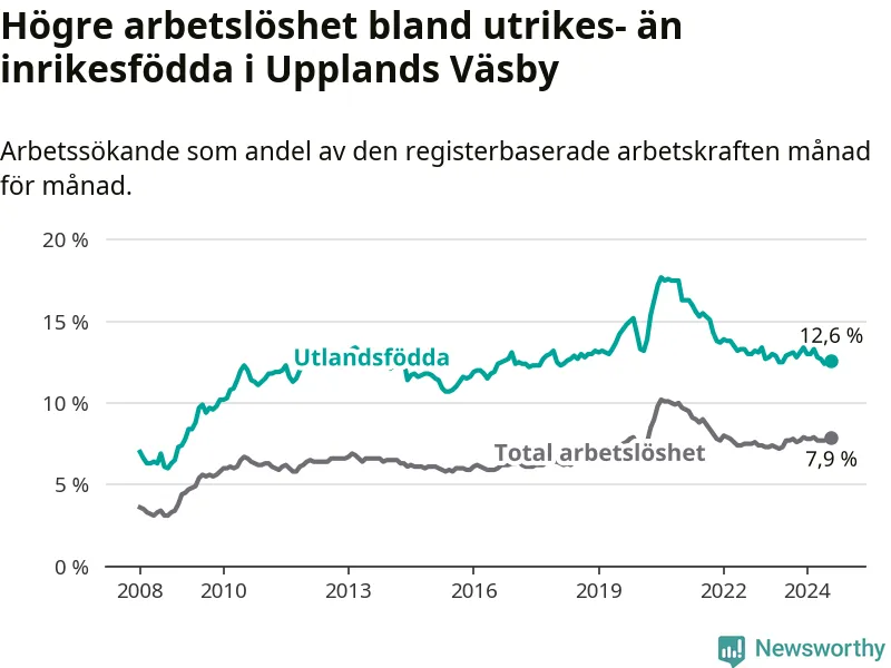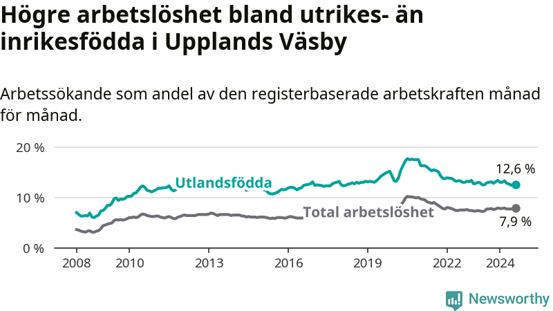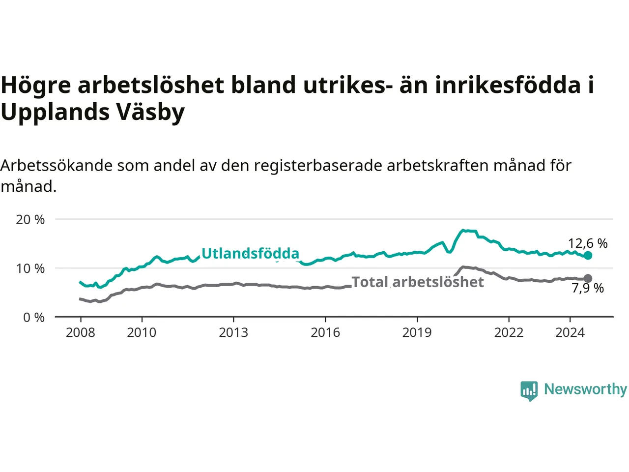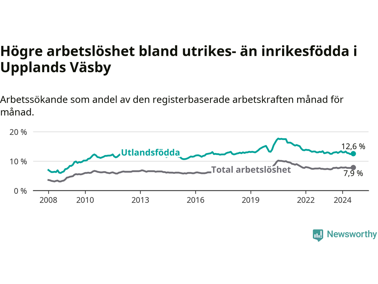 Arbetslösheten bland utlandsfödda var 12,6 procent i Upplands Väsby under augusti månad, motsvarande 1 391 av 11 040 personer. Det är 0,4 procentenheter färre än vid samma tidpunkt i fjol (+67 om man räknar personer).