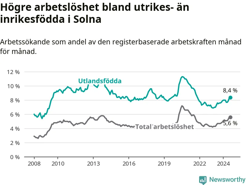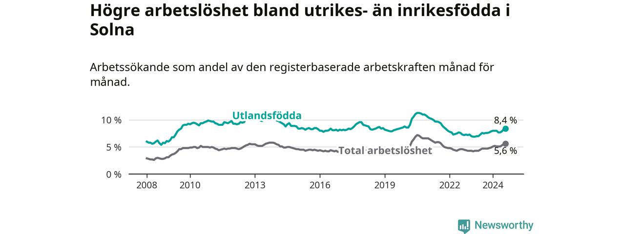 Arbetslösheten bland utlandsfödda var 8,4 procent i Solna under augusti månad, motsvarande 1 499 av 17 845 personer. Det är 0,9 procentenheter fler än vid samma tidpunkt i fjol (+214 om man räknar personer). Därmed är de utlandsföddas arbetslöshet högre än vid samma tidpunkt i fjol för 13:e månaden i följd.