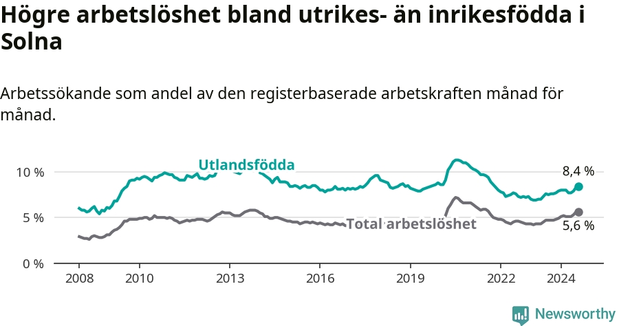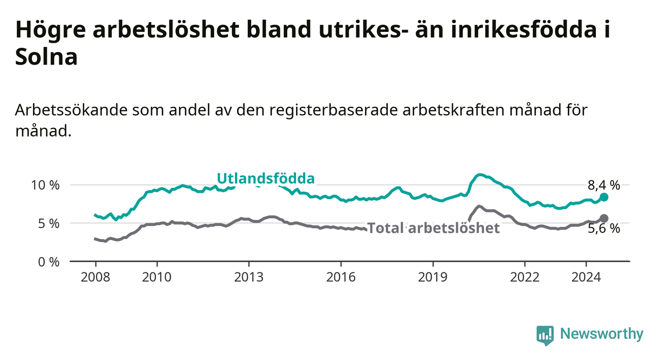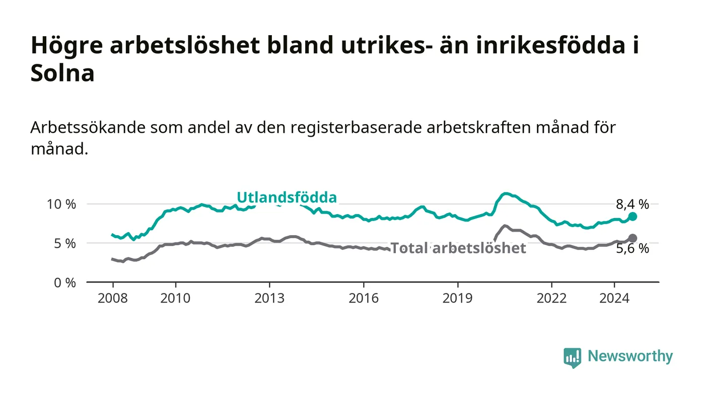 Skillnaden i arbetslöshet mellan utrikesfödda och hela befolkningen är 2,8 procentenheter i Solna. Det är ungefär samma skillnad som för ett år sedan.