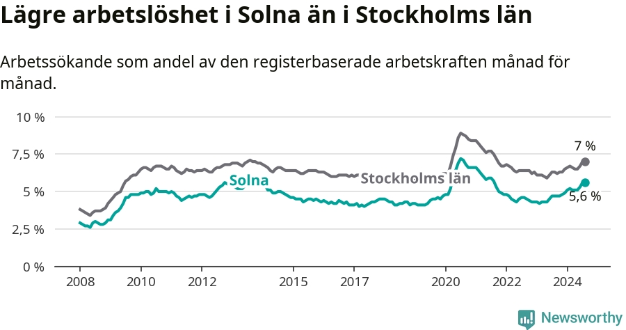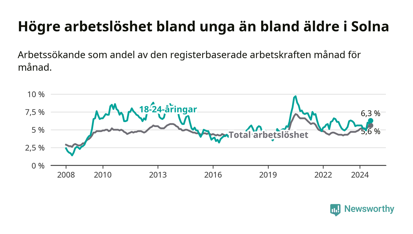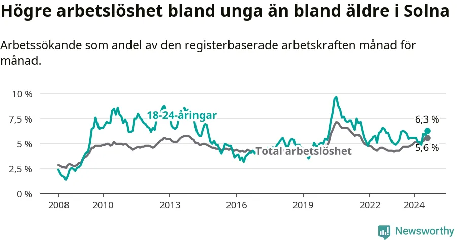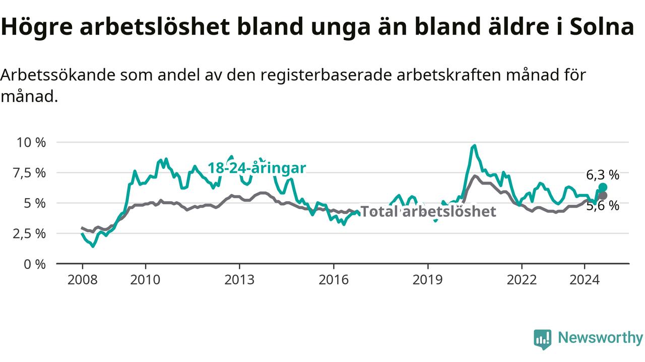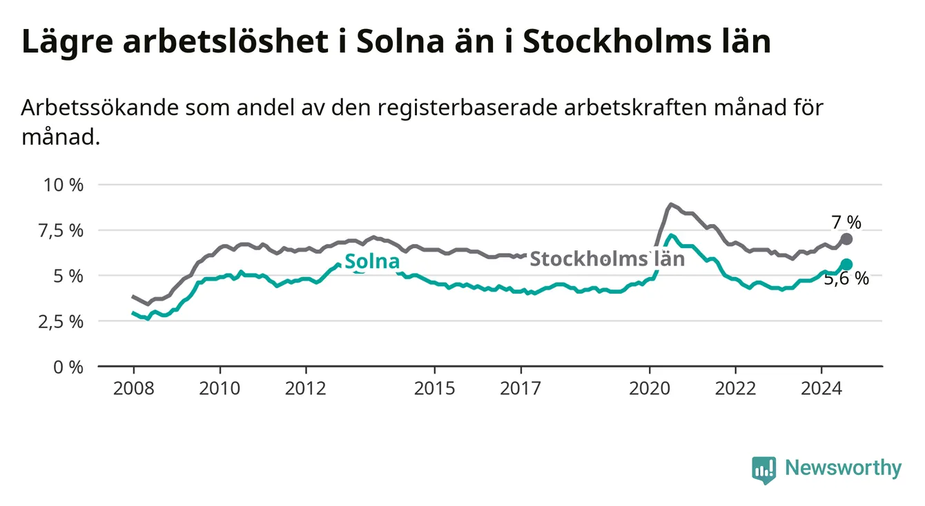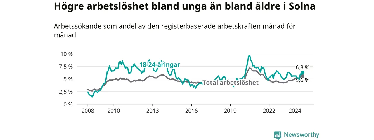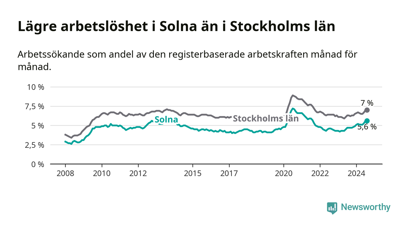 Det är 14:e månaden i följd som arbetslösheten i Solna är högre än den var under samma tidpunkt året innan. Sedan juni 2023 har arbetslösheten gått upp från 4,5 till 5,6 procent.