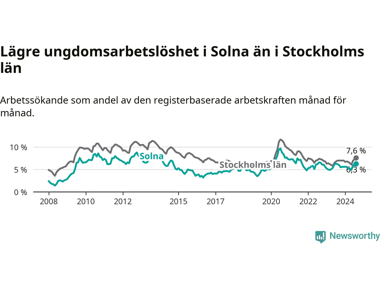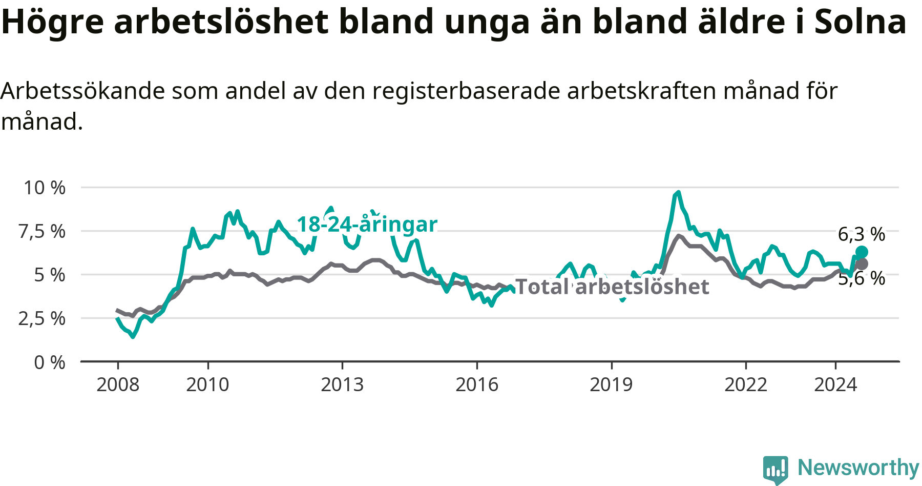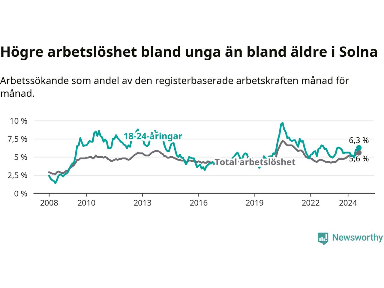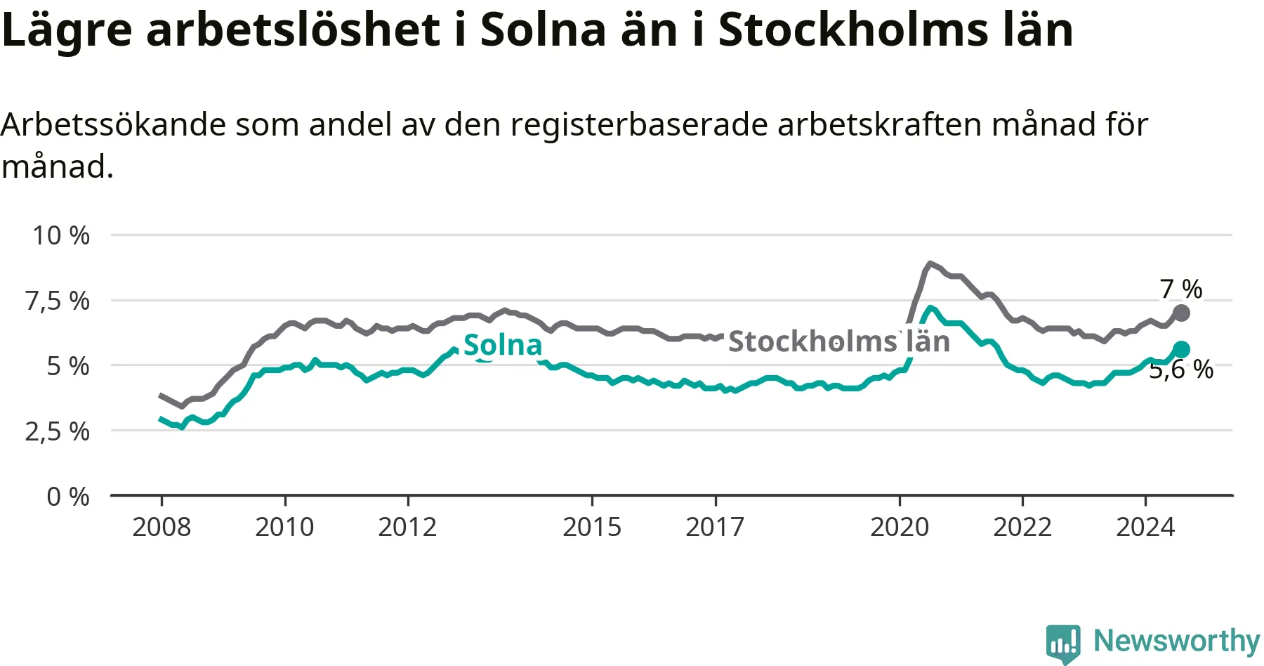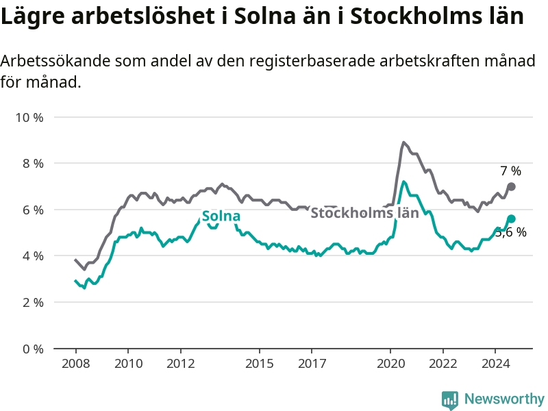 Det är 14:e månaden i följd som arbetslösheten i Solna är högre än den var under samma tidpunkt året innan. Sedan juni 2023 har arbetslösheten gått upp från 4,5 till 5,6 procent.