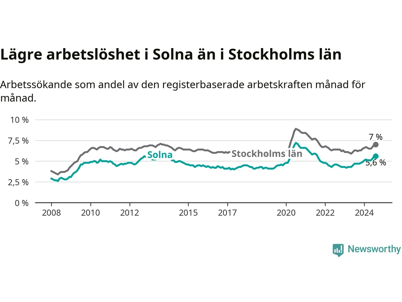 Även om arbetslösheten i Solna alltså ökar, så ligger den fortfarande under snittet i hela Stockholms län (5,6 procent i kommunen, jämfört med 7,0 procent i hela länet). Ekerö har den lägsta arbetslösheten i länet (3,4 procent), medan Södertälje har den högsta (11,1 procent). För att Solna skulle komma ner i samma arbetslöshetsnivå som Ekerö skulle 1 047 personer behöva sysselsättas.