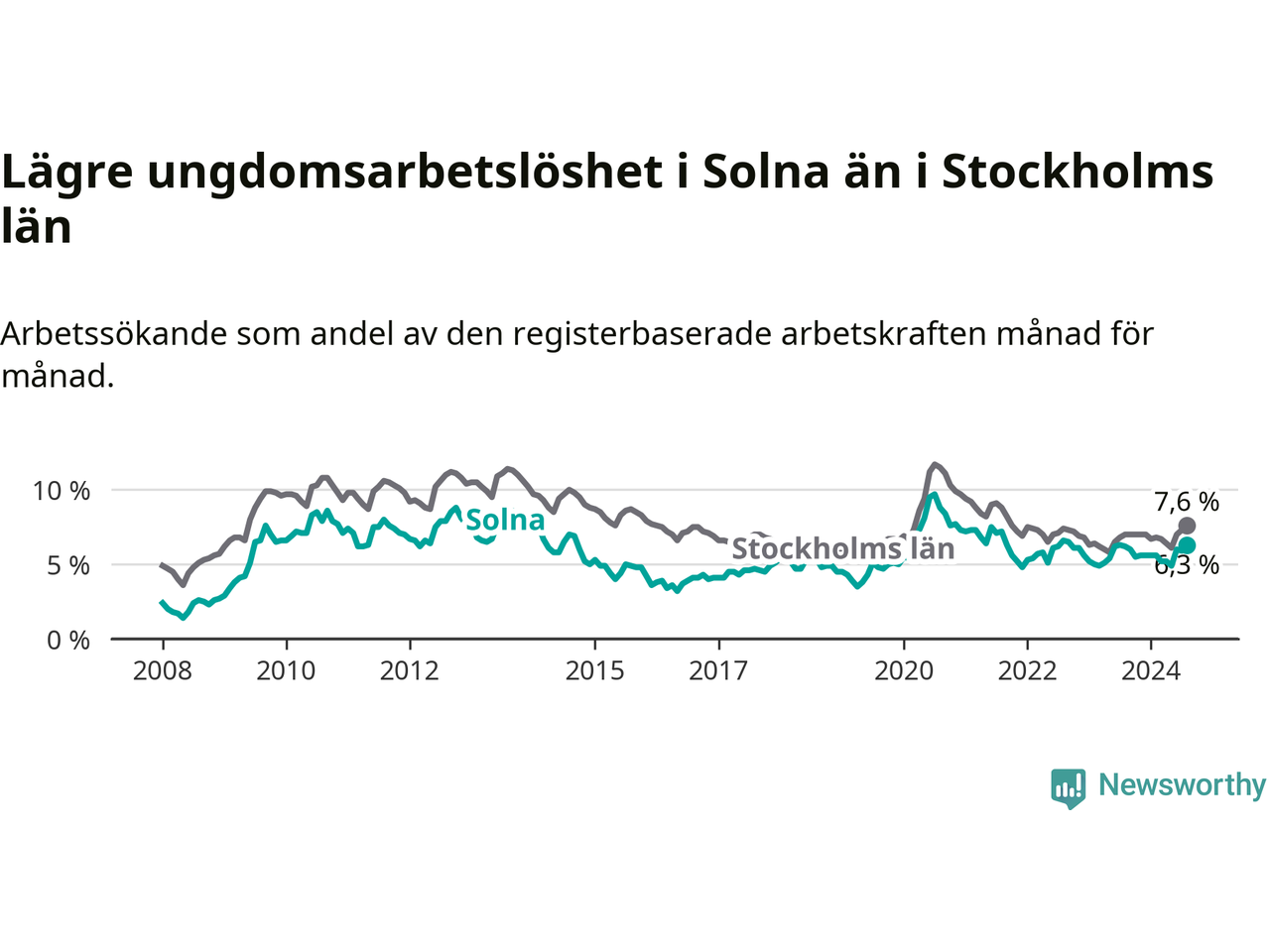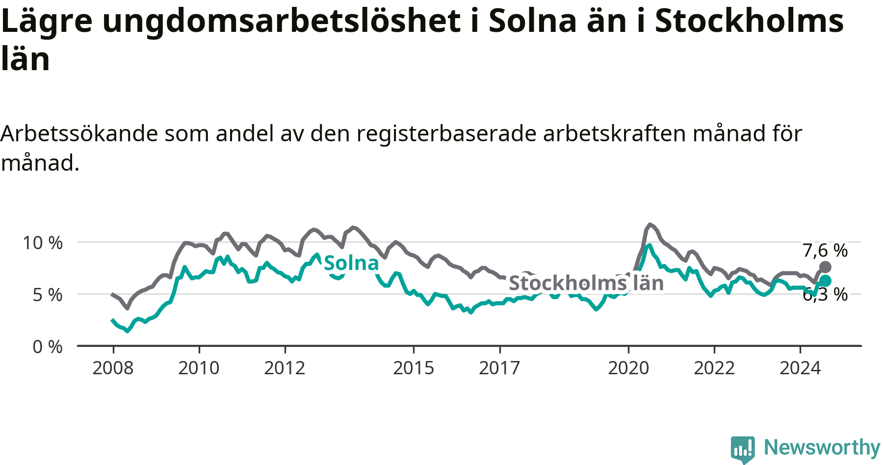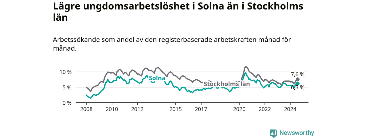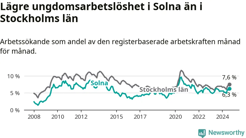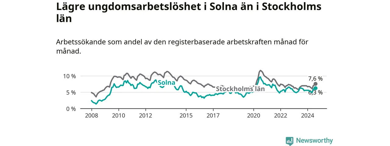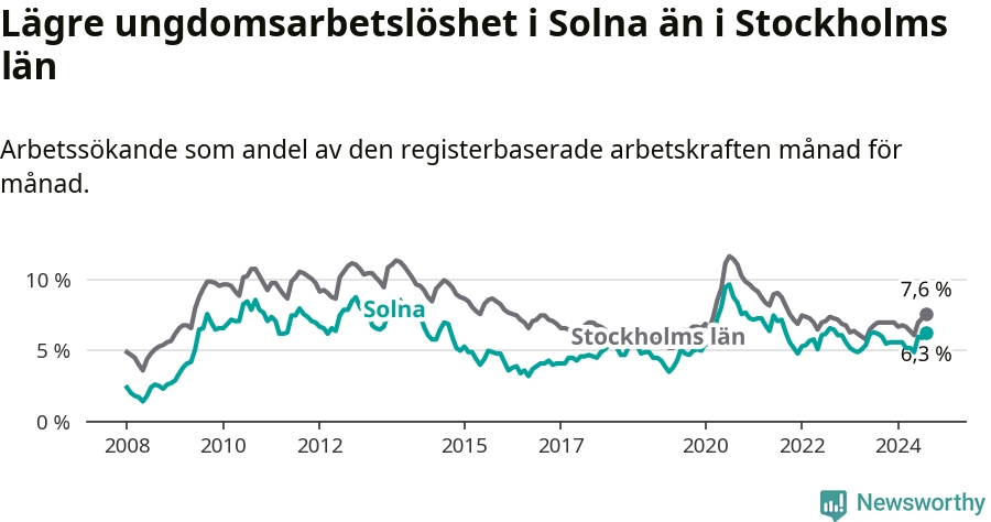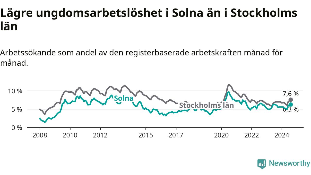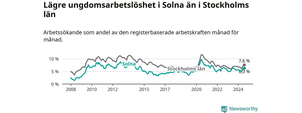 Precis som den totala arbetslösheten ligger ungdomsarbetslösheten i Solna lägre än i Stockholms län som helhet. Skillnaden mellan kommunen och länet är 1,3 procentenheter.