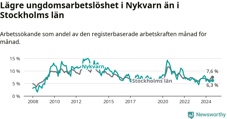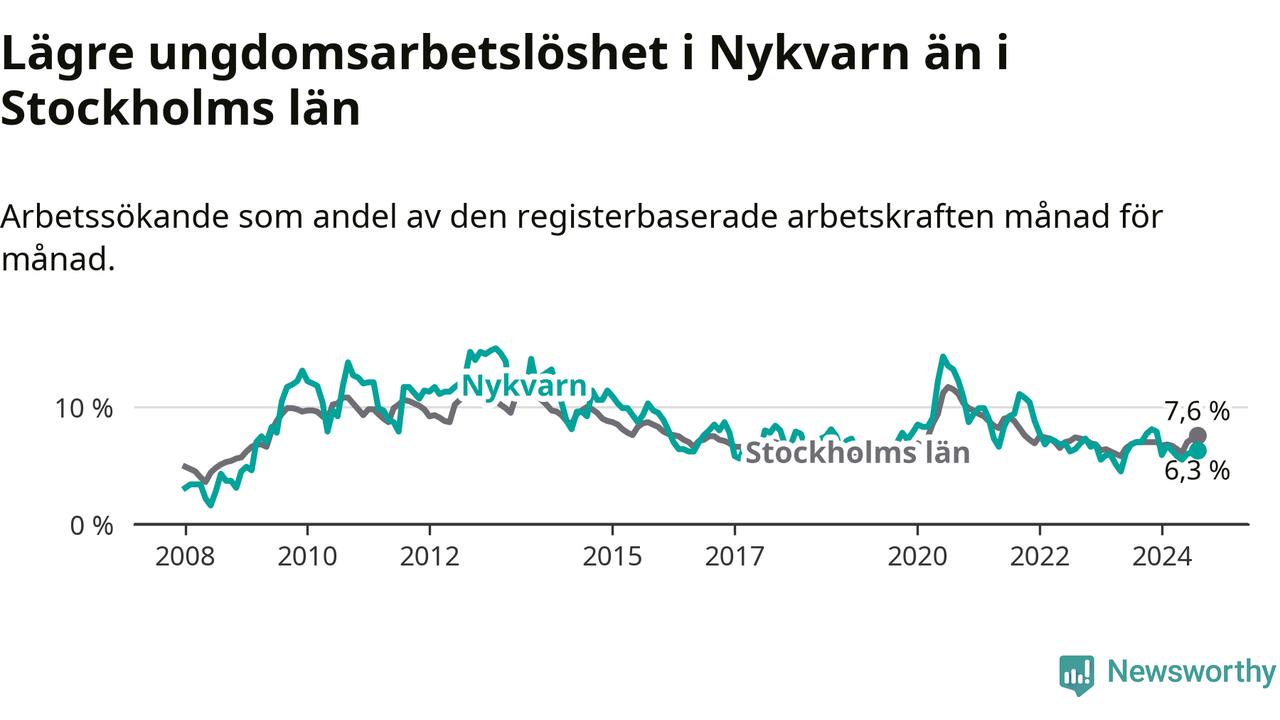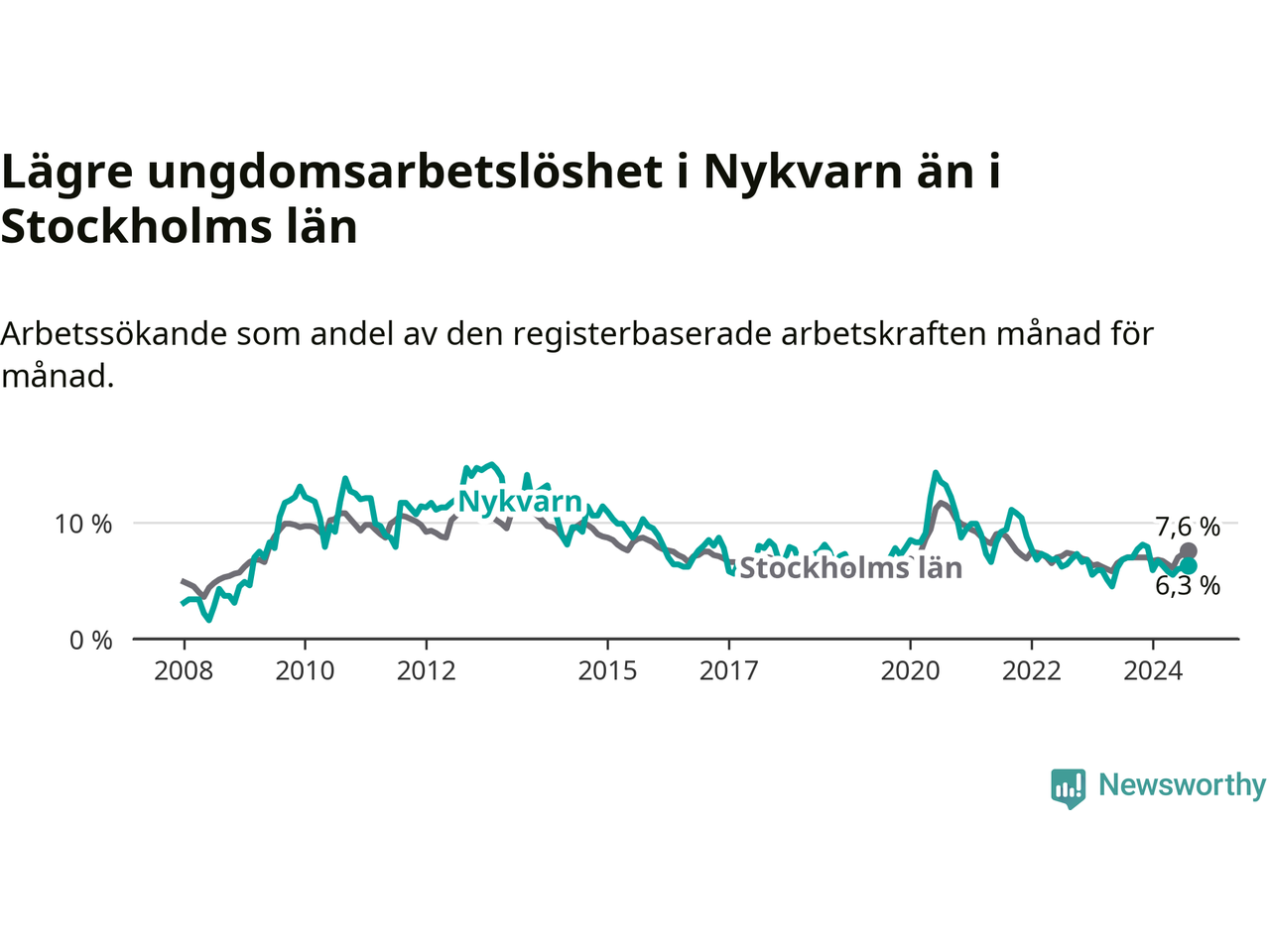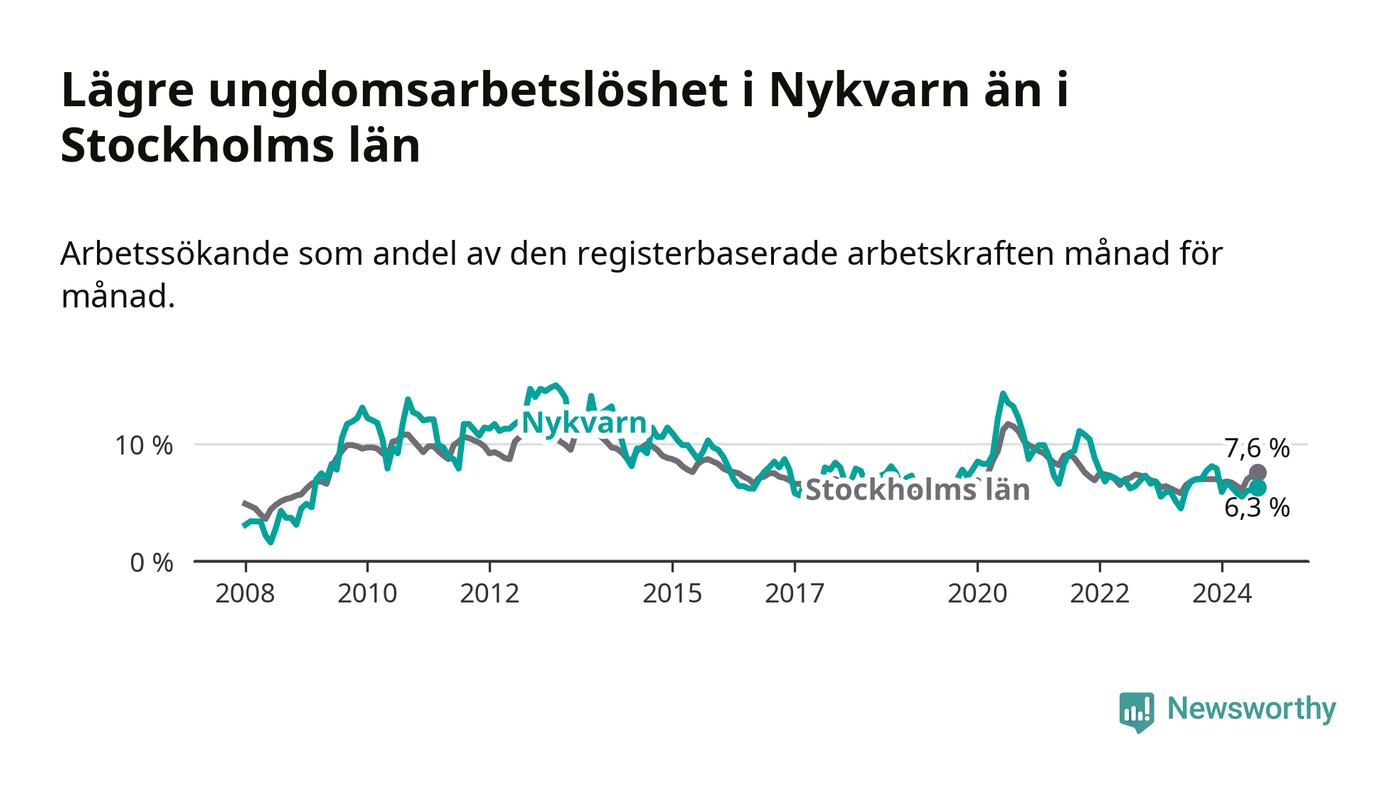 Precis som den totala arbetslösheten ligger ungdomsarbetslösheten i Nykvarn lägre än i Stockholms län som helhet. Skillnaden mellan kommunen och länet är 1,3 procentenheter.