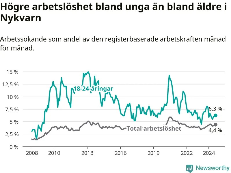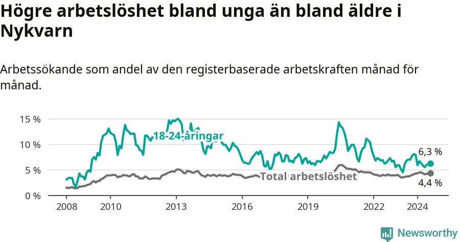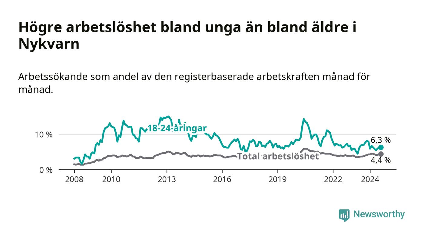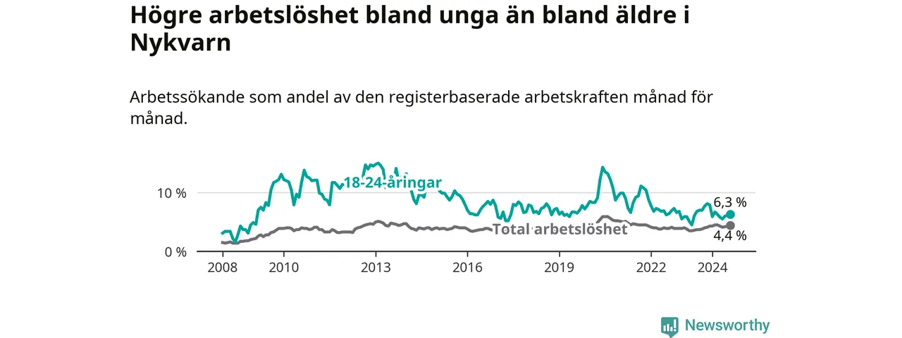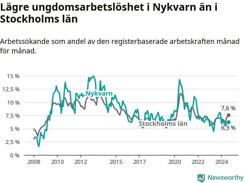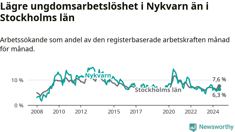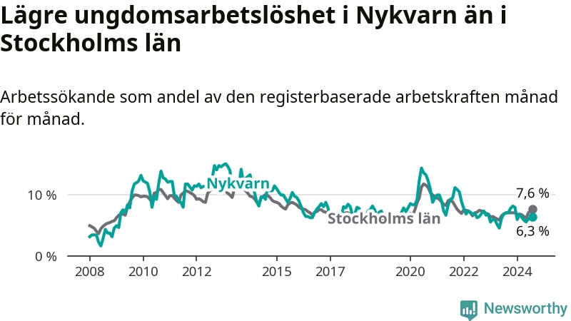 Precis som den totala arbetslösheten ligger ungdomsarbetslösheten i Nykvarn lägre än i Stockholms län som helhet. Skillnaden mellan kommunen och länet är 1,3 procentenheter.