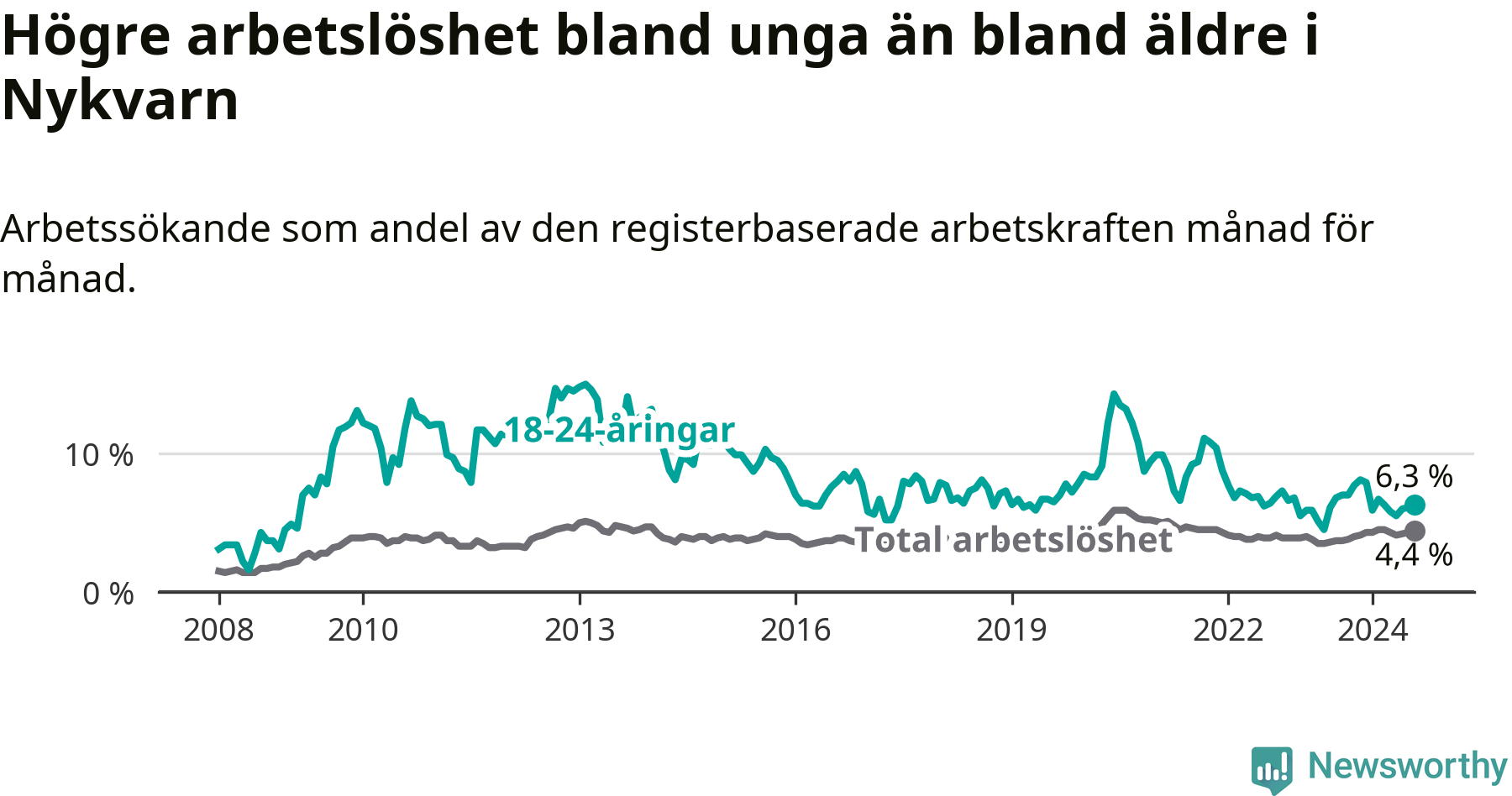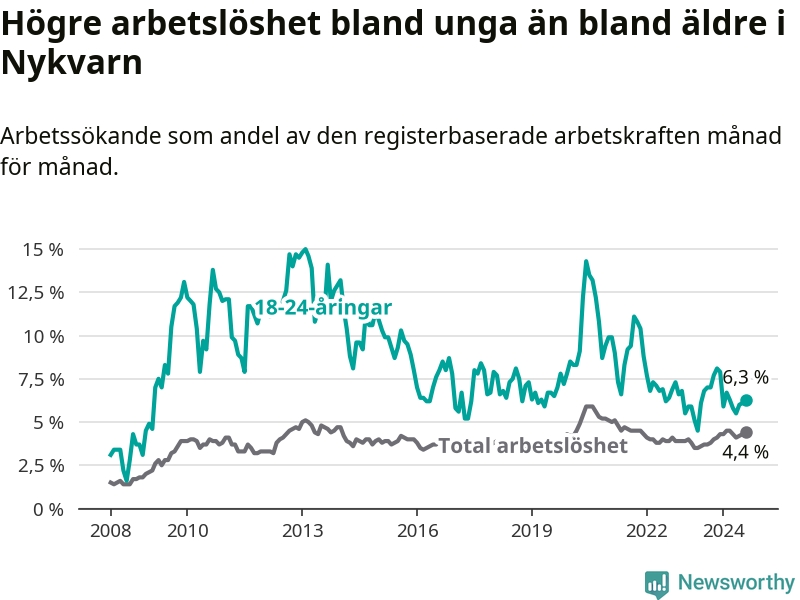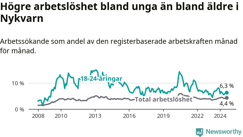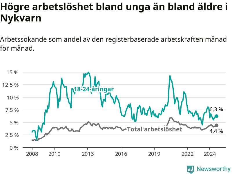 Till skillnad från den totala arbetslösheten sjunker arbetslösheten bland unga (−0,7 procentenheter). I augusti var 6,3 procent av 18–24-åringarna inskrivna som arbetssökande (motsvarande 40 personer). Mäter vi antalet inskrivna ser vi en ökning med fem personer på ett års sikt.