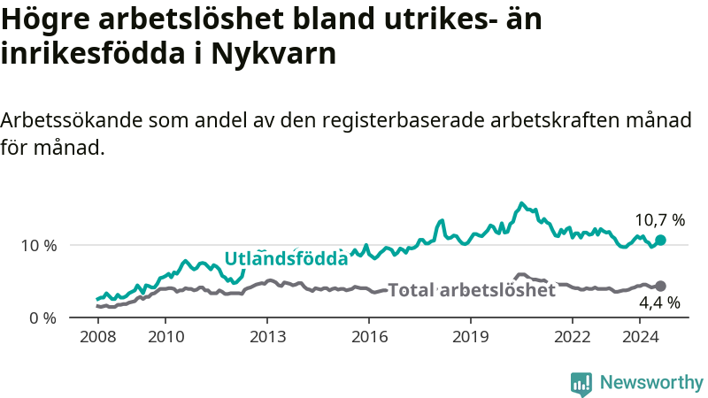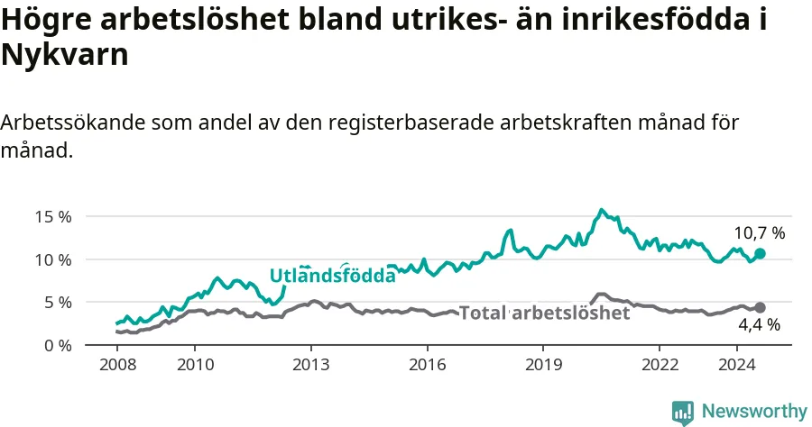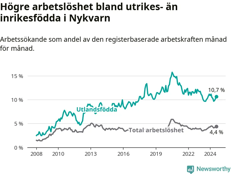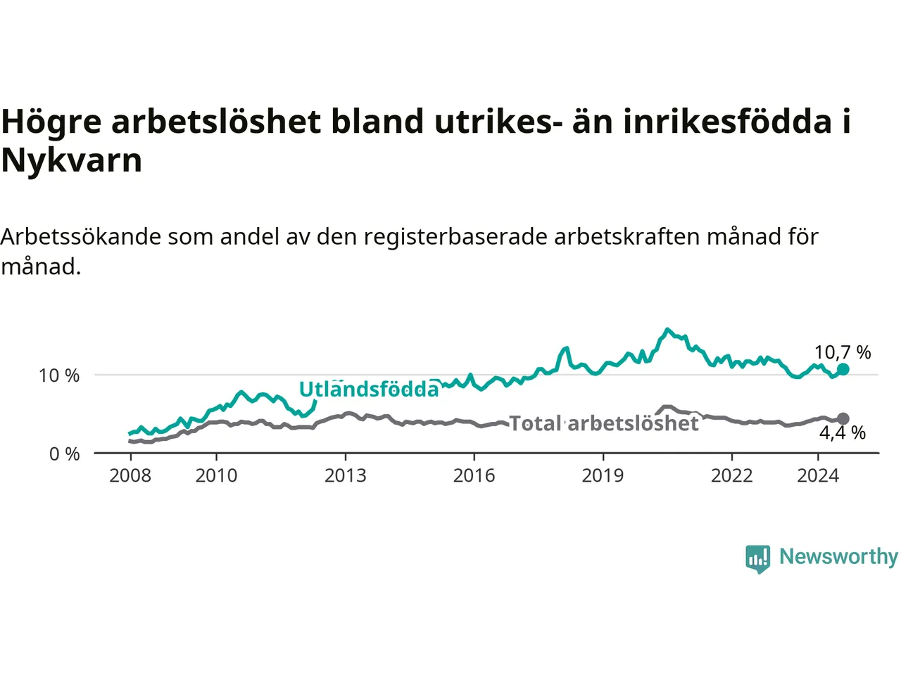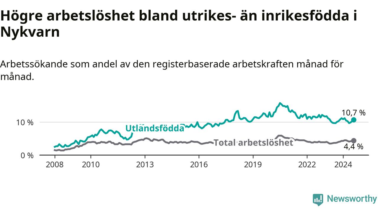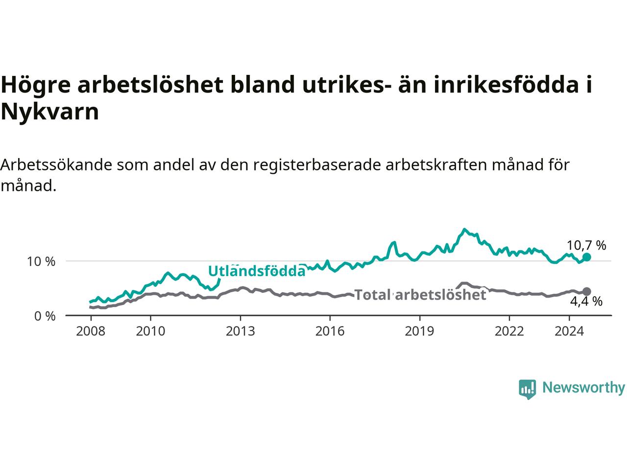 Arbetslösheten bland utlandsfödda var 10,7 procent i Nykvarn under augusti månad, motsvarande 118 av 1 103 personer. Det är 1,0 procentenheter fler än vid samma tidpunkt i fjol (+29 om man räknar personer).