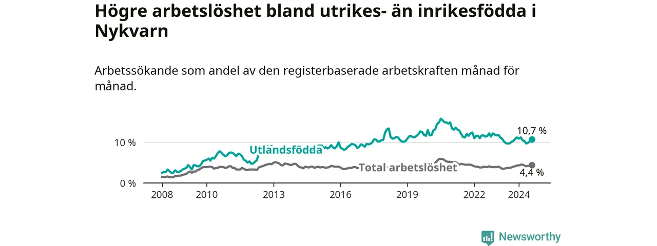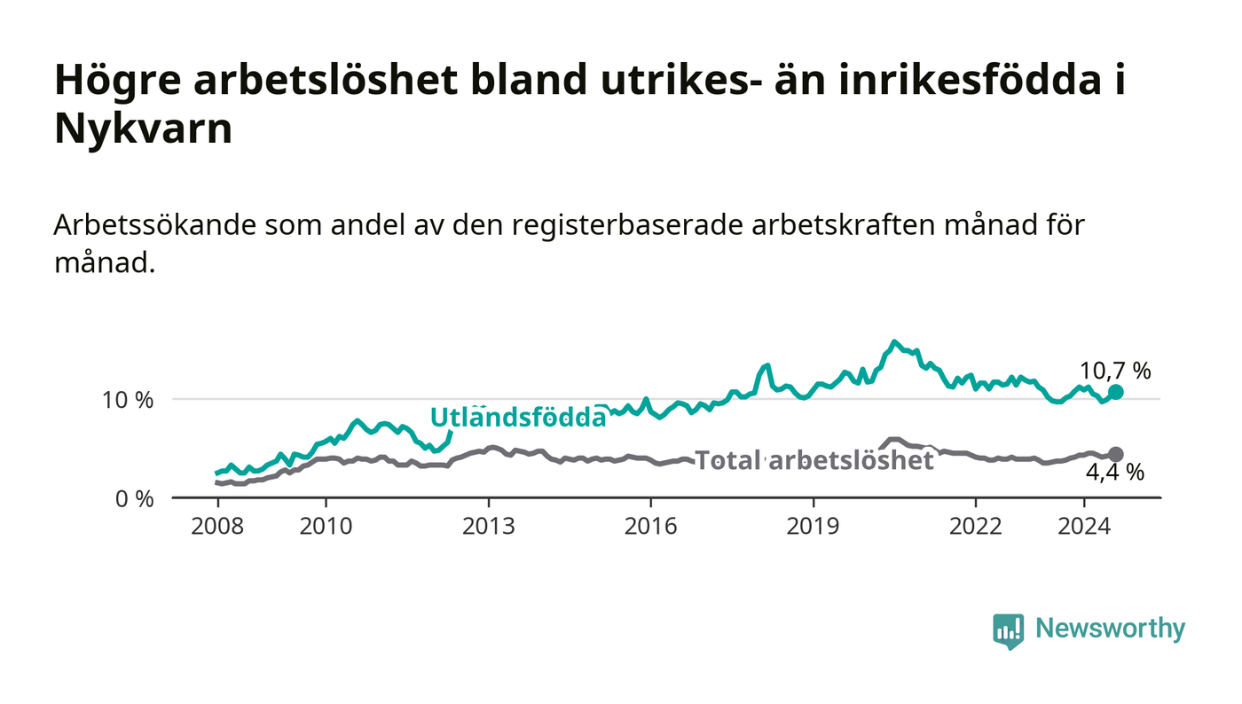 Skillnaden i arbetslöshet mellan utrikesfödda och hela befolkningen är 6,3 procentenheter i Nykvarn.