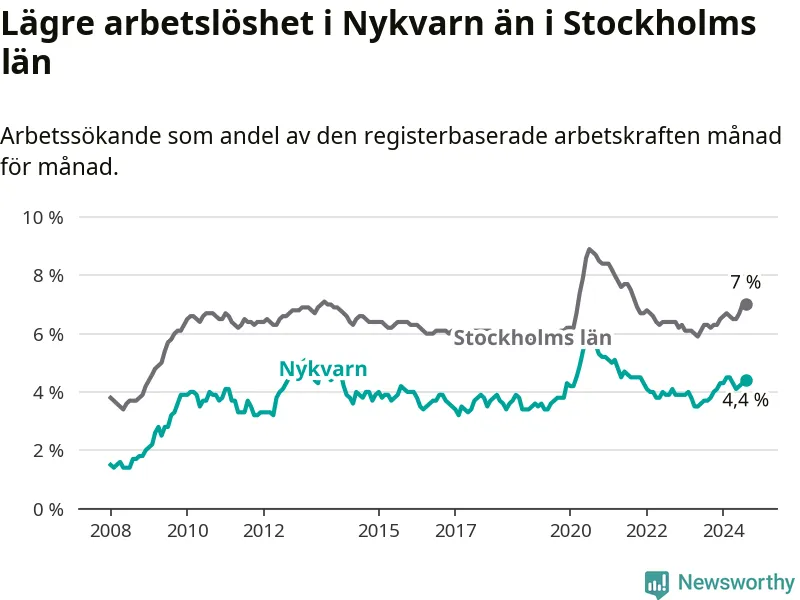 Under augusti månad rapporterade Nykvarns kommun en total arbetslöshet på 4,4 procent. Det är en ökning jämfört med samma tidpunkt i fjol (+0,7 procentenheter). Även i Stockholms län stiger arbetslösheten .