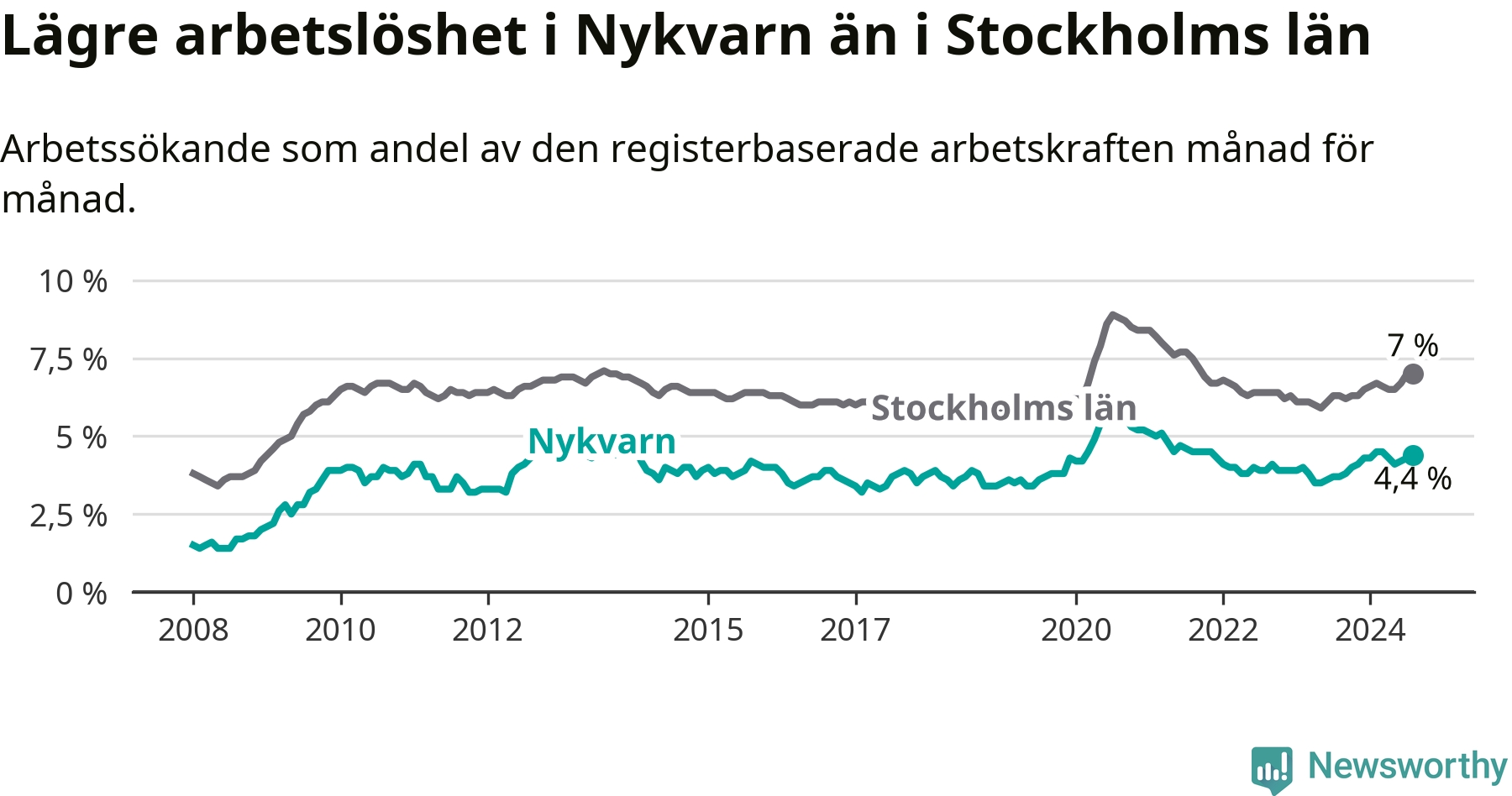 Även om arbetslösheten i Nykvarn alltså ökar, så ligger den fortfarande under snittet i hela Stockholms län (4,4 procent i kommunen, jämfört med 7,0 procent i hela länet). Ekerö har den lägsta arbetslösheten i länet (3,4 procent), medan Södertälje har den högsta (11,1 procent). För att Nykvarn skulle komma ner i samma arbetslöshetsnivå som Ekerö skulle 64 personer behöva sysselsättas.