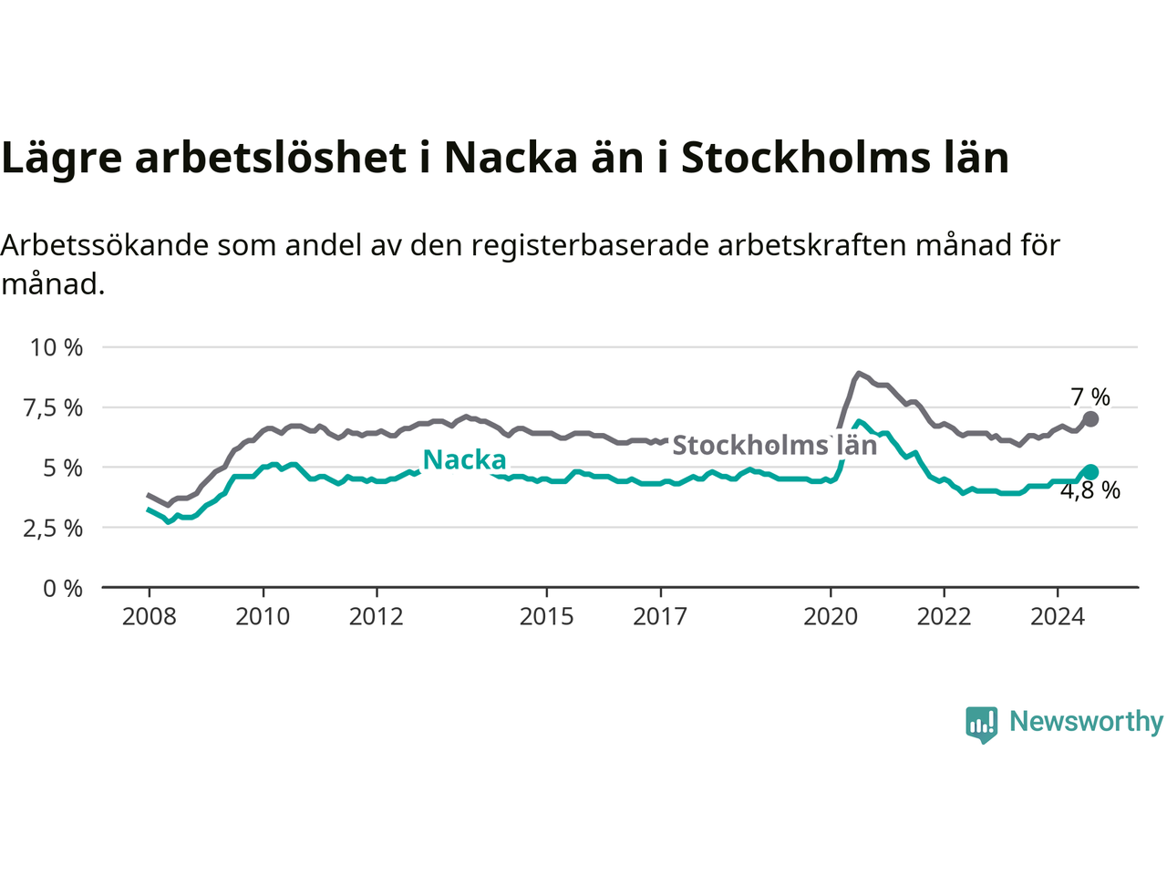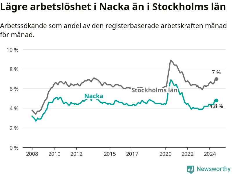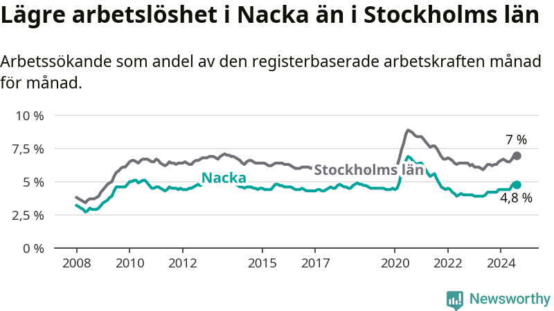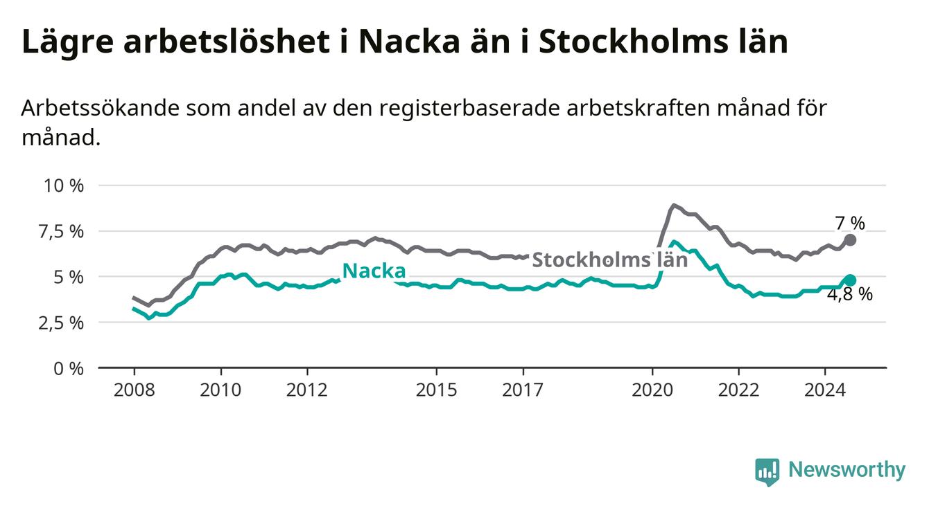 Även om arbetslösheten i Nacka alltså ökar, så ligger den fortfarande under snittet i hela Stockholms län (4,8 procent i kommunen, jämfört med 7,0 procent i hela länet). Ekerö har den lägsta arbetslösheten i länet (3,4 procent), medan Södertälje har den högsta (11,1 procent). För att Nacka skulle komma ner i samma arbetslöshetsnivå som Ekerö skulle 786 personer behöva sysselsättas.