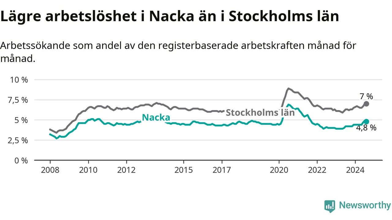 Under augusti månad rapporterade Nacka kommun en total arbetslöshet på 4,8 procent. Det är en ökning jämfört med samma tidpunkt i fjol (+0,6 procentenheter). Även i Stockholms län stiger arbetslösheten .