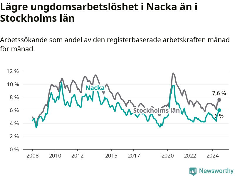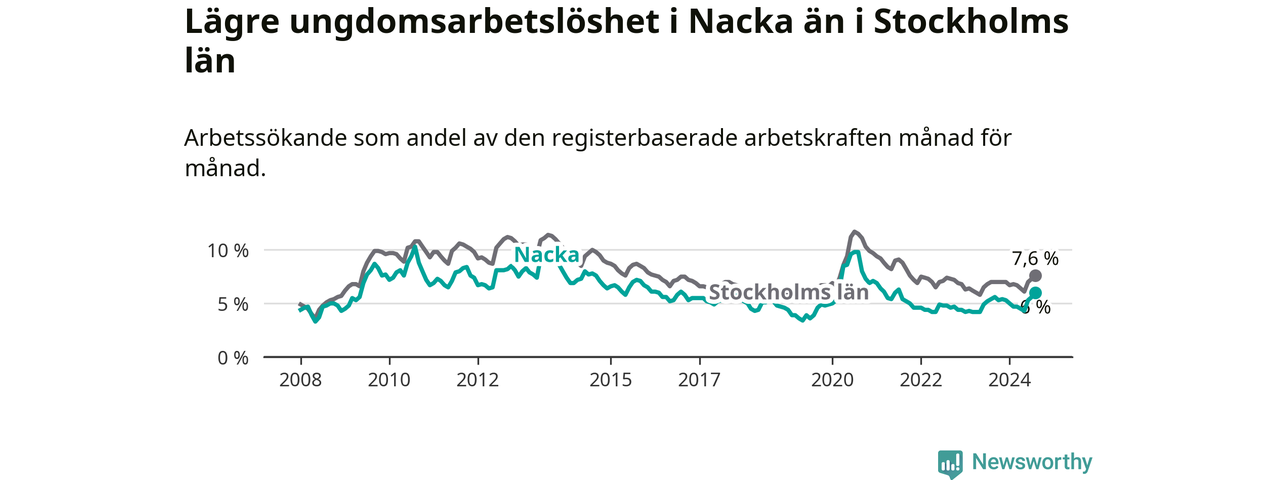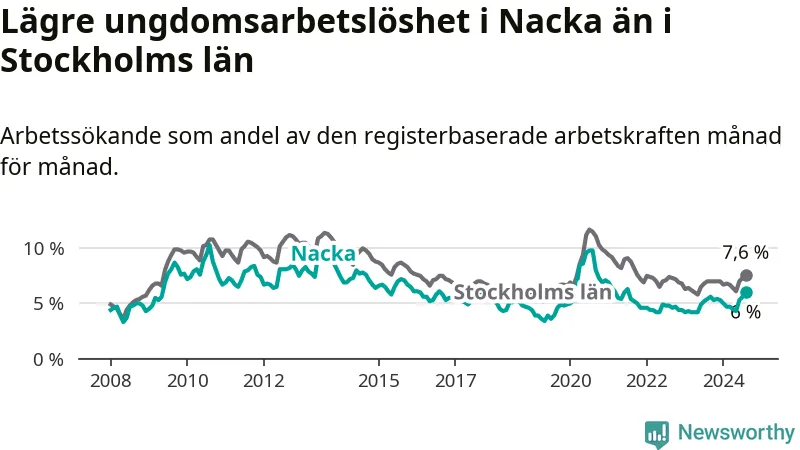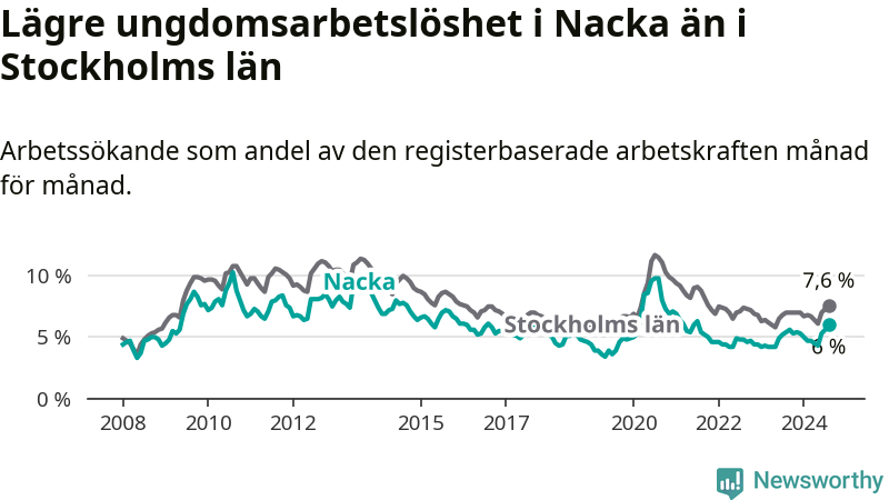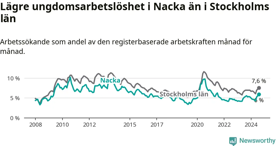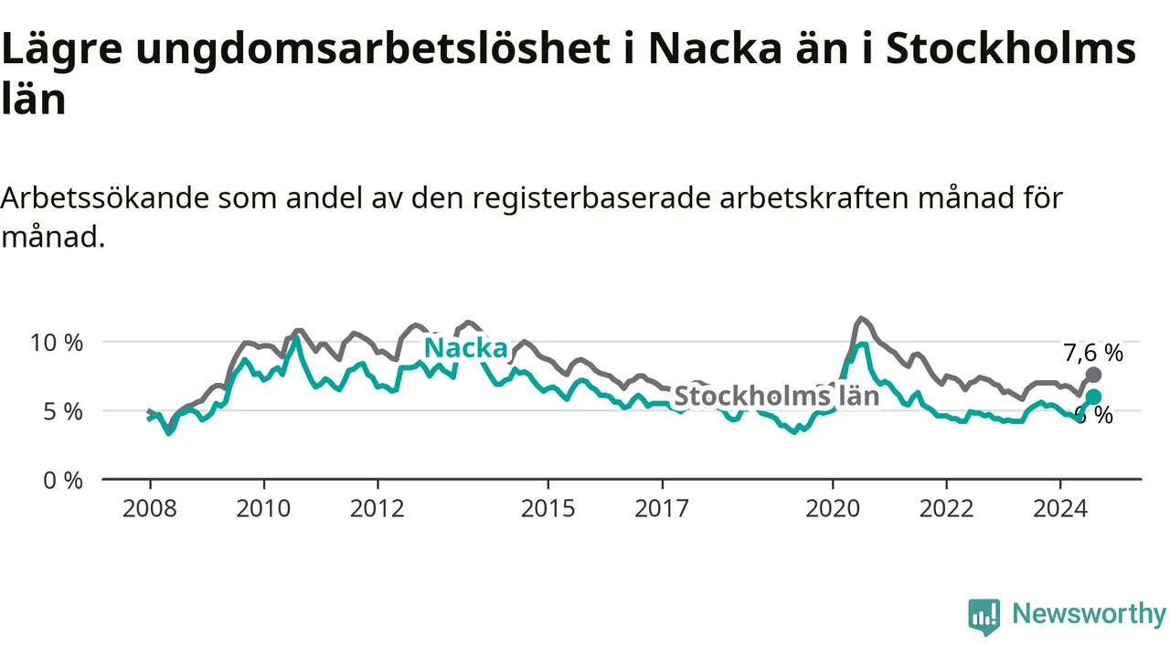 Precis som den totala arbetslösheten ligger ungdomsarbetslösheten i Nacka lägre än i Stockholms län som helhet. Skillnaden mellan kommunen och länet är 1,6 procentenheter.
