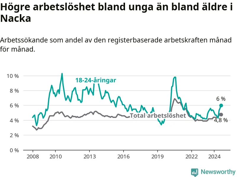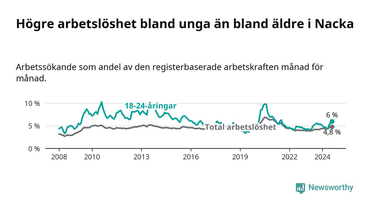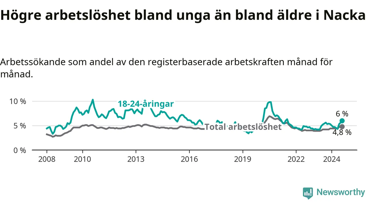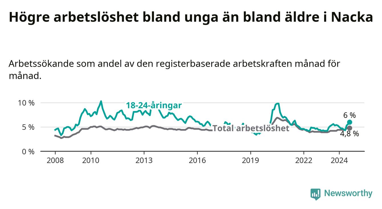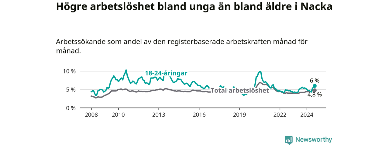 I och med den senaste månadens uppgång har de ungas arbetslöshet i Nacka stigit 14 månader i följd (upp från 4,9 procent i juni 2023 till 6,0 procent nu). Den nuvarande arbetslöshetsnivån är den högsta sedan juli 2021.