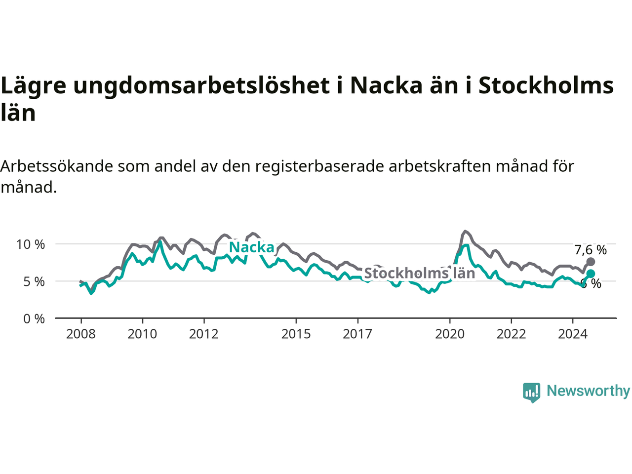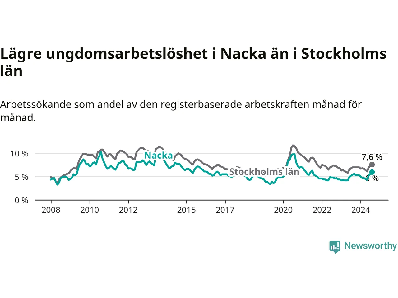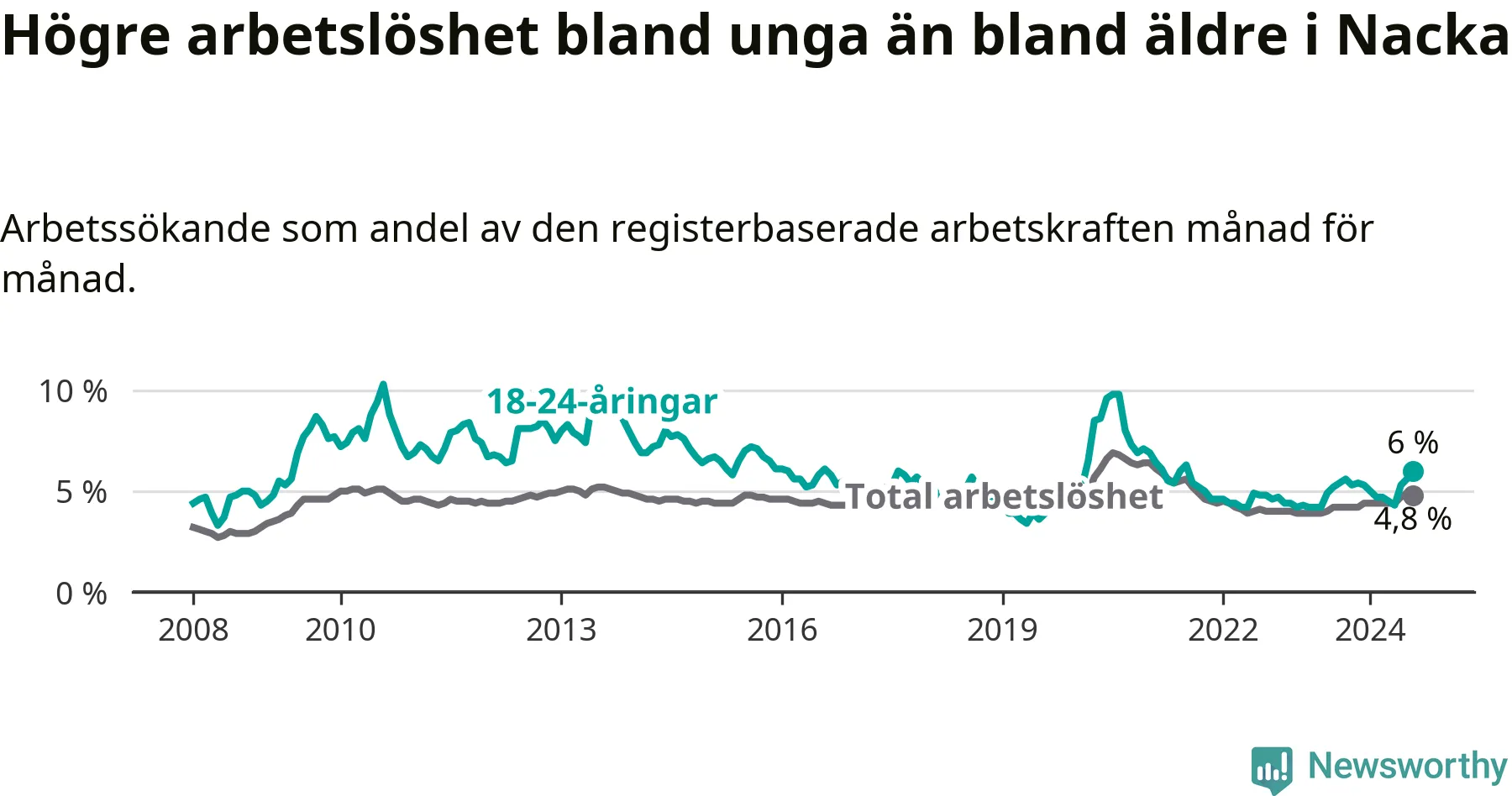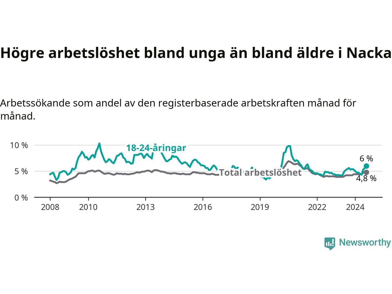I och med den senaste månadens uppgång har de ungas arbetslöshet i Nacka stigit 14 månader i följd (upp från 4,9 procent i juni 2023 till 6,0 procent nu). Den nuvarande arbetslöshetsnivån är den högsta sedan juli 2021.